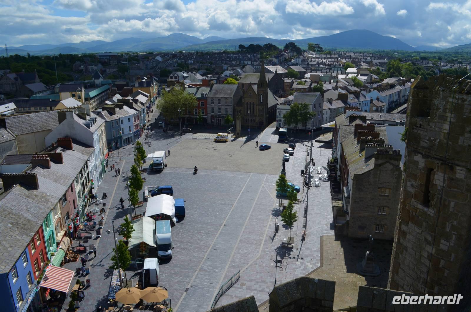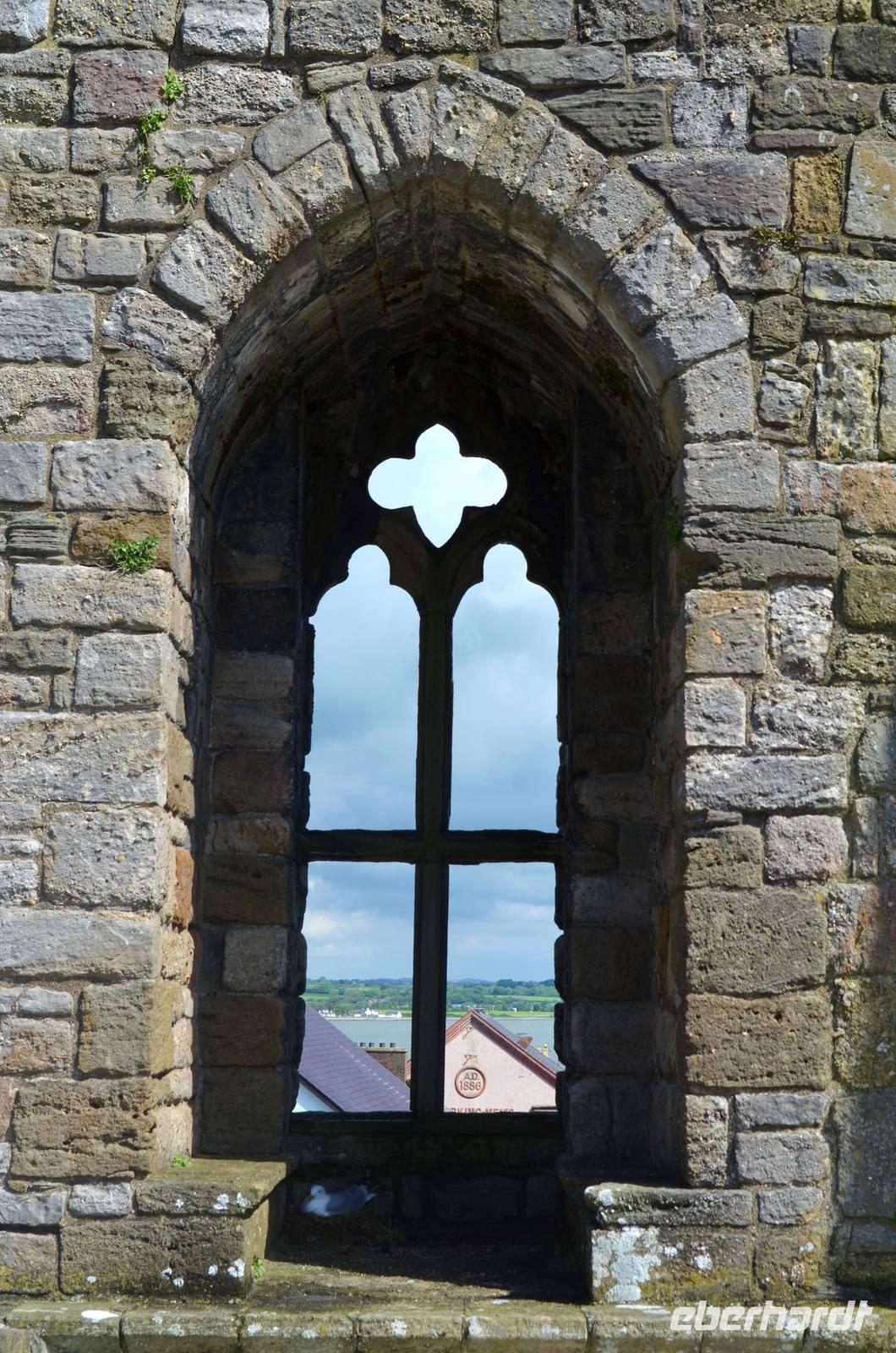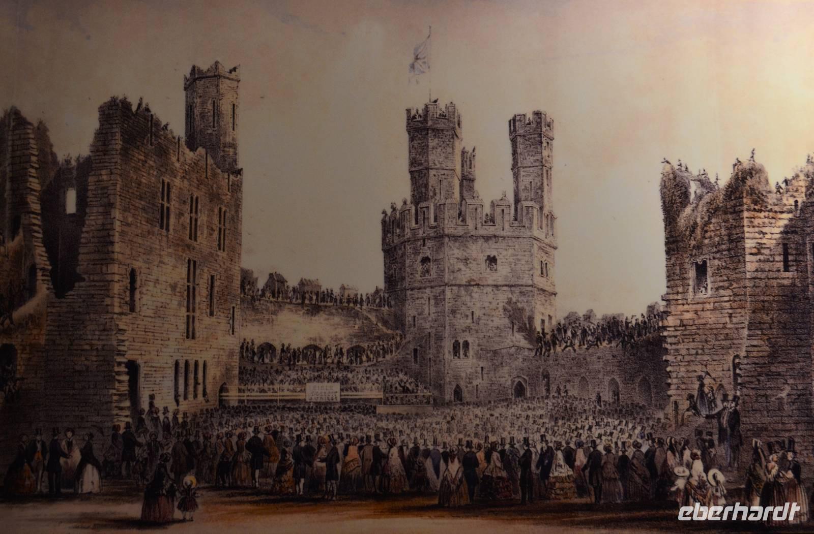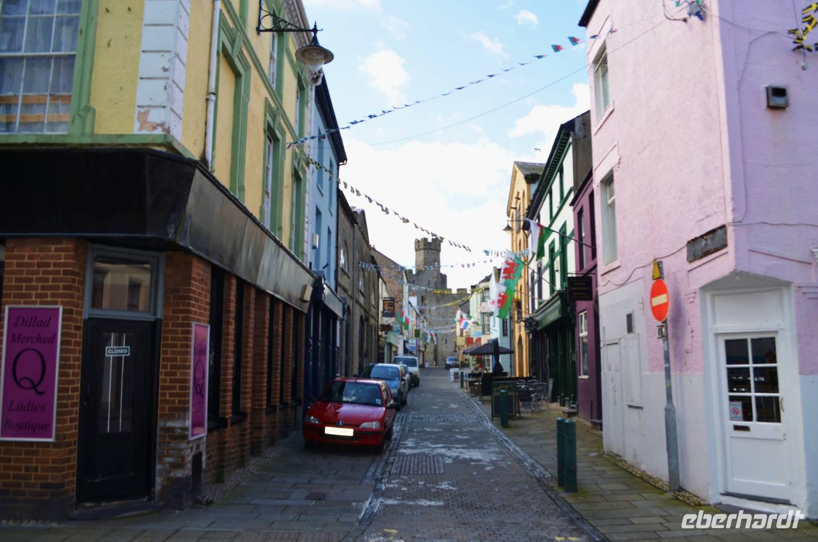Insel Anglesey. Wir fahren über Telford's Menai Bridge nach Llanfairpwllgwyngyllgogerychwyrndrobwllllantysiliogogogoch, dem Ort mit dem längsten Namen der Welt, den uns die nette Dame vom Visitor Center gern mehrmals wiederholend aufsagt. Über die Britannia Bridge fahren wir anschließend nach Caernarfon. Hier gehen wir gemeinsam durch das Stadttor hinein in die Stadt und hinüber zu den hohen Mauern der mächtigen Burg. Wir besichtigen diese gewaltige Anlage, mit ihren Ausstellungen in den verschiedenen Türmen und Gebäuden. Die schwarzen, rund angeordnete