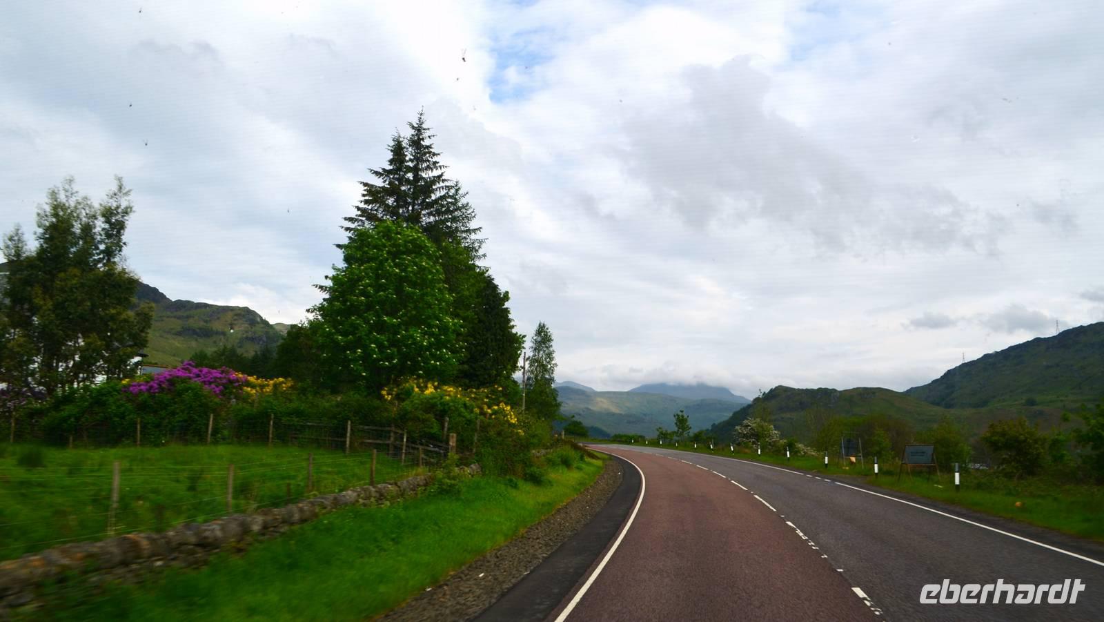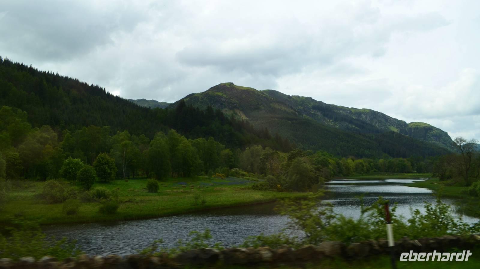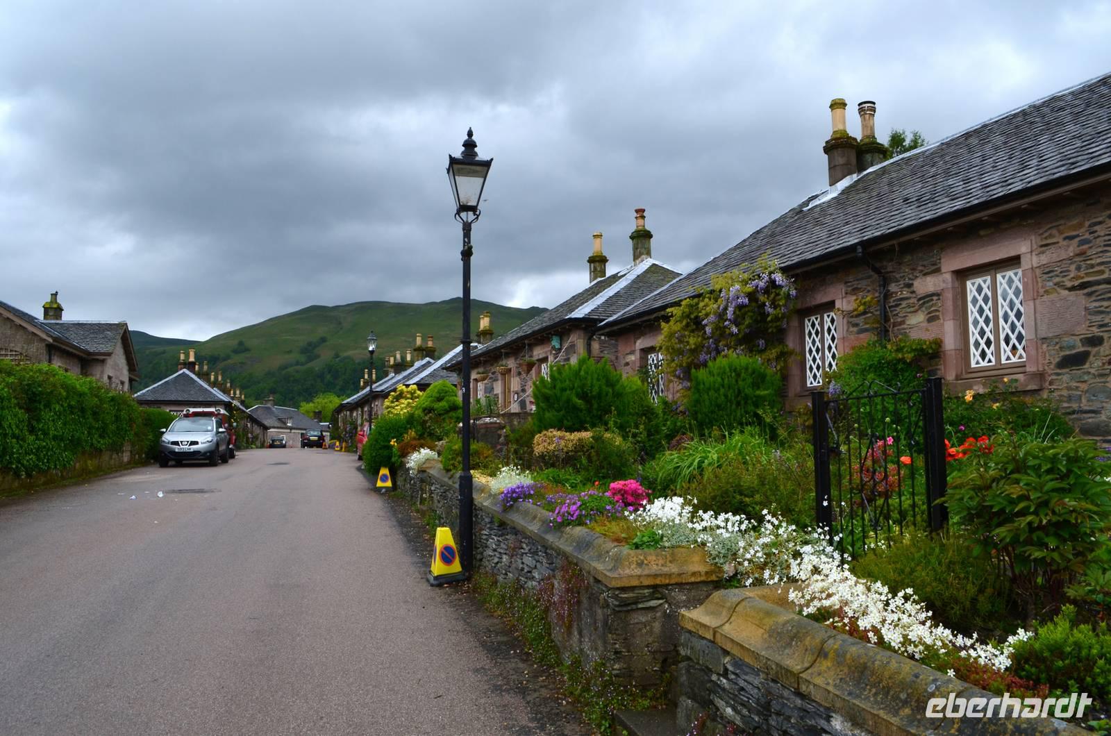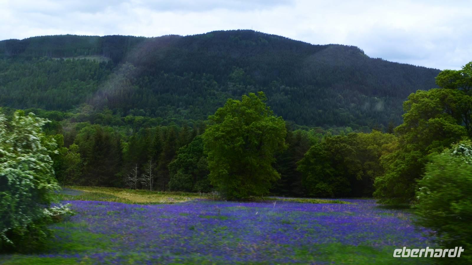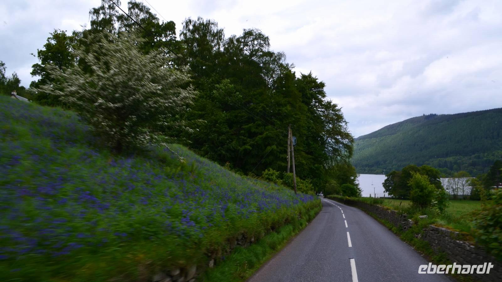 Das Frühstück hat geschmeckt, das Wetter ist noch etwas trübe. Wir fahren zum Loch Lomond und halten zum Fotostopp in Luss. Ein gemeinsamer Spaziergang führt uns zum See und am Strand entlang zur kleinen Seebrücke, weiter durch die hübschen Häuschen mit ihren blühenden Vorgärten zurück zum Parkplatz. Oberhalb, am Hang der Berge erstrahlen ganze Wiesen im Blau der Blauglöckchen. Am See entlang geht die Fahrt weiter. Zahlreiche Fotostopps machen wir an schönen Aussichten, wunderschönen Blicken in die Berge und Täler der Trossachs und der Highlands.