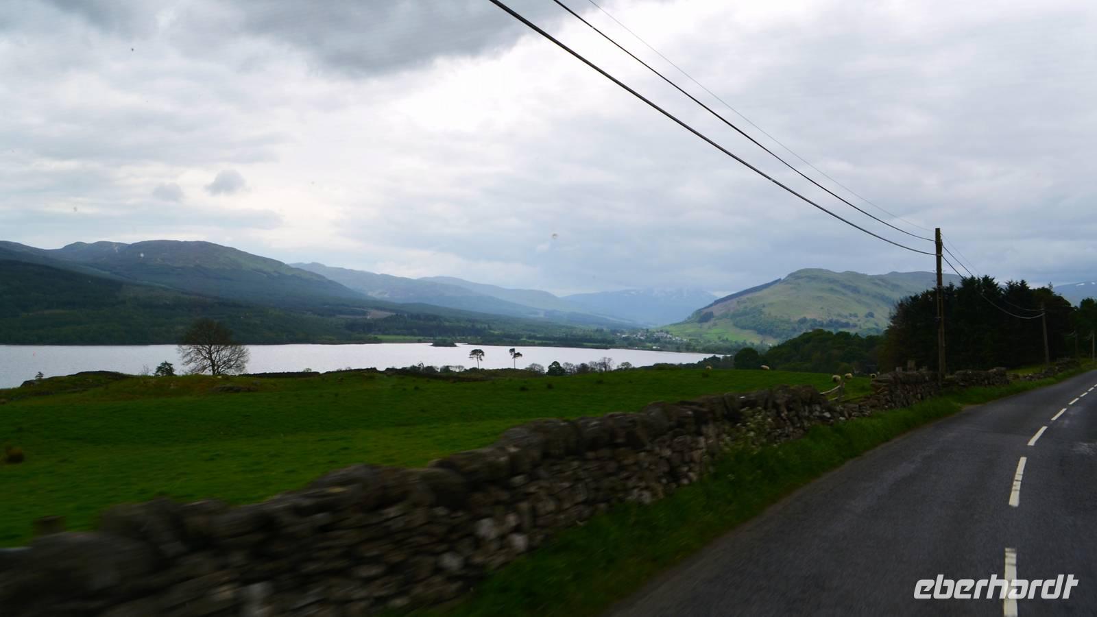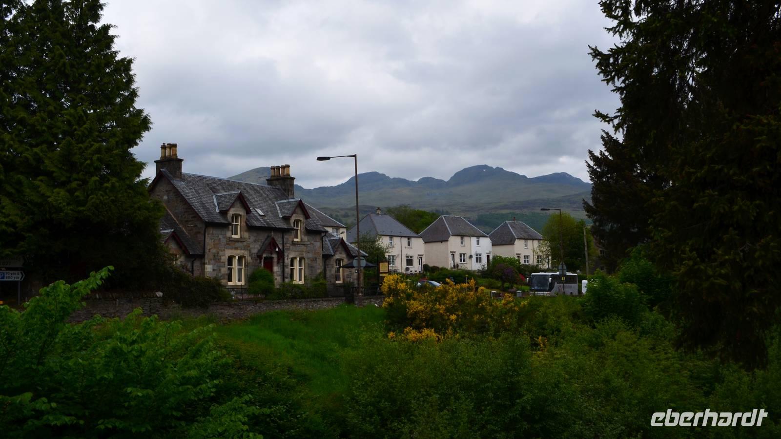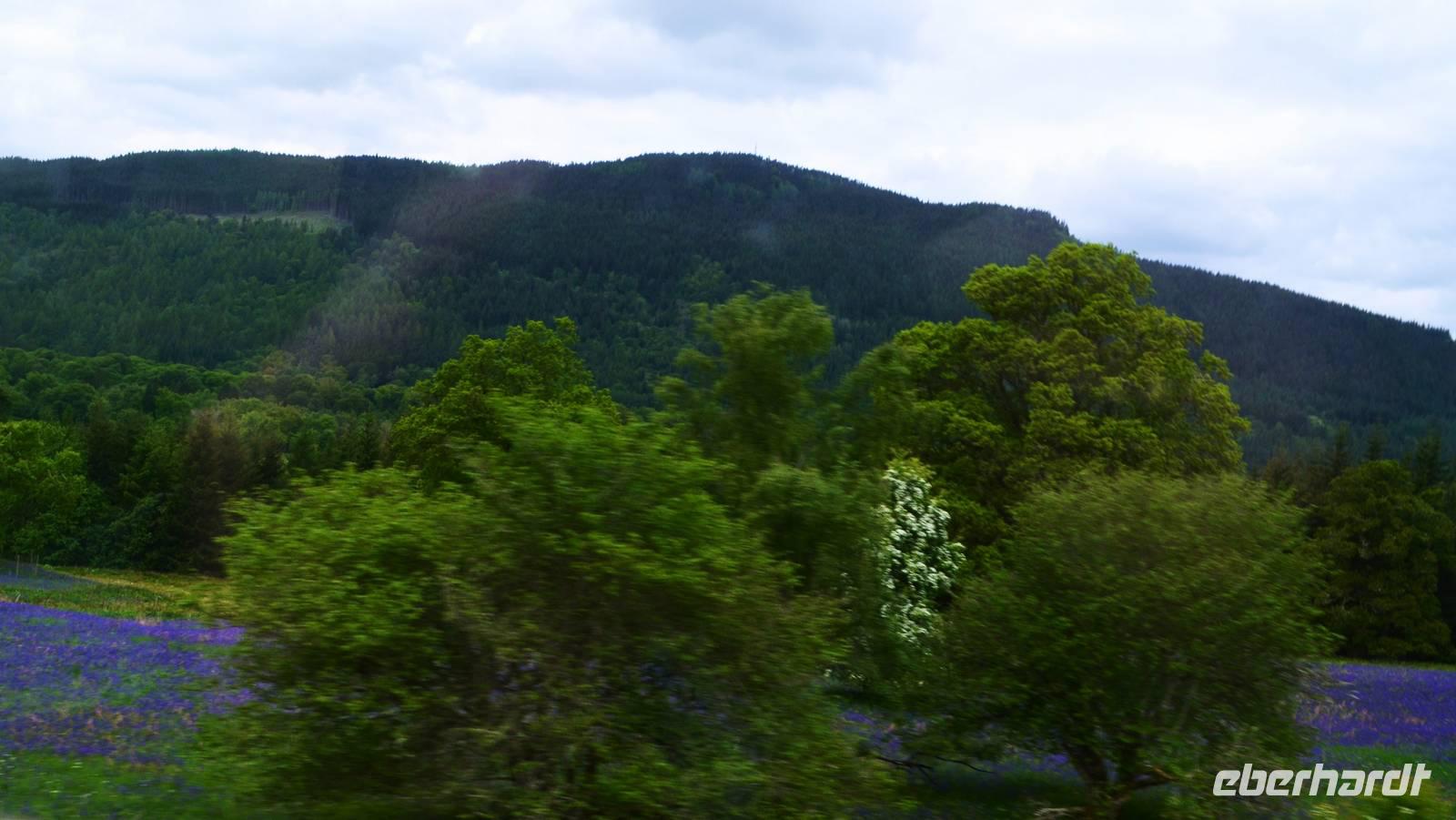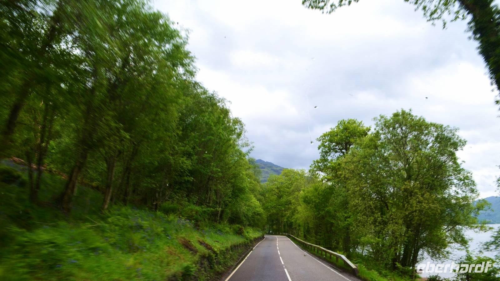 Das Frühstück hat geschmeckt, das Wetter ist noch etwas trübe. Wir fahren zum Loch Lomond und halten zum Fotostopp in Luss. Ein gemeinsamer Spaziergang führt uns zum See und am Strand entlang zur kleinen Seebrücke, weiter durch die hübschen Häuschen mit ihren blühenden Vorgärten zurück zum Parkplatz. Oberhalb, am Hang der Berge erstrahlen ganze Wiesen im Blau der Blauglöckchen. Am See entlang geht die Fahrt weiter. Zahlreiche Fotostopps machen wir an schönen Aussichten, wunderschönen Blicken in die Berge und Täler der Trossachs und der Highlands.