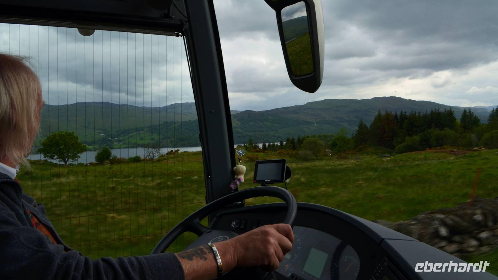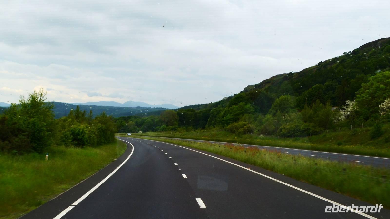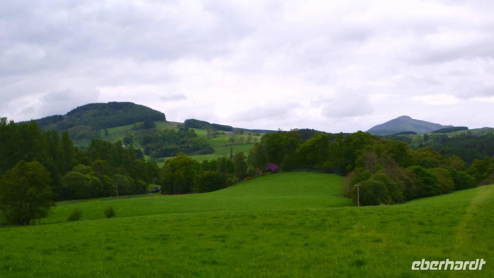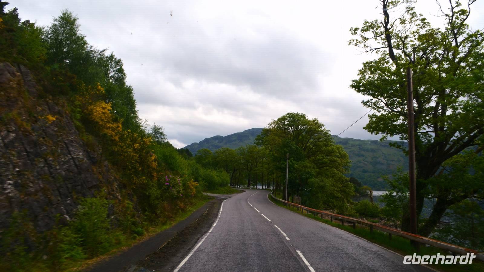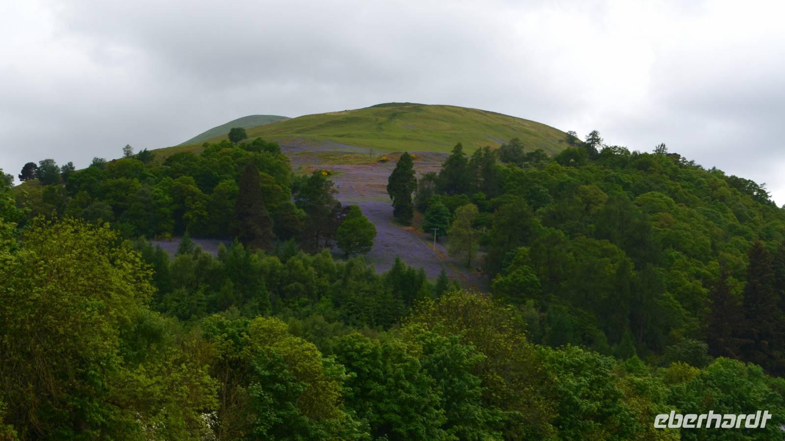 Das Frühstück hat geschmeckt, das Wetter ist noch etwas trübe. Wir fahren zum Loch Lomond und halten zum Fotostopp in Luss. Ein gemeinsamer Spaziergang führt uns zum See und am Strand entlang zur kleinen Seebrücke, weiter durch die hübschen Häuschen mit ihren blühenden Vorgärten zurück zum Parkplatz. Oberhalb, am Hang der Berge erstrahlen ganze Wiesen im Blau der Blauglöckchen. Am See entlang geht die Fahrt weiter. Zahlreiche Fotostopps machen wir an schönen Aussichten, wunderschönen Blicken in die Berge und Täler der Trossachs und der Highlands.