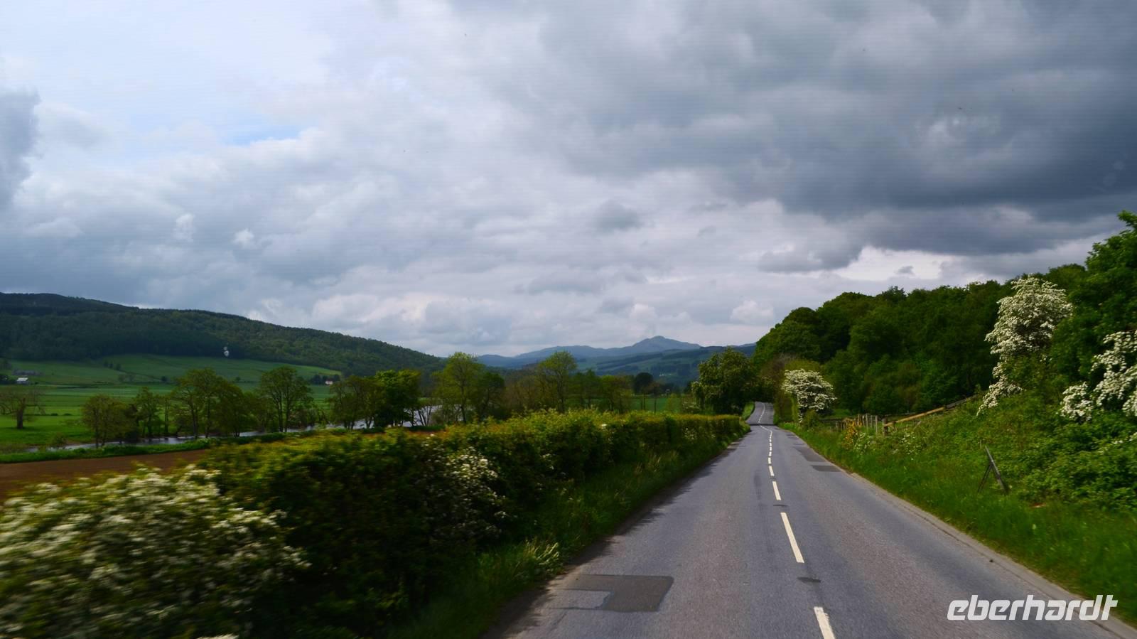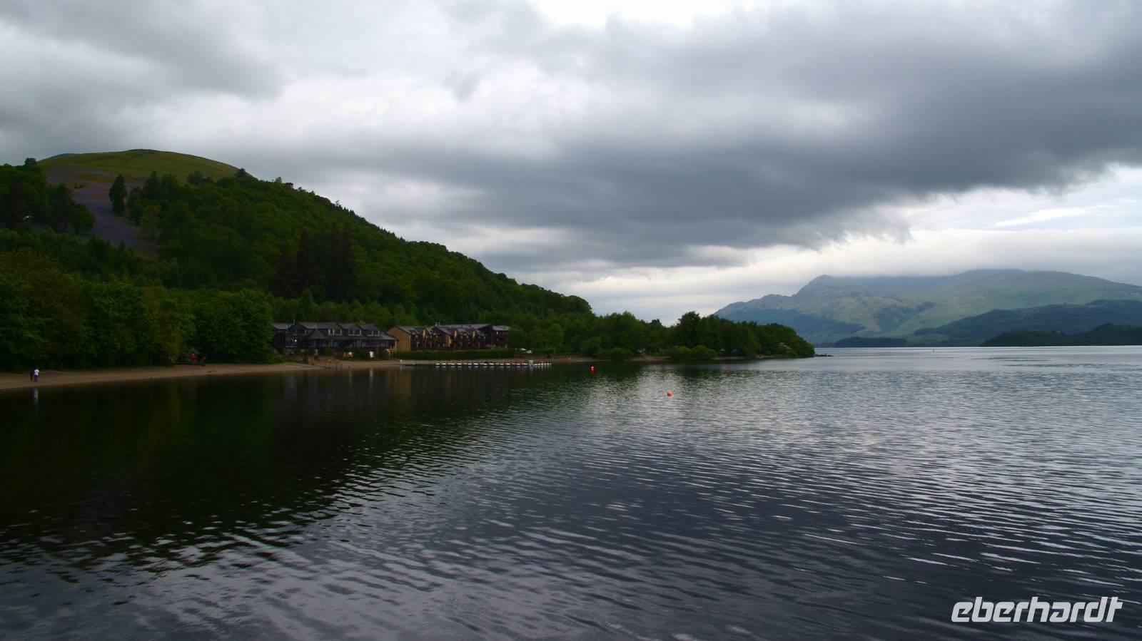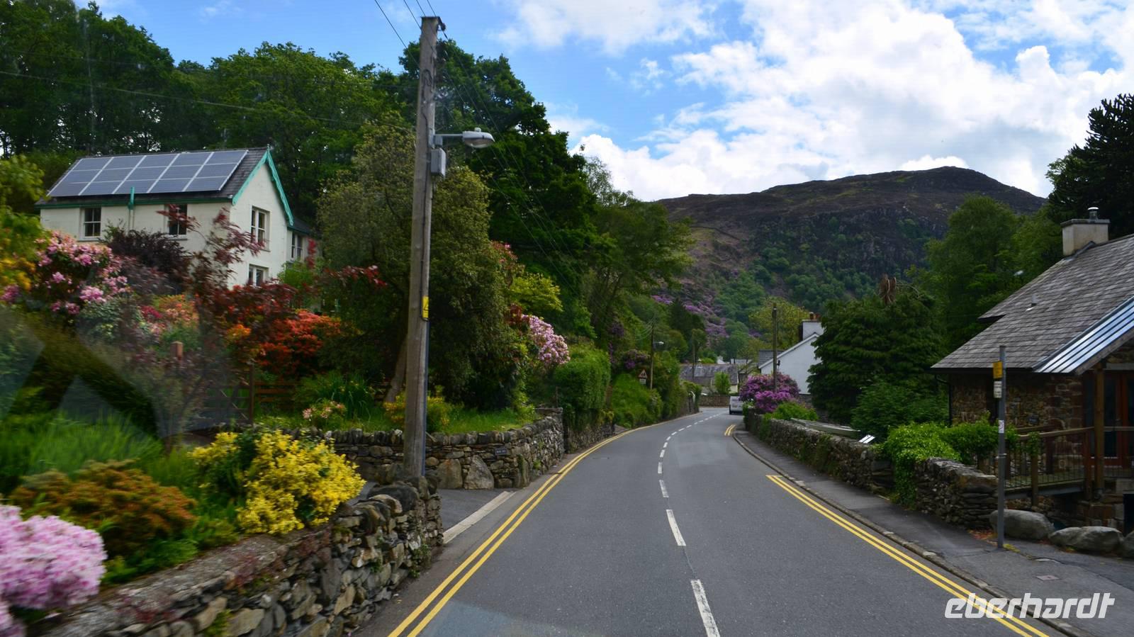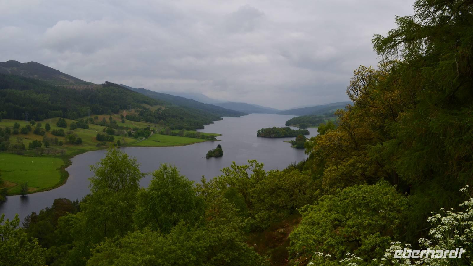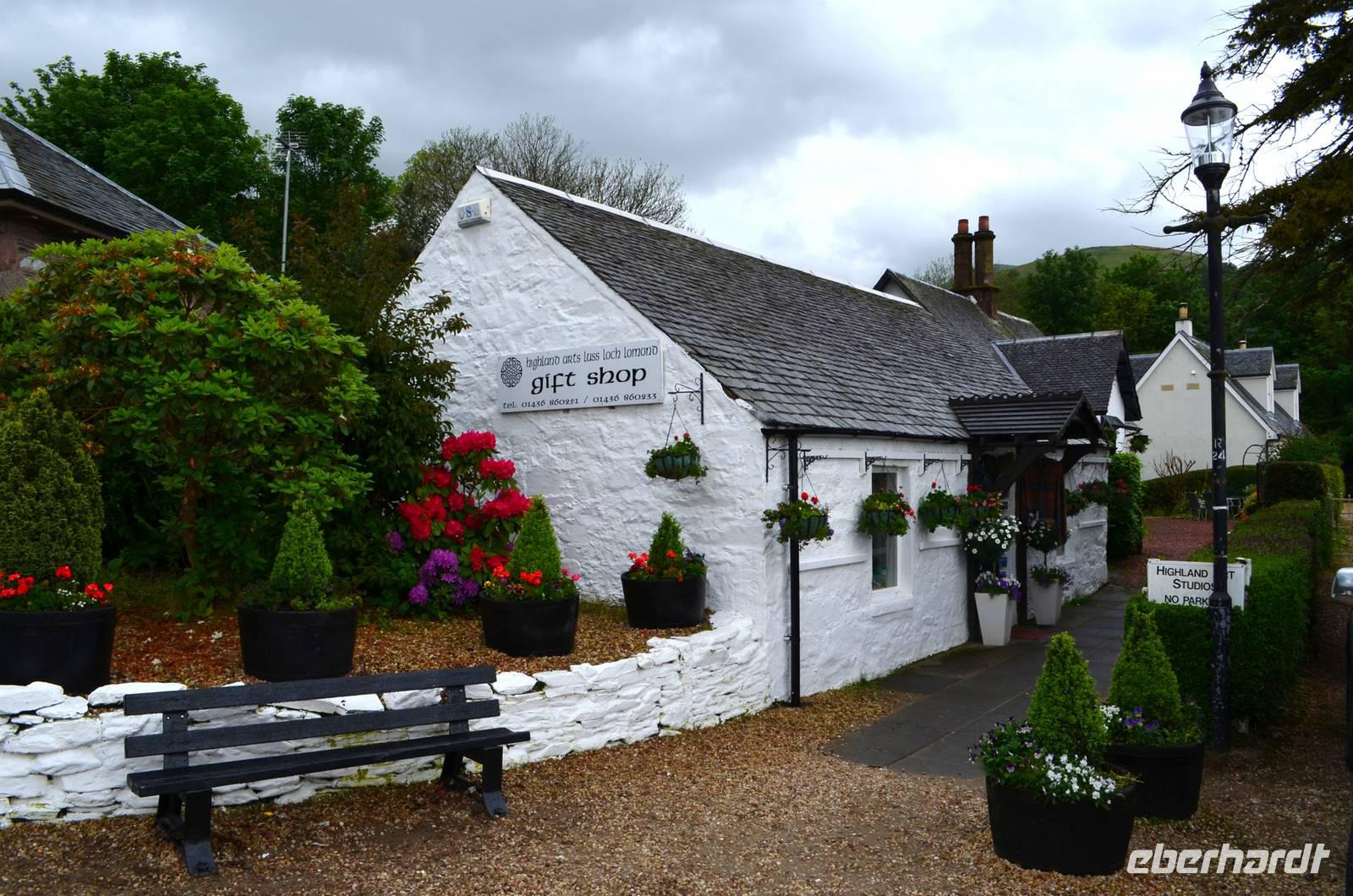 Das Frühstück hat geschmeckt, das Wetter ist noch etwas trübe. Wir fahren zum Loch Lomond und halten zum Fotostopp in Luss. Ein gemeinsamer Spaziergang führt uns zum See und am Strand entlang zur kleinen Seebrücke, weiter durch die hübschen Häuschen mit ihren blühenden Vorgärten zurück zum Parkplatz. Oberhalb, am Hang der Berge erstrahlen ganze Wiesen im Blau der Blauglöckchen. Am See entlang geht die Fahrt weiter. Zahlreiche Fotostopps machen wir an schönen Aussichten, wunderschönen Blicken in die Berge und Täler der Trossachs und der Highlands.