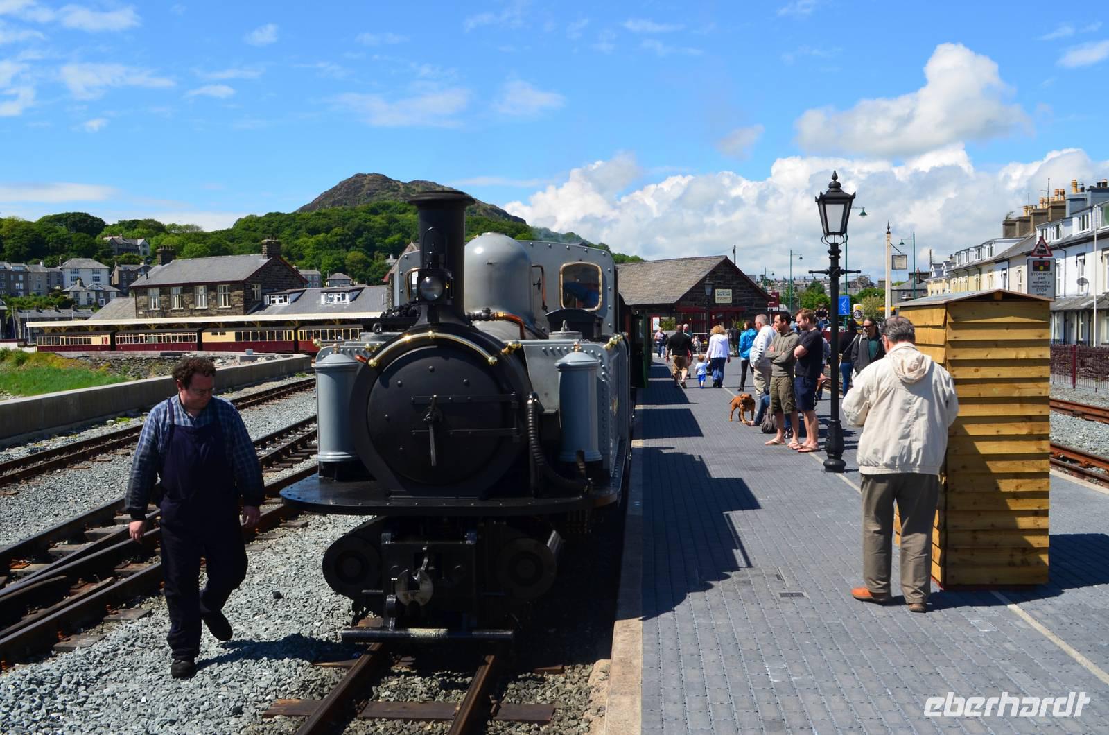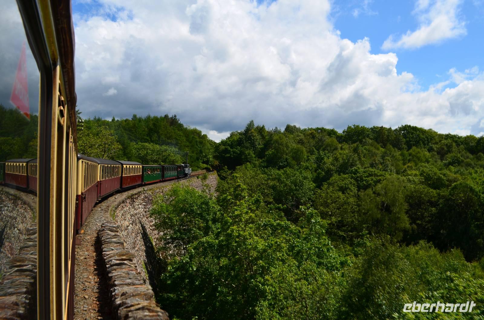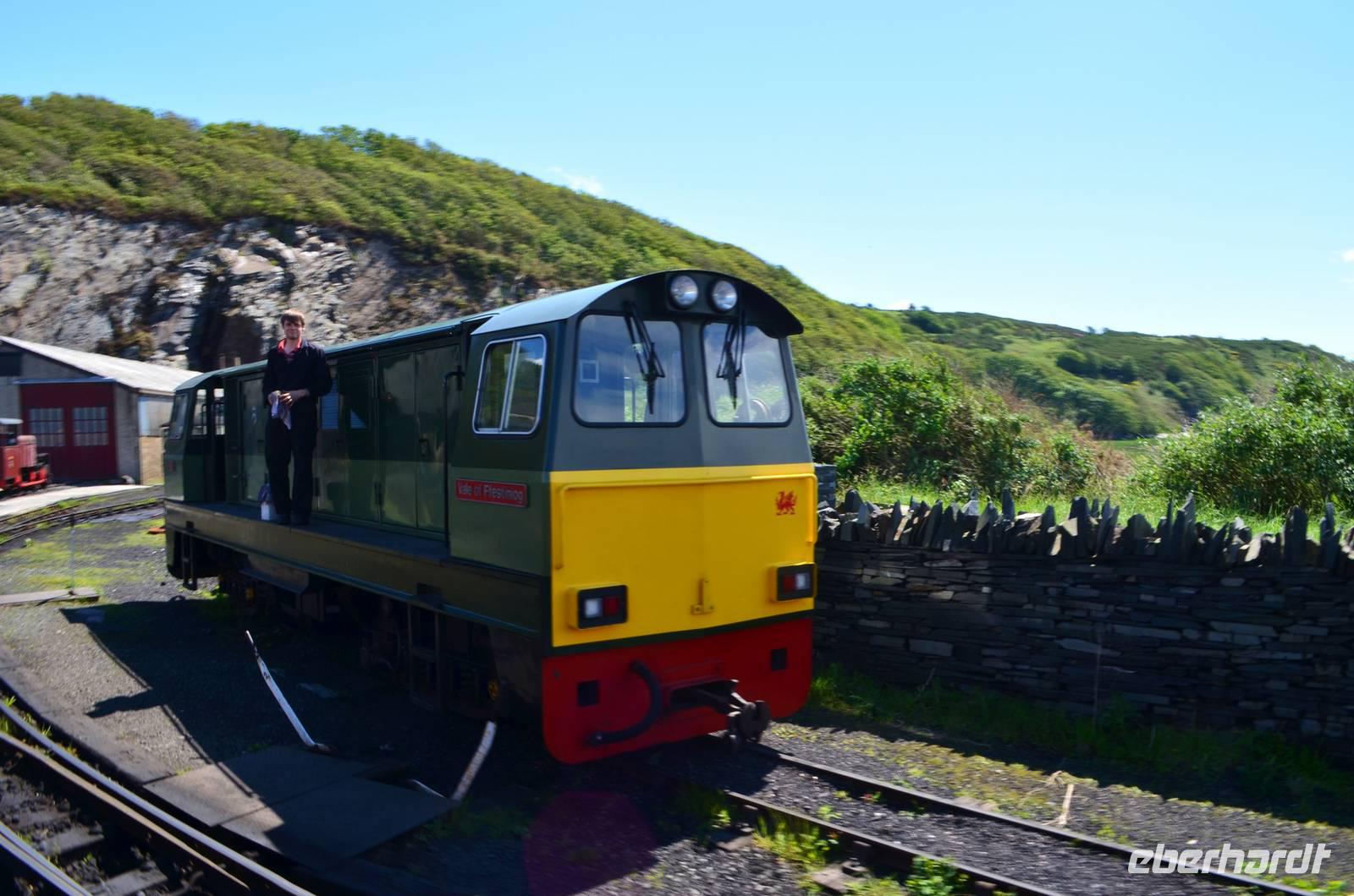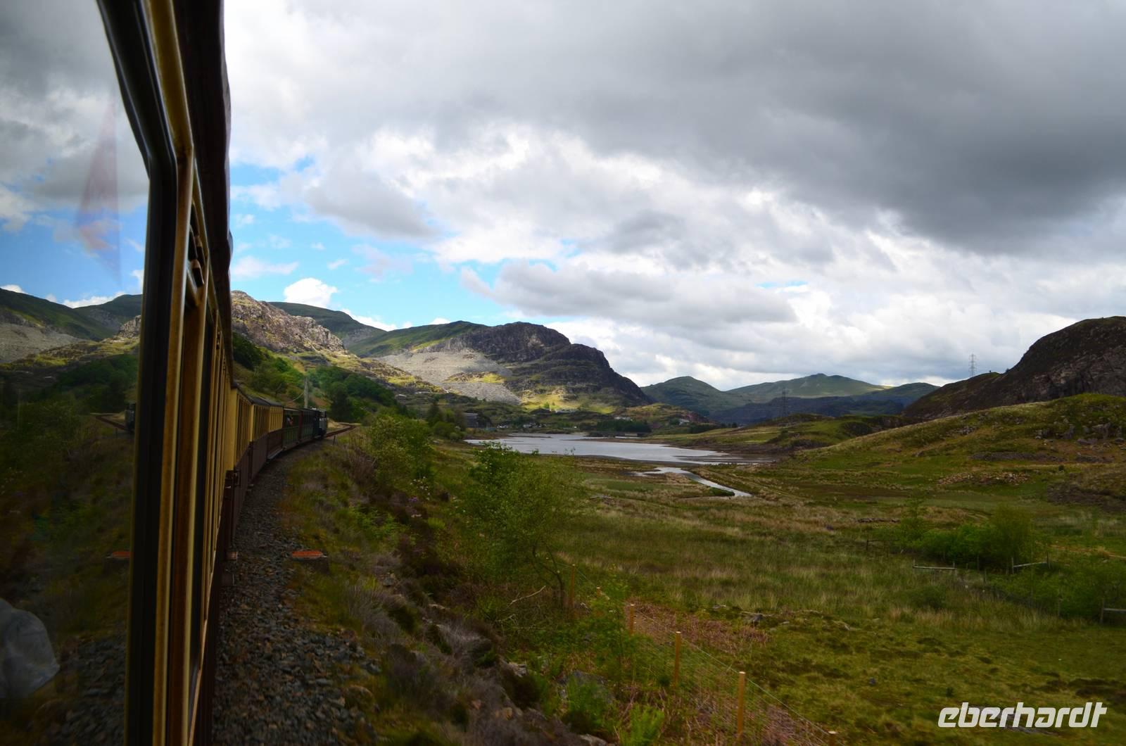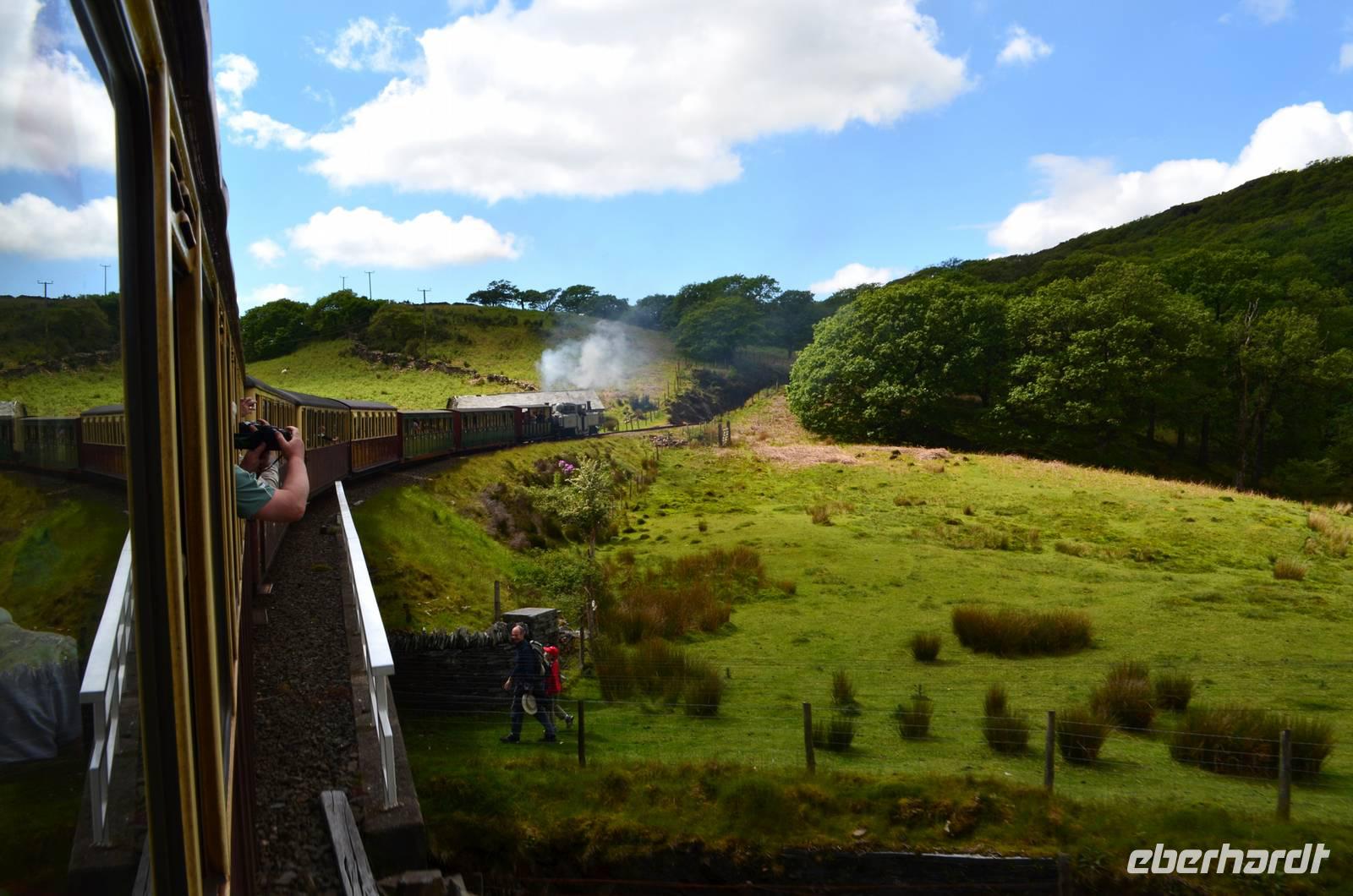 Steinplatten in der Mitte des Rasens im Schlosshof waren die Bühne für die Krönung von Charles zum Prince of Wales im Jahre 1969. 11:30 Uhr beginnt unsere Panoramafahrt durch den Snowdon Nationalpark, weiter Richtung Porthmadog. Die landschaftlich sehr schöne Fahrt führt uns vorbei am Snowdon Mountain und am Lynn Gwellyn, schließlich weiter bis Beddgelert. Die Legende vom begrabenen Hund Gelert zieht uns kurz in ihren Bann. In Porthmadog angekommen, steigen wir in die Kleinbahn um. Für die Gruppe ist ein ganzer Wagen reserviert, Nr. 110. Wir haben noch ausreichend Zeit für Fotos und schauen zu wie ein Zug der Welsh Highland Railway abfährt und wie Wasser und Kohlen in die Lok für unseren Zug übernommen werden. Dann startet die Fahrt nach Blaneau. Wieder geht es hinein und hinauf in die Berge. Unser Bus fährt inzwischen zum Bahnhof in Blaneau und ist da, als wir ankommen.