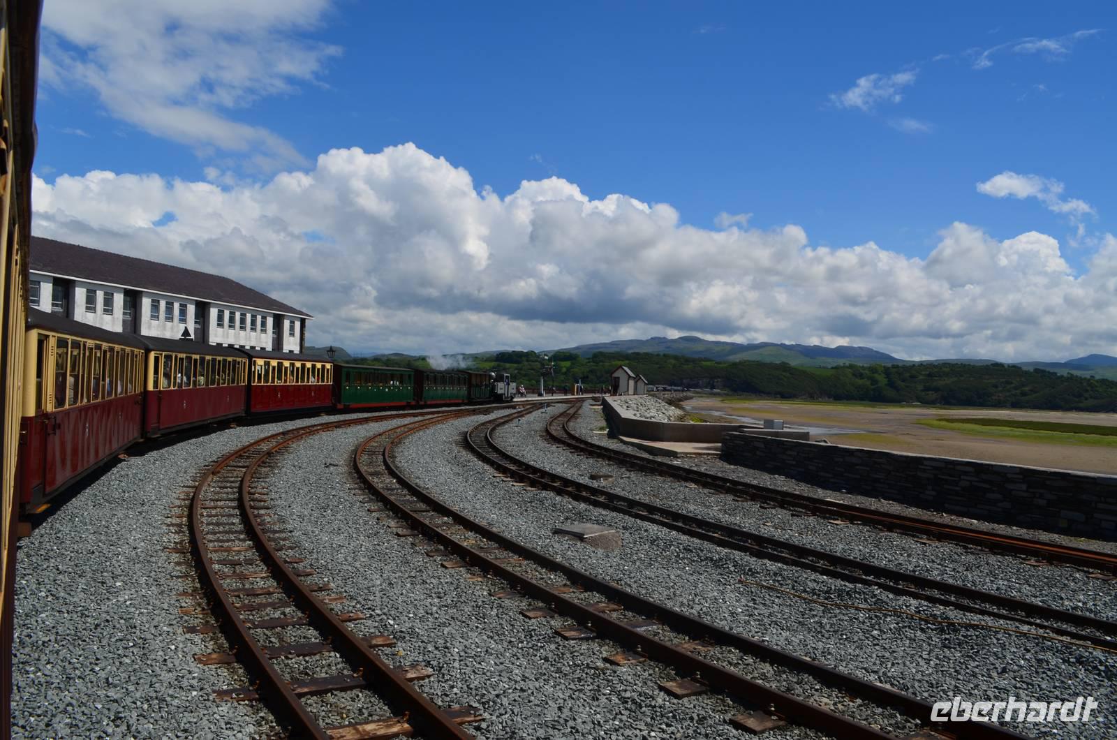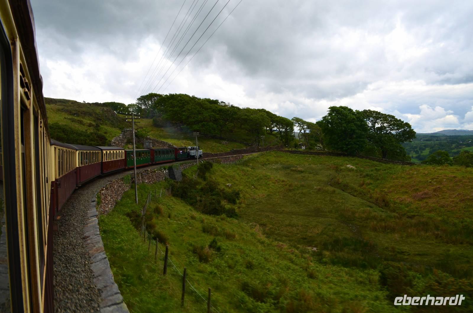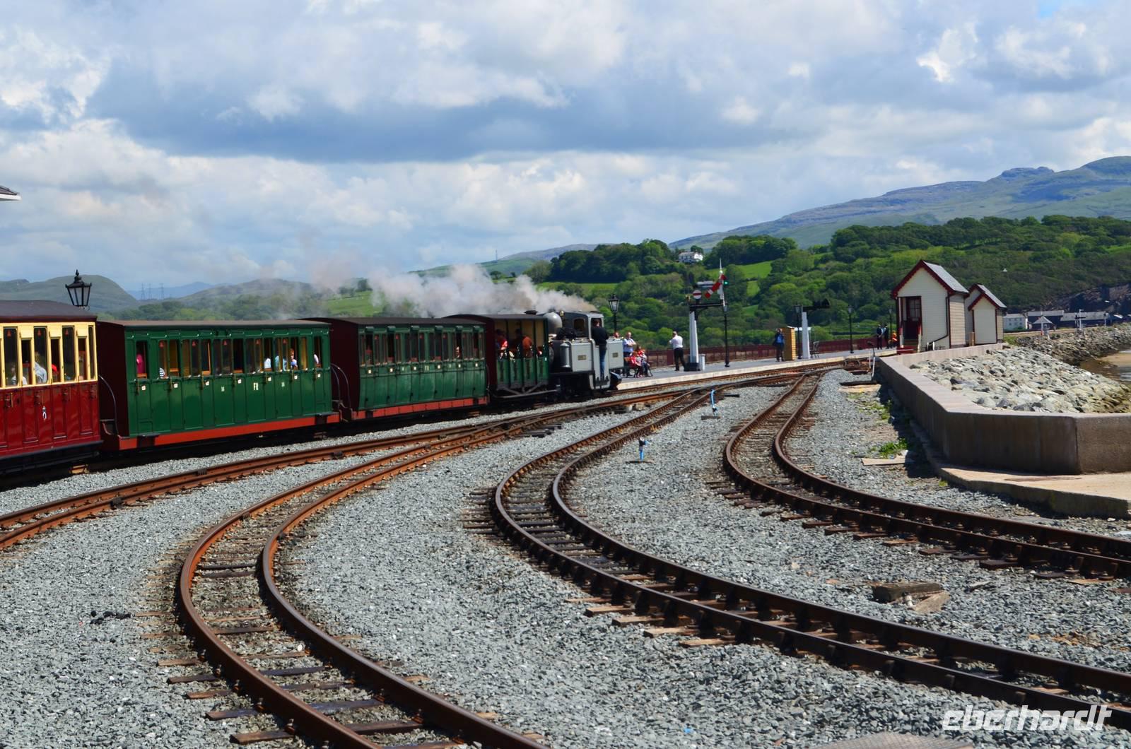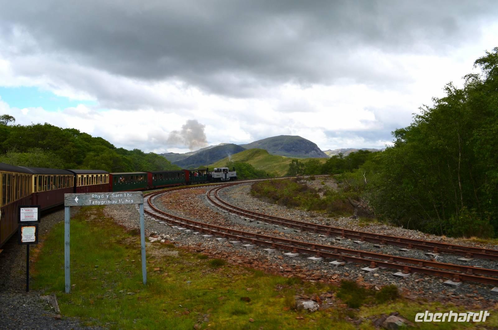 Steinplatten in der Mitte des Rasens im Schlosshof waren die Bühne für die Krönung von Charles zum Prince of Wales im Jahre 1969. 11:30 Uhr beginnt unsere Panoramafahrt durch den Snowdon Nationalpark, weiter Richtung Porthmadog. Die landschaftlich sehr schöne Fahrt führt uns vorbei am Snowdon Mountain und am Lynn Gwellyn, schließlich weiter bis Beddgelert. Die Legende vom begrabenen Hund Gelert zieht uns kurz in ihren Bann. In Porthmadog angekommen, steigen wir in die Kleinbahn um. Für die Gruppe ist ein ganzer Wagen reserviert, Nr. 110. Wir haben noch ausreichend Zeit für Fotos und schauen zu wie ein Zug der Welsh Highland Railway abfährt und wie Wasser und Kohlen in die Lok für unseren Zug übernommen werden. Dann startet die Fahrt nach Blaneau. Wieder geht es hinein und hinauf in die Berge. Unser Bus fährt inzwischen zum Bahnhof in Blaneau und ist da, als wir ankommen.