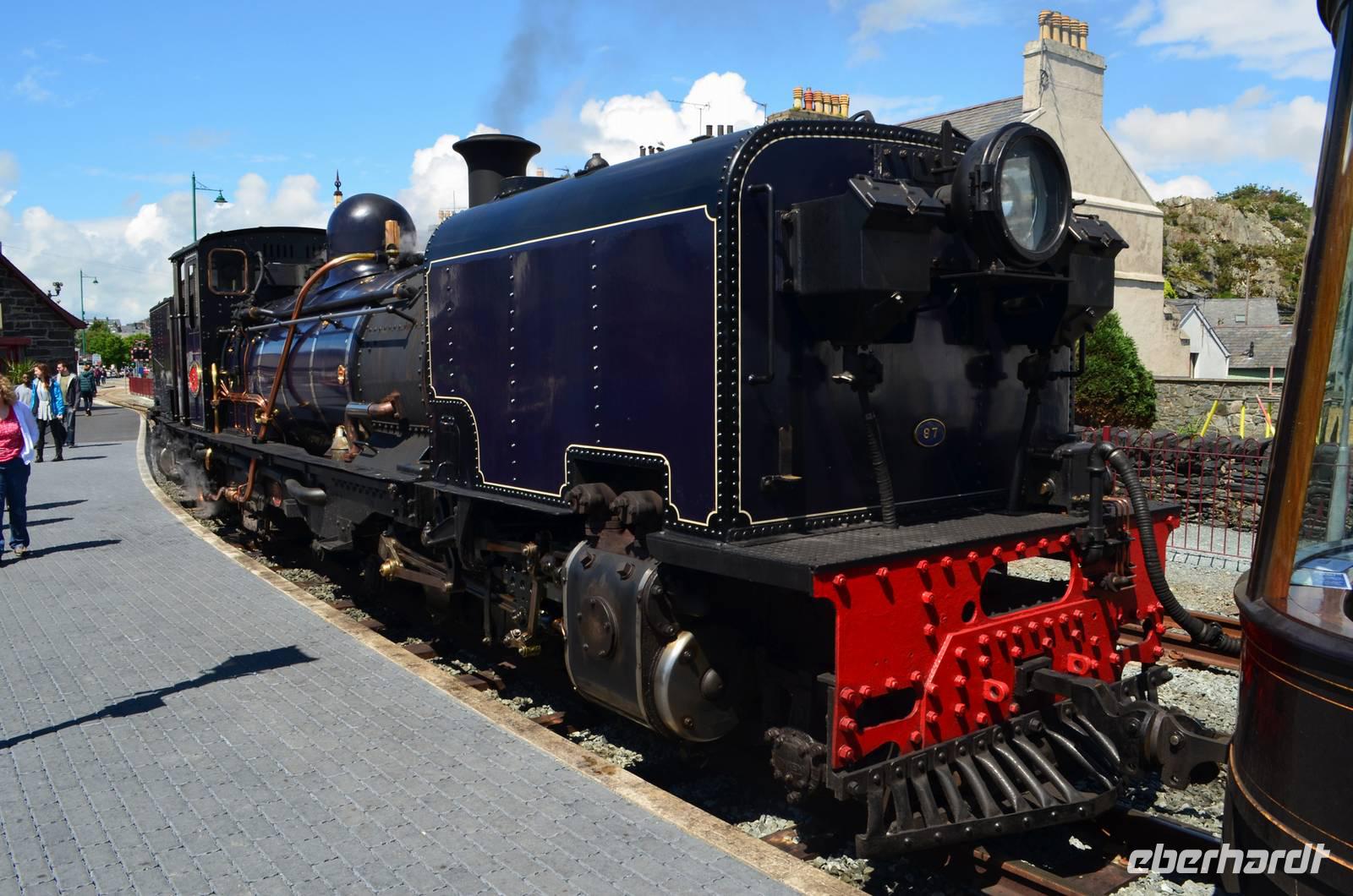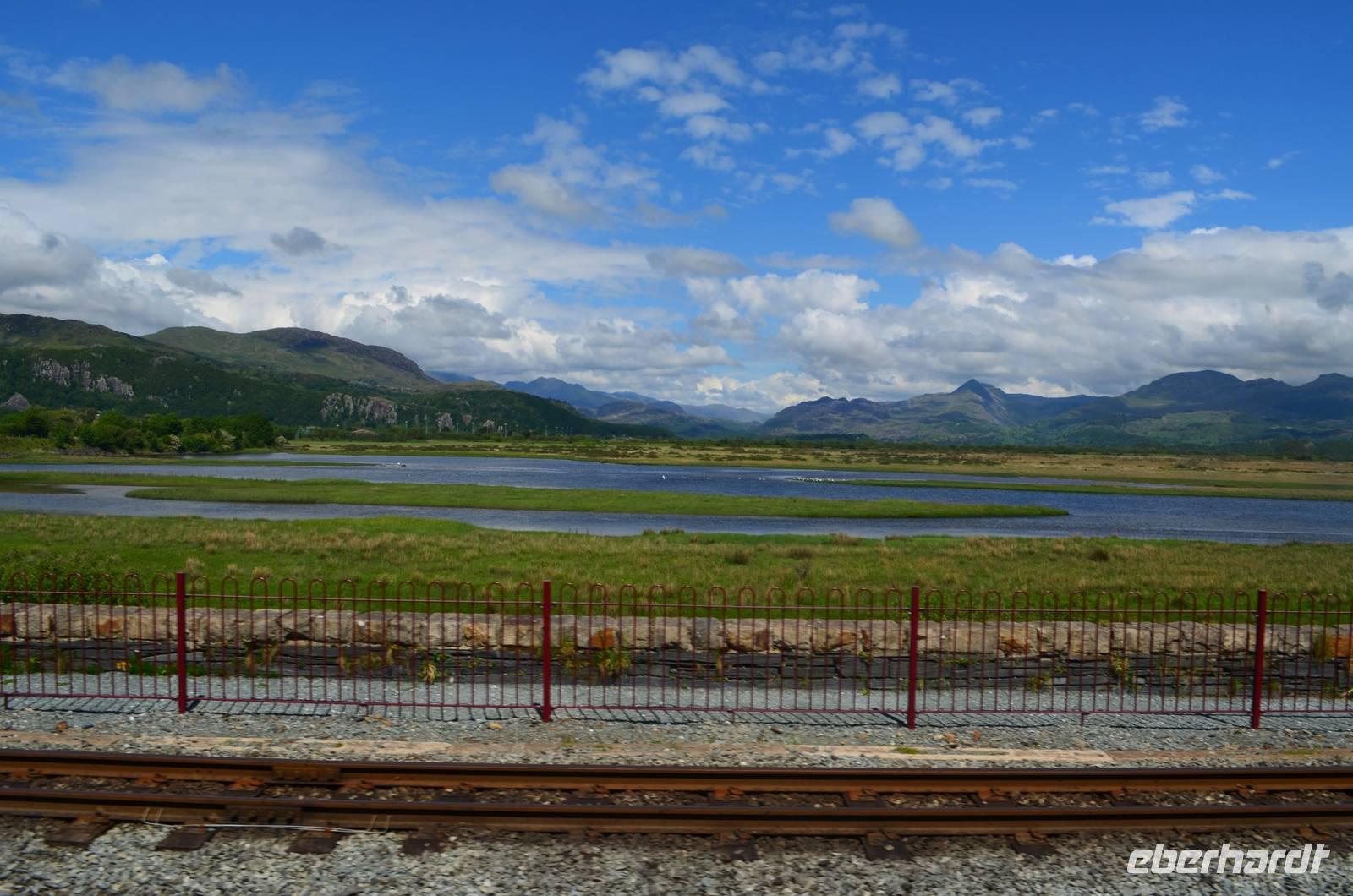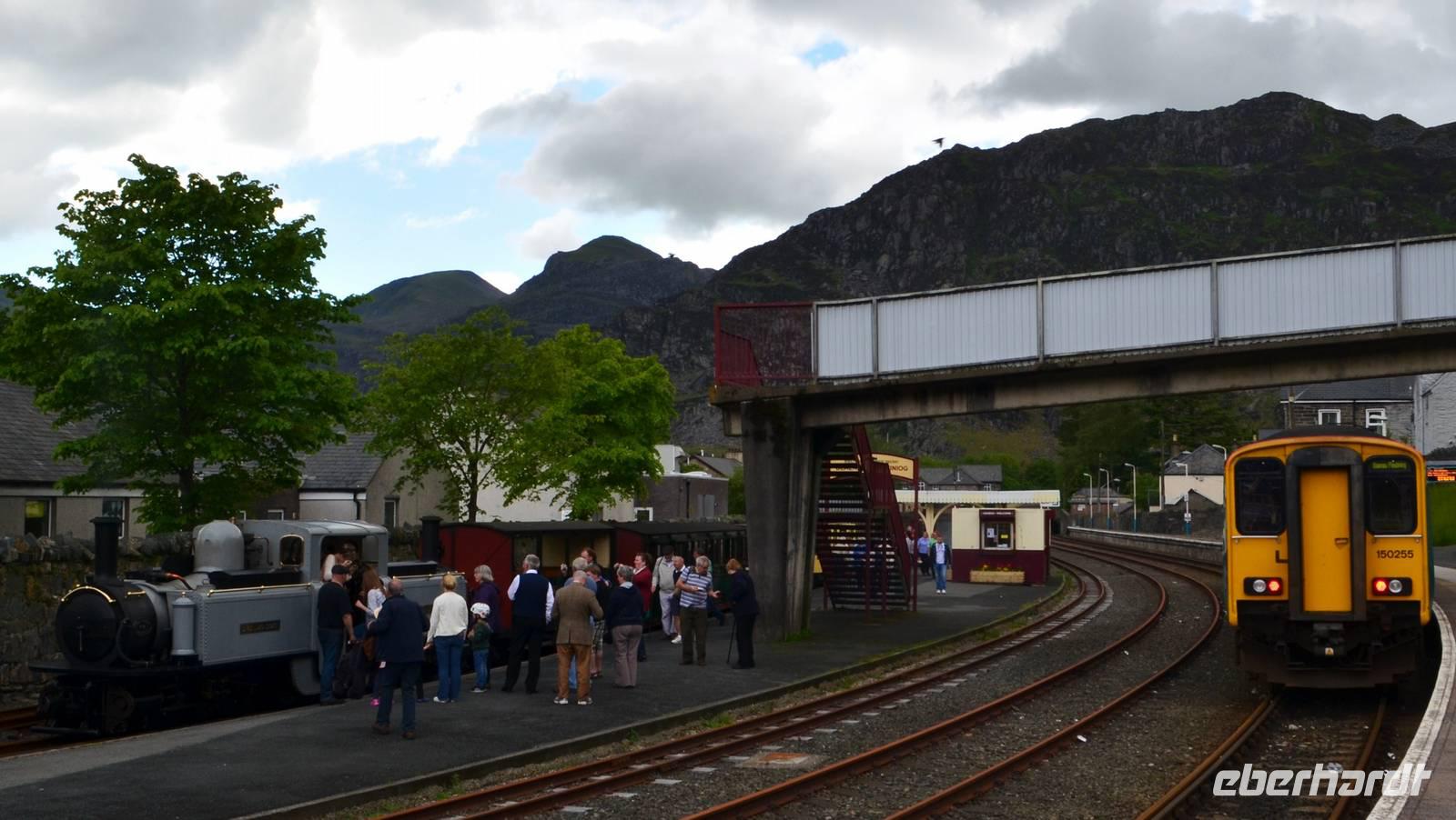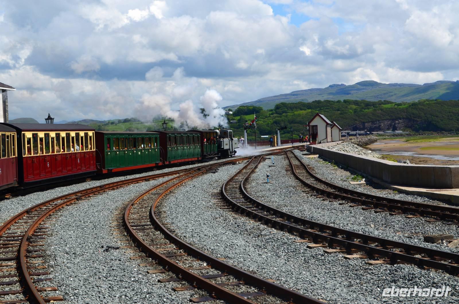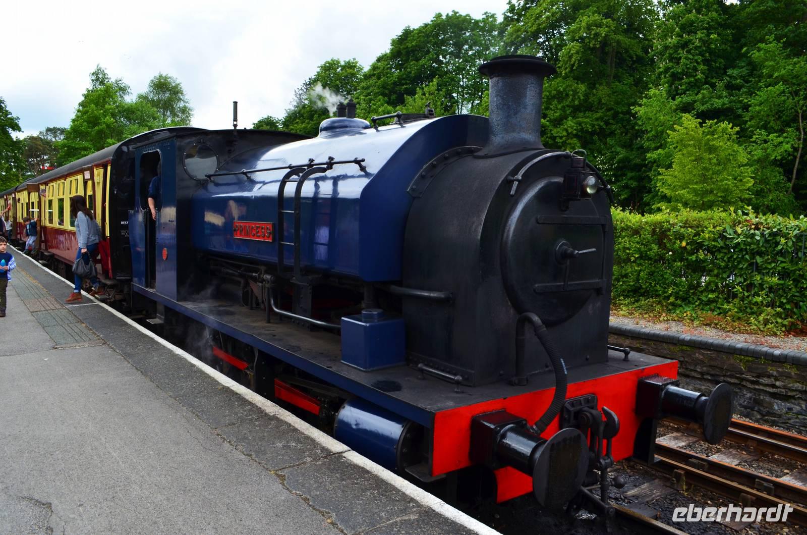 Steinplatten in der Mitte des Rasens im Schlosshof waren die Bühne für die Krönung von Charles zum Prince of Wales im Jahre 1969. 11:30 Uhr beginnt unsere Panoramafahrt durch den Snowdon Nationalpark, weiter Richtung Porthmadog. Die landschaftlich sehr schöne Fahrt führt uns vorbei am Snowdon Mountain und am Lynn Gwellyn, schließlich weiter bis Beddgelert. Die Legende vom begrabenen Hund Gelert zieht uns kurz in ihren Bann. In Porthmadog angekommen, steigen wir in die Kleinbahn um. Für die Gruppe ist ein ganzer Wagen reserviert, Nr. 110. Wir haben noch ausreichend Zeit für Fotos und schauen zu wie ein Zug der Welsh Highland Railway abfährt und wie Wasser und Kohlen in die Lok für unseren Zug übernommen werden. Dann startet die Fahrt nach Blaneau. Wieder geht es hinein und hinauf in die Berge. Unser Bus fährt inzwischen zum Bahnhof in Blaneau und ist da, als wir ankommen.