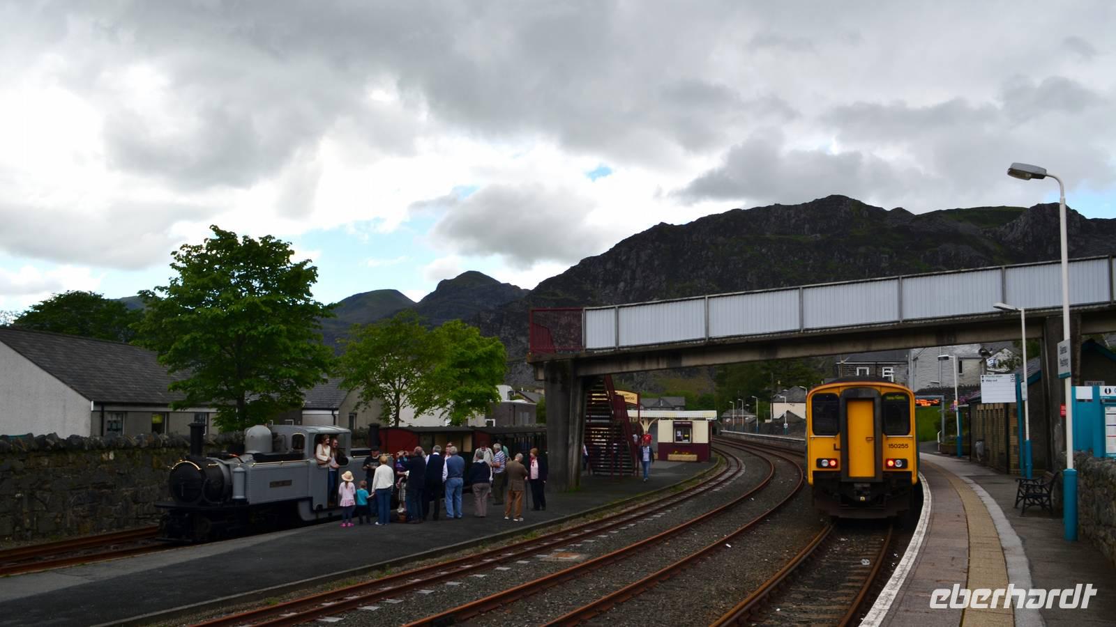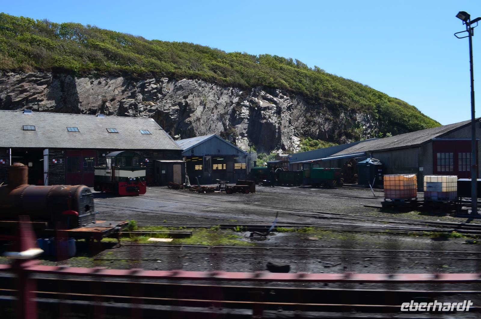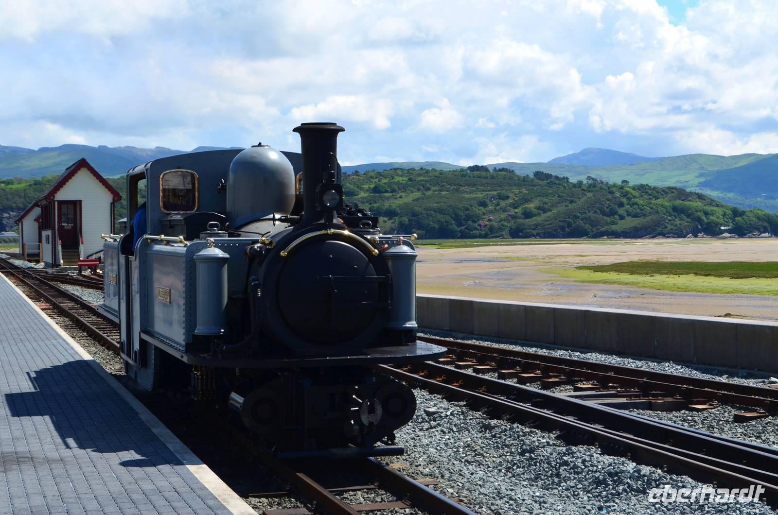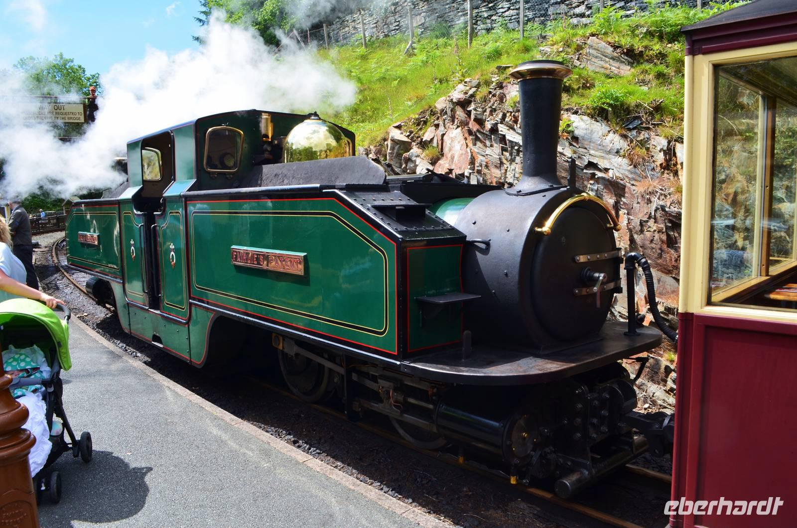 Steinplatten in der Mitte des Rasens im Schlosshof waren die Bühne für die Krönung von Charles zum Prince of Wales im Jahre 1969. 11:30 Uhr beginnt unsere Panoramafahrt durch den Snowdon Nationalpark, weiter Richtung Porthmadog. Die landschaftlich sehr schöne Fahrt führt uns vorbei am Snowdon Mountain und am Lynn Gwellyn, schließlich weiter bis Beddgelert. Die Legende vom begrabenen Hund Gelert zieht uns kurz in ihren Bann. In Porthmadog angekommen, steigen wir in die Kleinbahn um. Für die Gruppe ist ein ganzer Wagen reserviert, Nr. 110. Wir haben noch ausreichend Zeit für Fotos und schauen zu wie ein Zug der Welsh Highland Railway abfährt und wie Wasser und Kohlen in die Lok für unseren Zug übernommen werden. Dann startet die Fahrt nach Blaneau. Wieder geht es hinein und hinauf in die Berge. Unser Bus fährt inzwischen zum Bahnhof in Blaneau und ist da, als wir ankommen.
