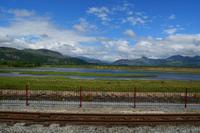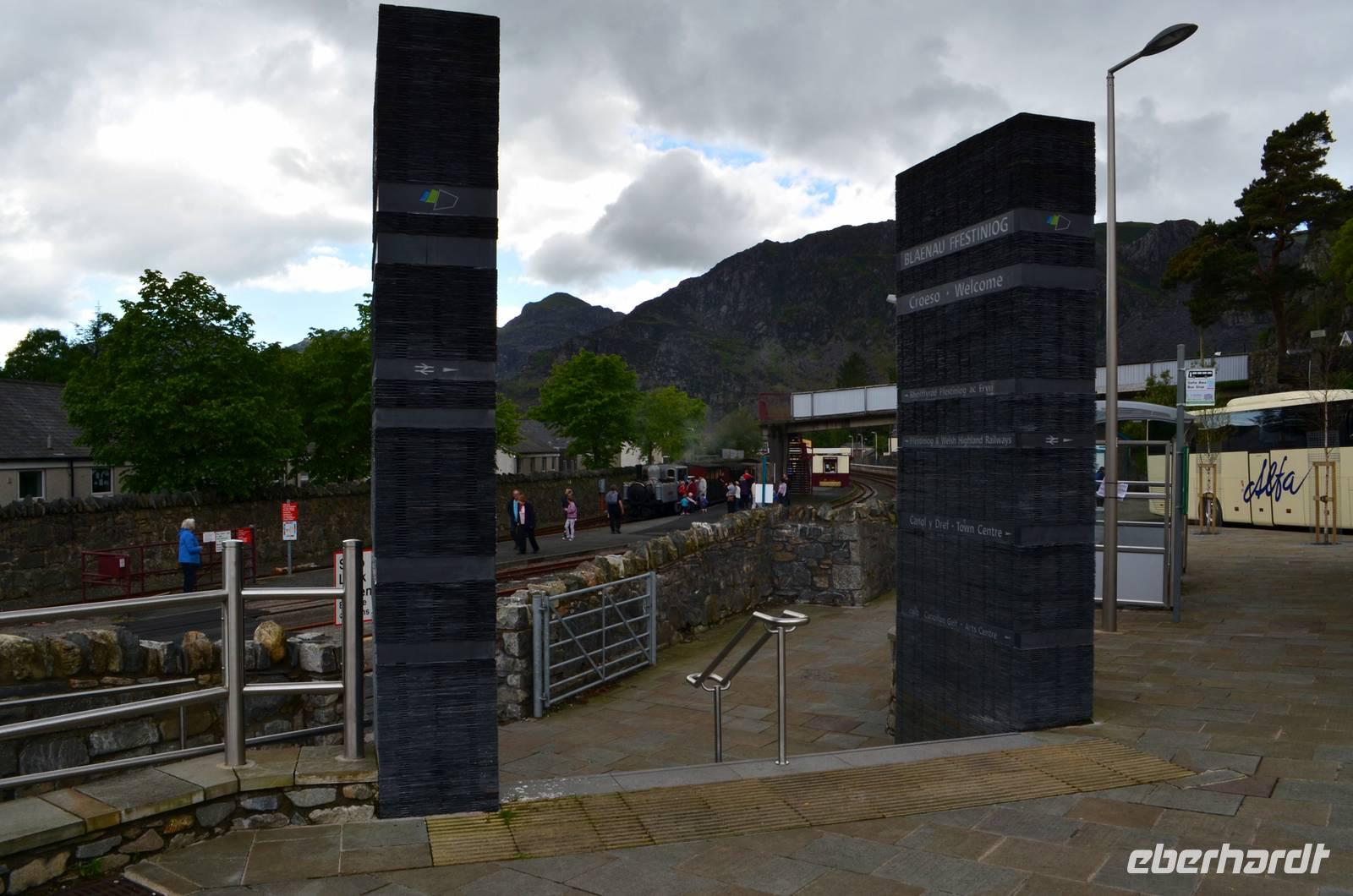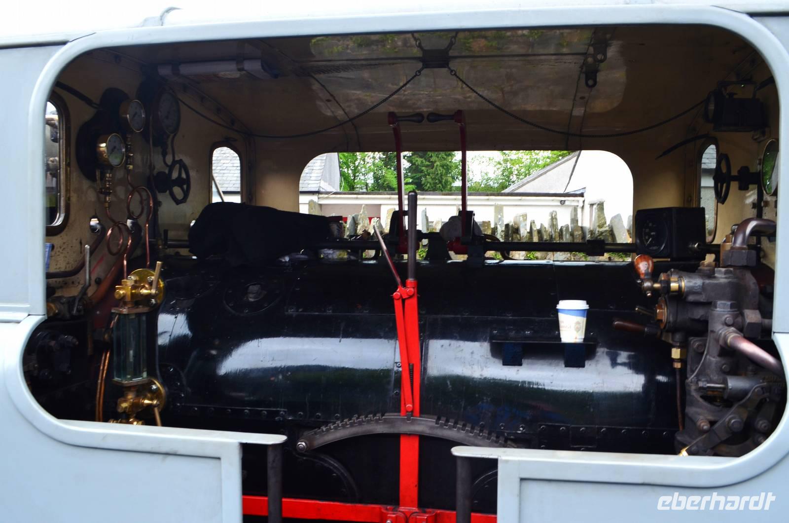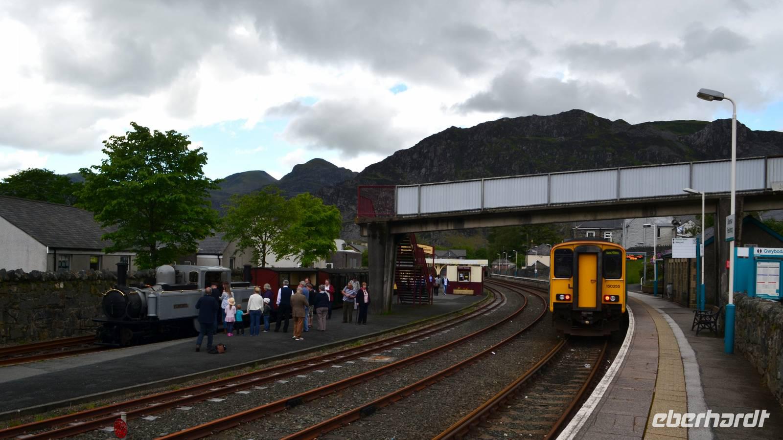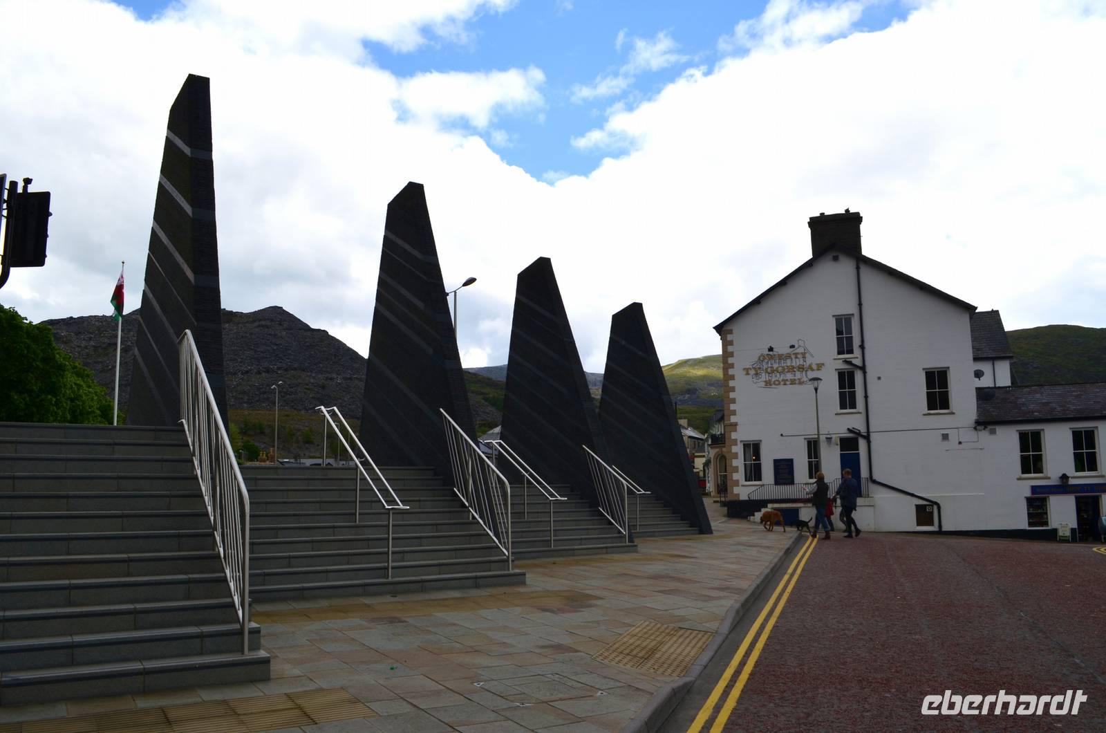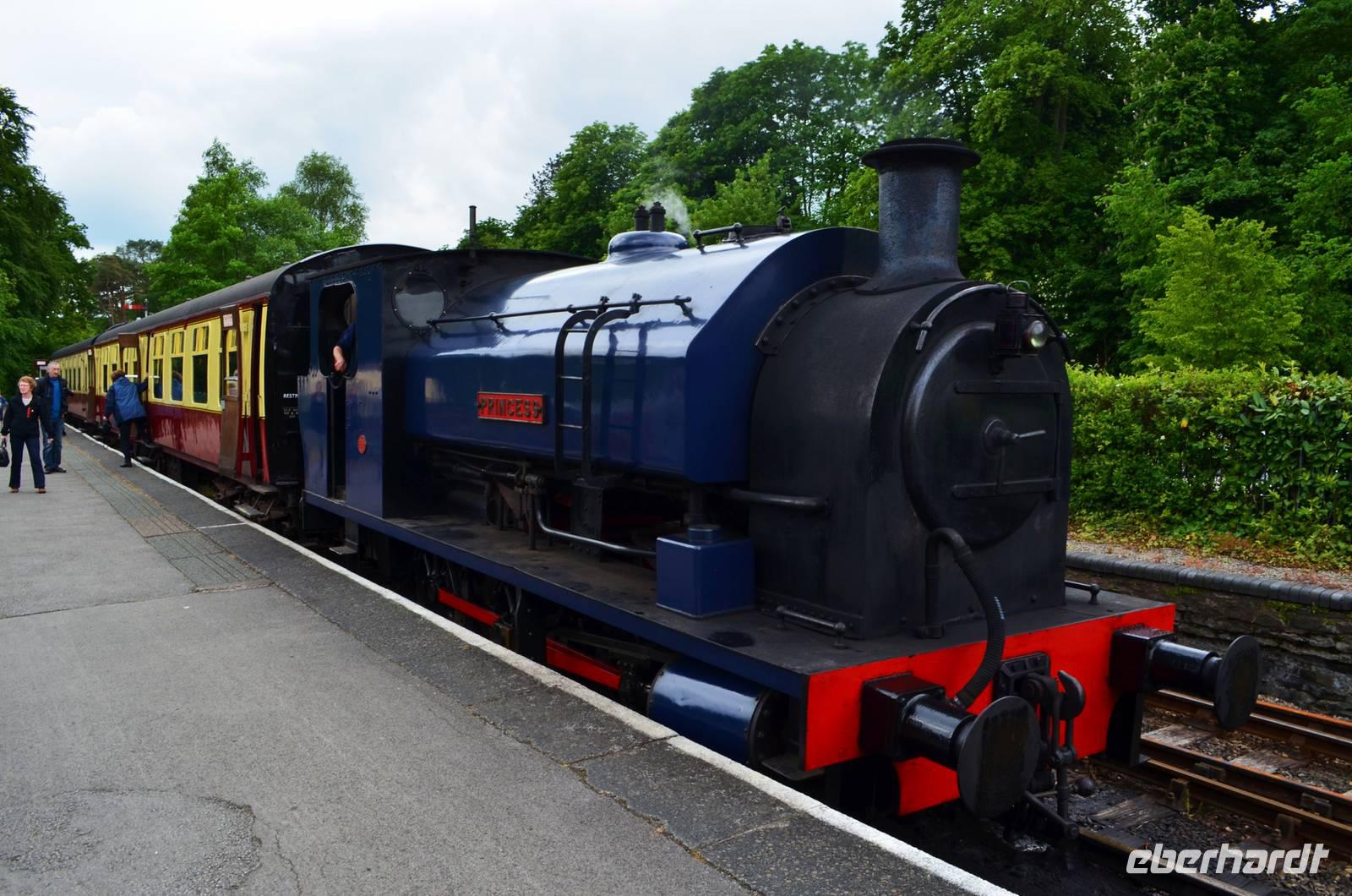 Steinplatten in der Mitte des Rasens im Schlosshof waren die Bühne für die Krönung von Charles zum Prince of Wales im Jahre 1969. 11:30 Uhr beginnt unsere Panoramafahrt durch den Snowdon Nationalpark, weiter Richtung Porthmadog. Die landschaftlich sehr schöne Fahrt führt uns vorbei am Snowdon Mountain und am Lynn Gwellyn, schließlich weiter bis Beddgelert. Die Legende vom begrabenen Hund Gelert zieht uns kurz in ihren Bann. In Porthmadog angekommen, steigen wir in die Kleinbahn um. Für die Gruppe ist ein ganzer Wagen reserviert, Nr. 110. Wir haben noch ausreichend Zeit für Fotos und schauen zu wie ein Zug der Welsh Highland Railway abfährt und wie Wasser und Kohlen in die Lok für unseren Zug übernommen werden. Dann startet die Fahrt nach Blaneau. Wieder geht es hinein und hinauf in die Berge. Unser Bus fährt inzwischen zum Bahnhof in Blaneau und ist da, als wir ankommen.