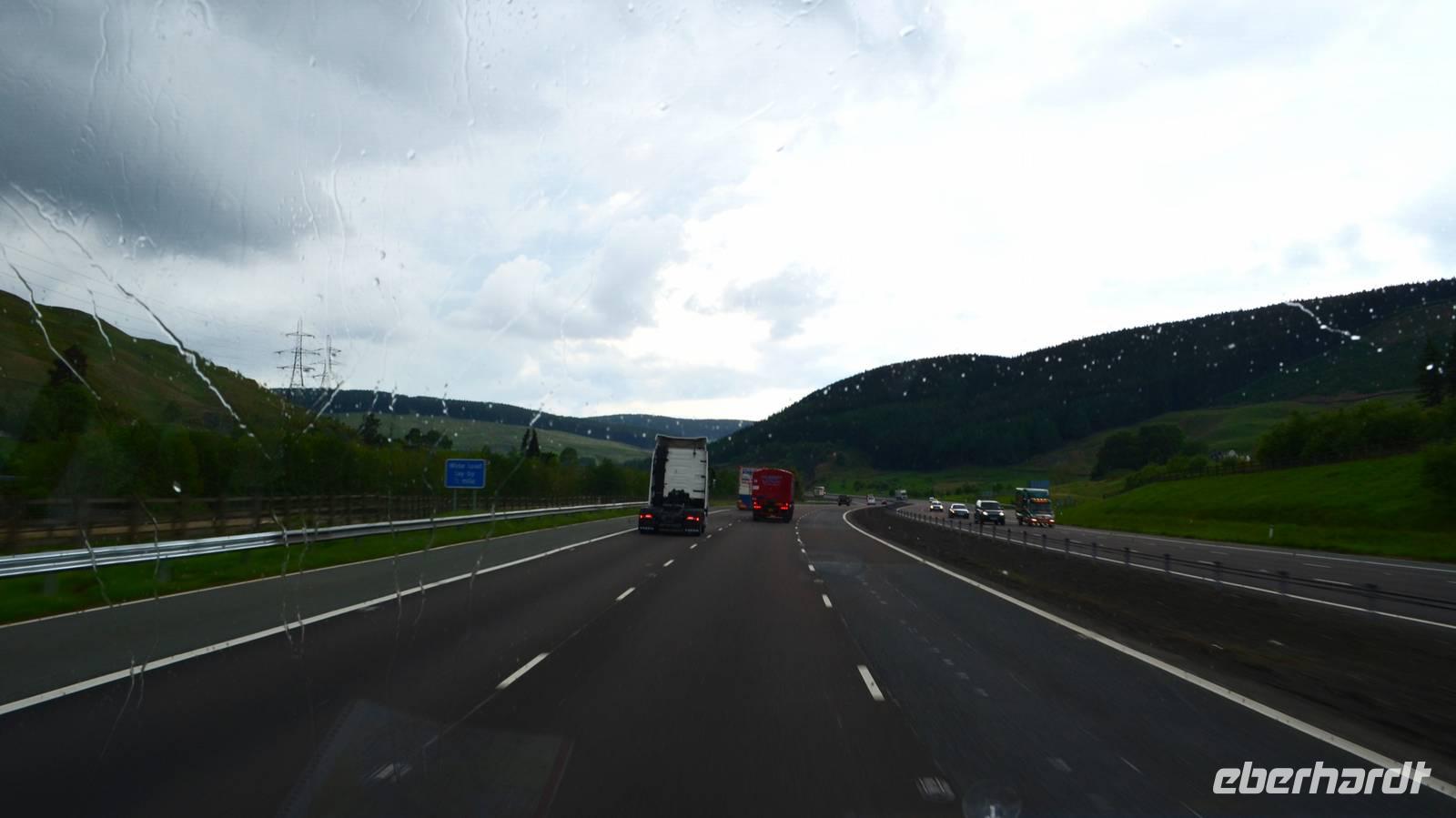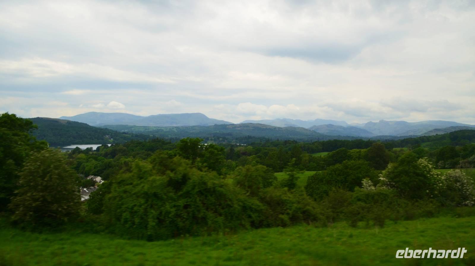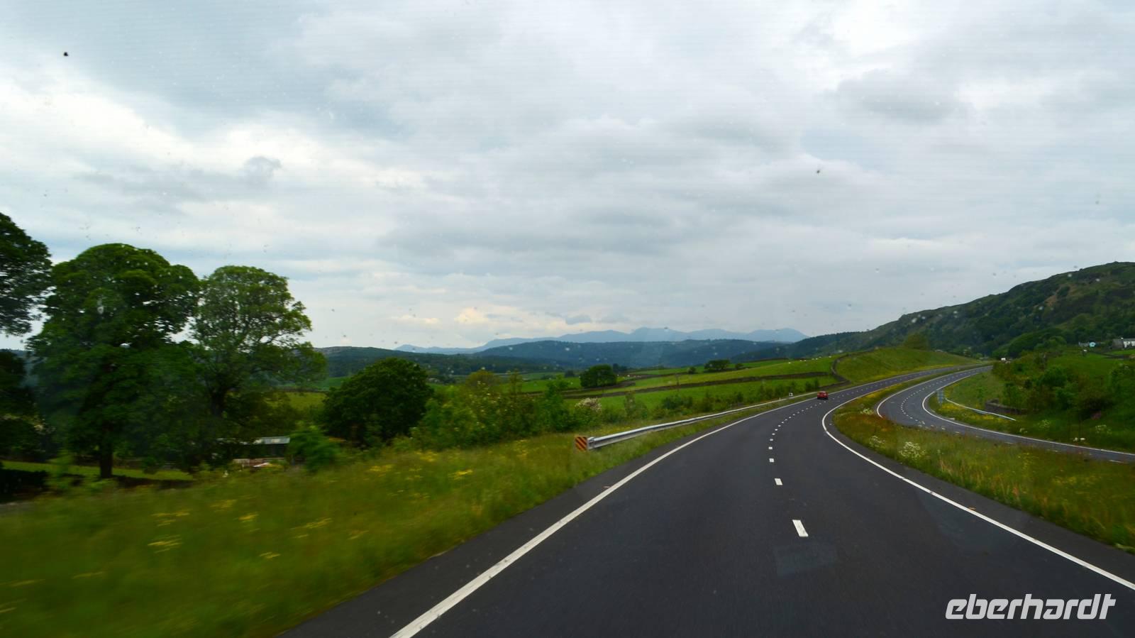 Erneut zuerst ein paar kleine Regenschauer, später aber schöneres Wetter und Sonnenschein. Wir starten zu unserer Fahrt in den Lake District. Über die Autobahn M6 geht es vorbei an Liverpool und Manchester. Am Service