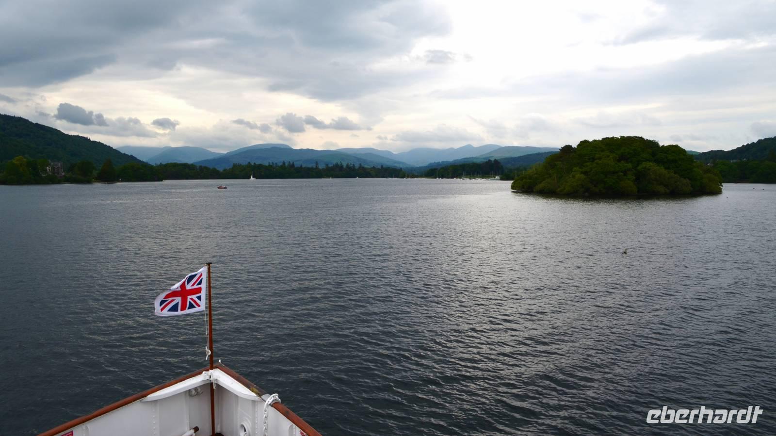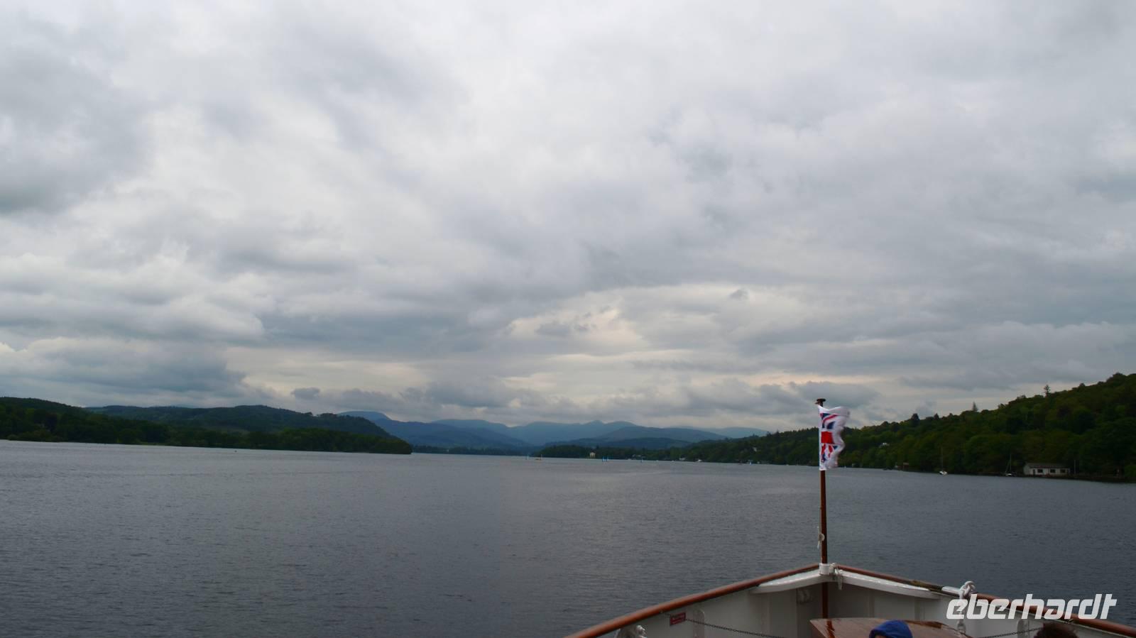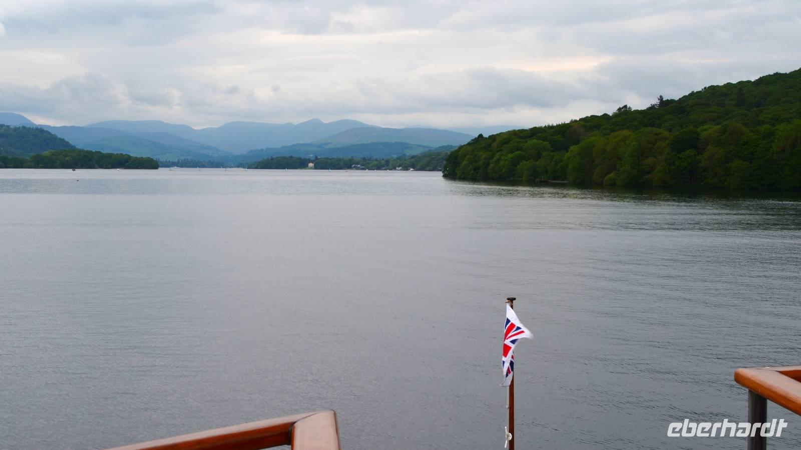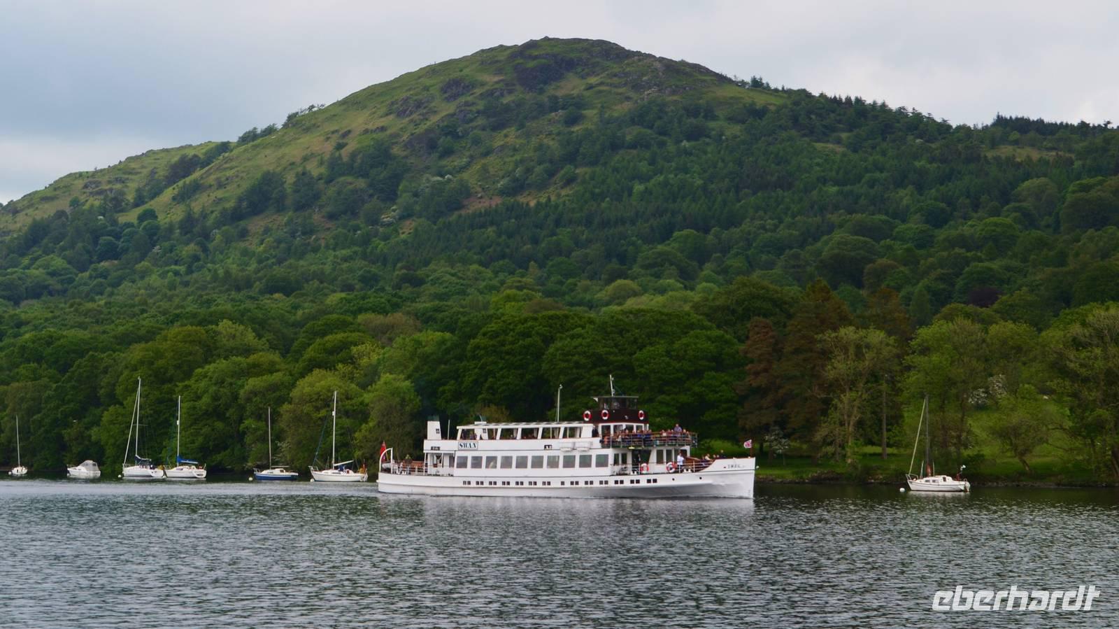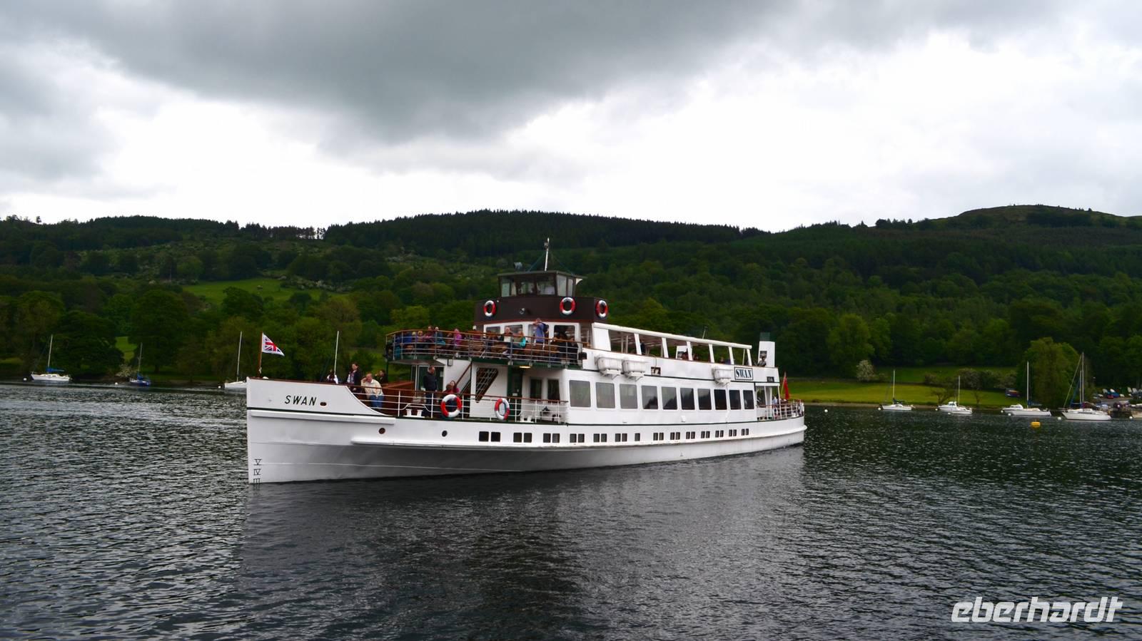 Lancaster machen wir eine kleine Kaffeepause und um 10:45 Uhr erreichen wir Lakeside und damit den Lake Windermere, Englands größten Binnensee. Hier bestehen Fotogelegenheiten für alle Gäste: Motive sind der wunderschöne See mit seiner Natur und Landschaft, der Nostalgie-Dampflokzuges im Bahnhof neben der Schiffsanlegestelle und natürlich unser Ausflugsschiff, der Schwan. Wir steigen ein, haben gute Plätze und schippern hinüber nach Bowness, den kleinen Hafen von Windermere. Nach einer kleinen Besichtigungspause fahren