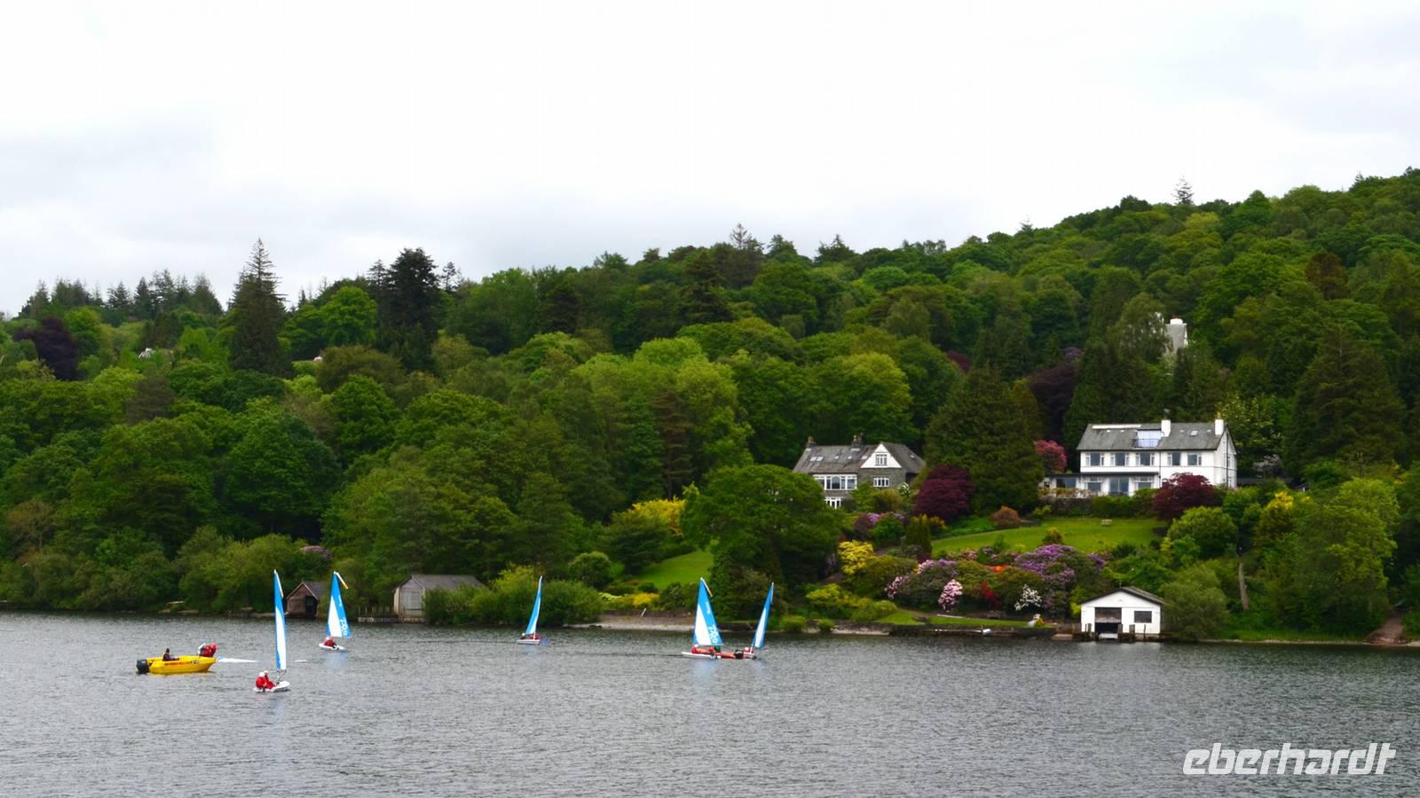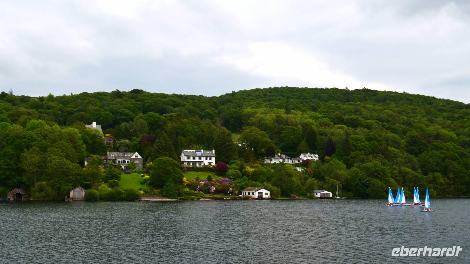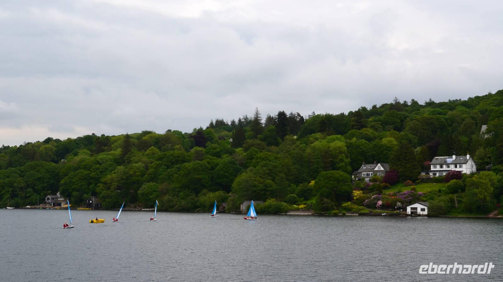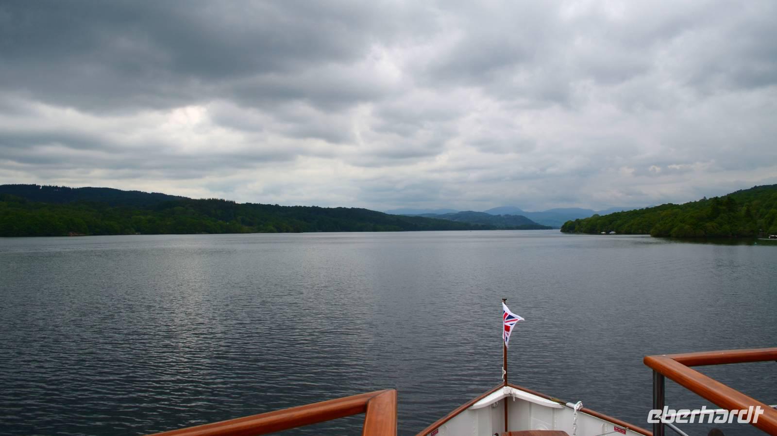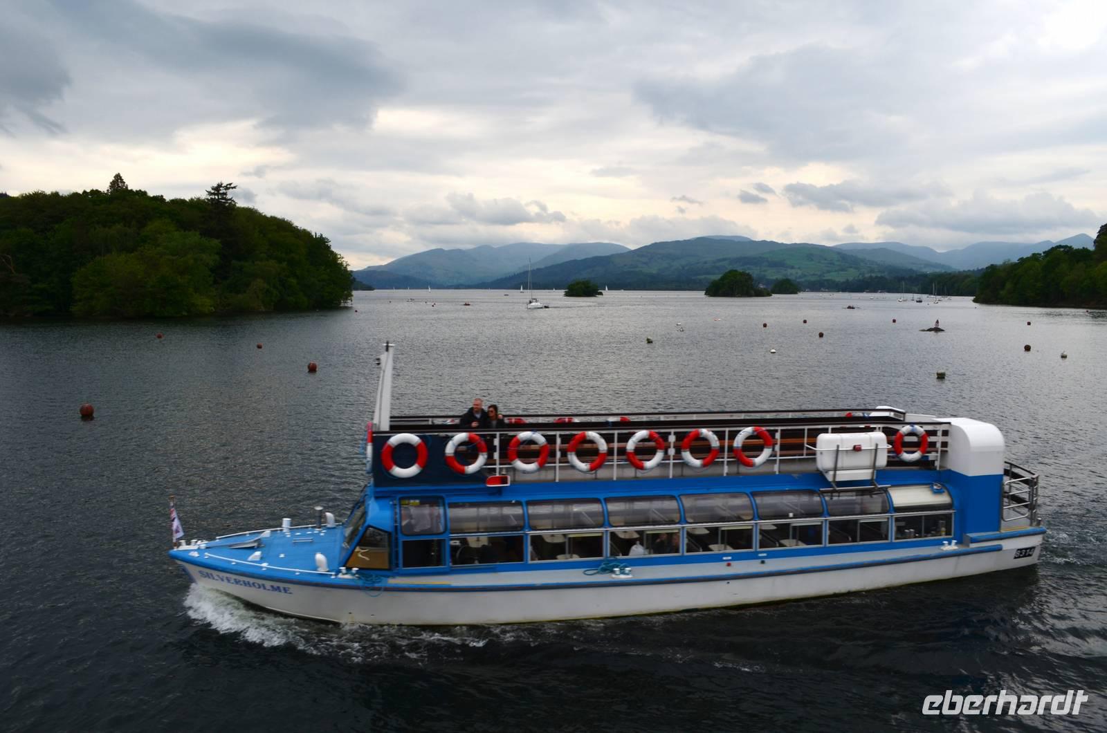 Lancaster machen wir eine kleine Kaffeepause und um 10:45 Uhr erreichen wir Lakeside und damit den Lake Windermere, Englands größten Binnensee. Hier bestehen Fotogelegenheiten für alle Gäste: Motive sind der wunderschöne See mit seiner Natur und Landschaft, der Nostalgie-Dampflokzuges im Bahnhof neben der Schiffsanlegestelle und natürlich unser Ausflugsschiff, der Schwan. Wir steigen ein, haben gute Plätze und schippern hinüber nach Bowness, den kleinen Hafen von Windermere. Nach einer kleinen Besichtigungspause fahren