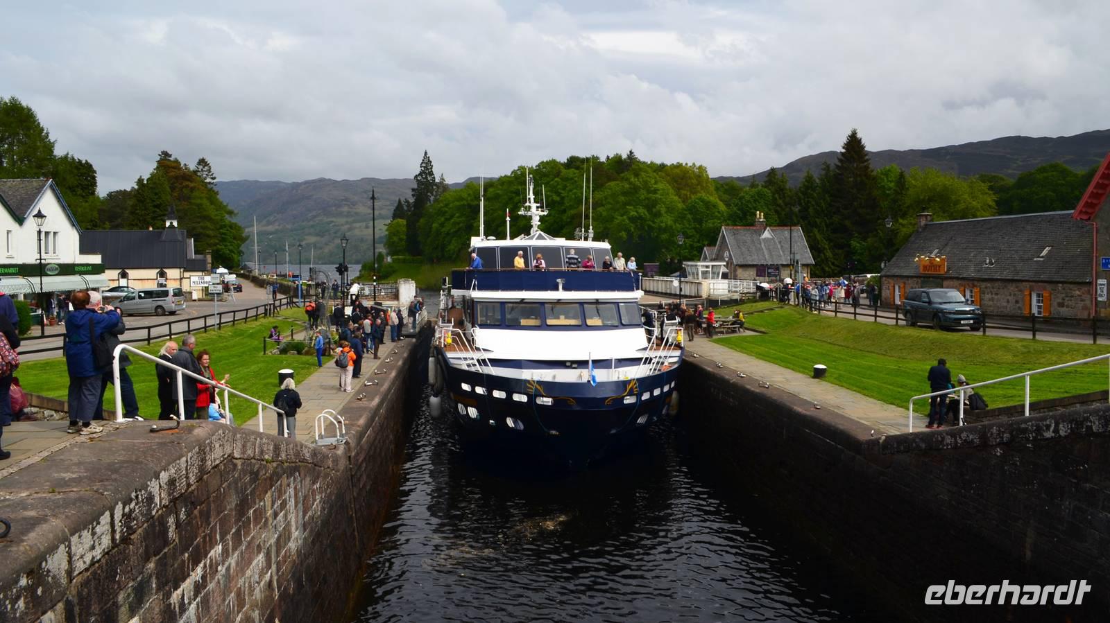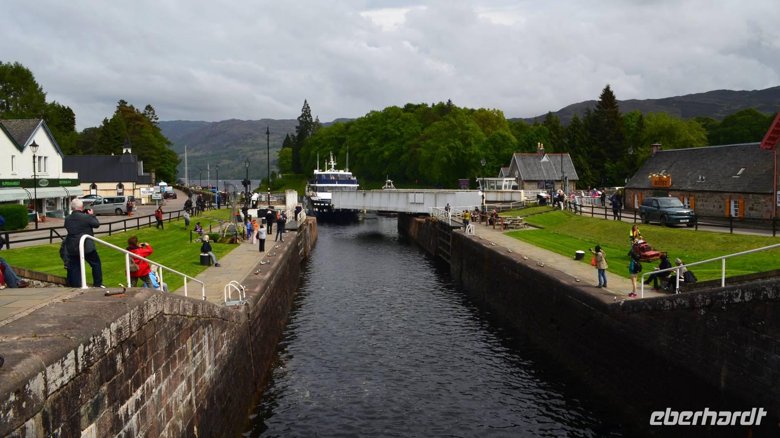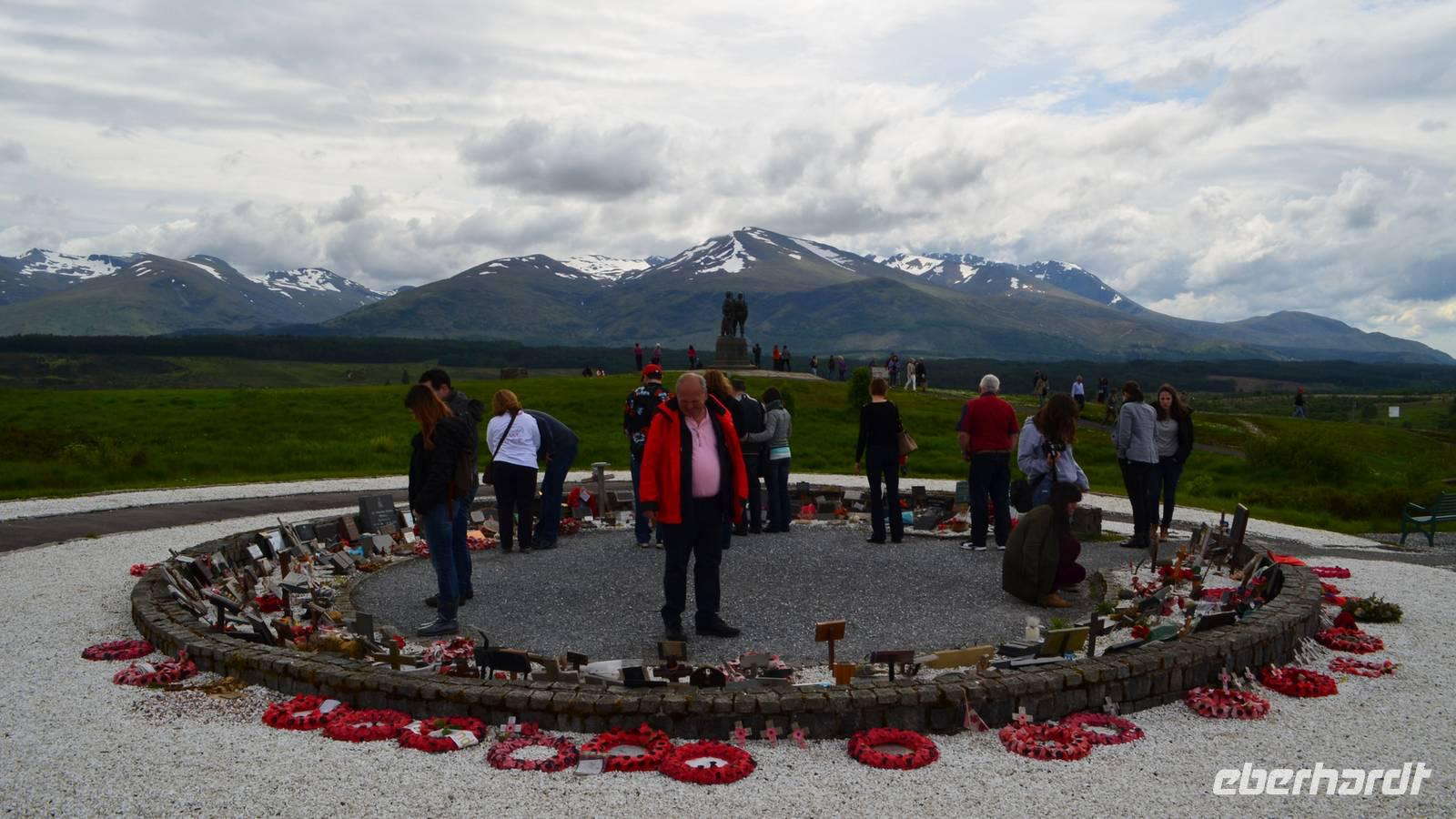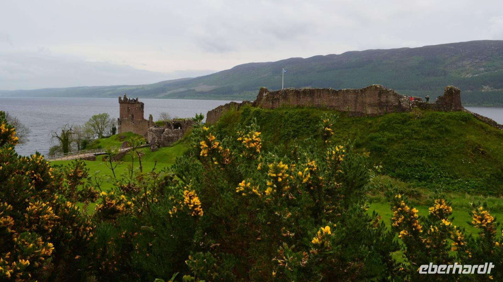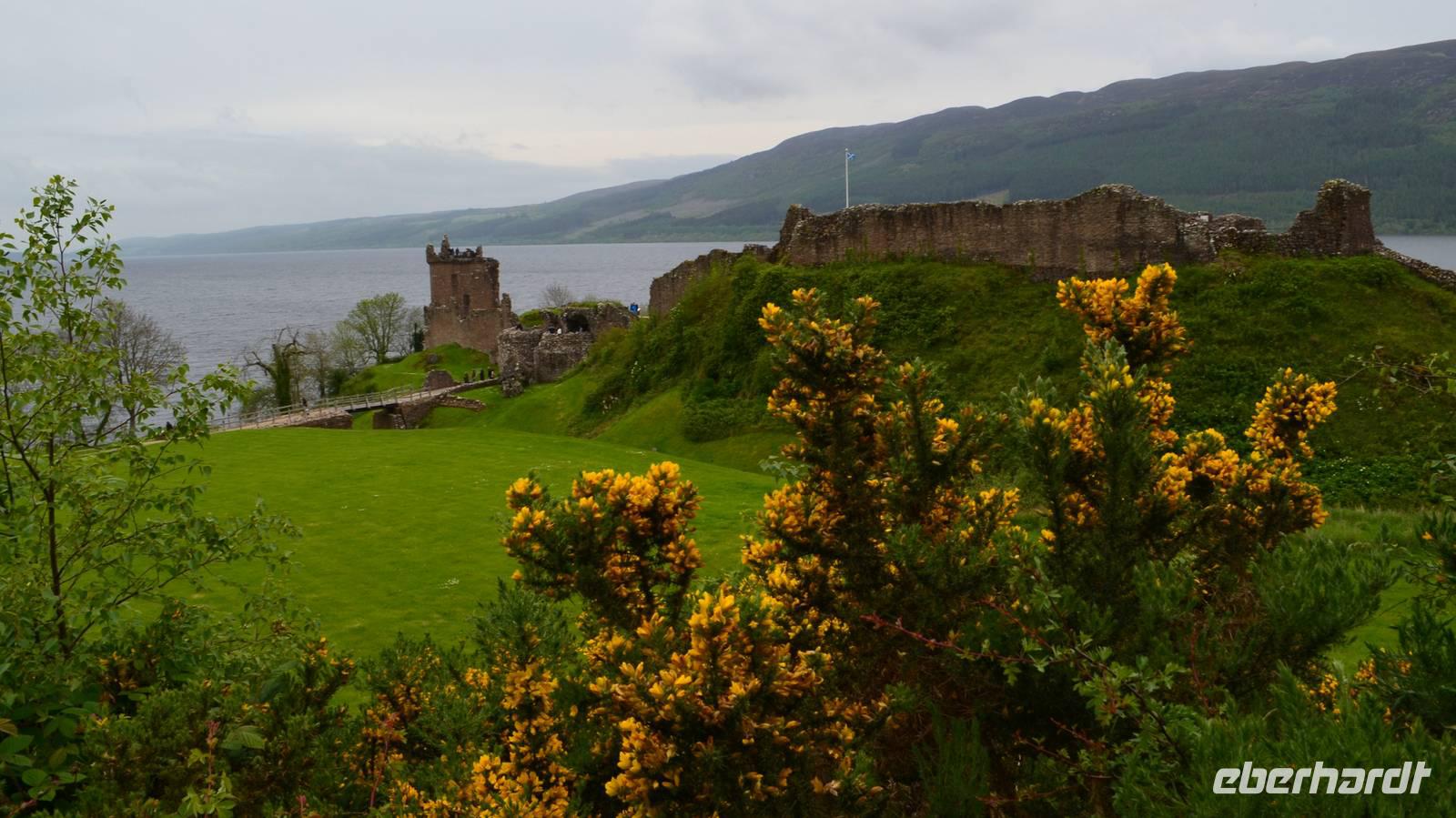 Weiter geht es über die Hochebene und durch das wildromantische Tal Glen Coe hinunter Richtung des Grabenbruchs. An einem wunderschönen Bergpanorama-Parkplatz nochmals ein Fotostopp mit herrlichem Panoramablick und einem Piper, den wir für unsere Gruppenfotos in unsere Mitte nehmen. Über das Visitor Centre von Glencoe fahren wir nach Fort Williams, dann bis zum Commando Memorial, wo wir einen Fotostopp zum höchsten Berg von GB, dem Ben Newis einlegen. Von hier ist es nur noch ein kurzes Stück bis Fort Augustus. An den Staustufen des Caledonian Canals schauen wir zu, wie Boote gerade durch die Schleusen gehoben werden. Dann kommt sogar noch ein kleiner Kreuzfahrer und die Brücke wird sogar geöffnet. Weiter geht es am Loch Ness entlang zum Urquhart Castle, die Treppe hinunter zur Kasse, dann gemeinsam nach unten in den Shop, dort links das kleine Kino, wo der Film über die Geschichte des Castles in englischer Sprache mit deutschen Untertiteln gezeigt wird (8 Minuten). Ein sehr schöner Effekt entsteht am Ende, wenn sich der Vorhang öffnet. Beim anschließenden individuellen Besuch des Castles kann jeder diesen romantischen und landschaftlich schönen Ort auf seine Weise erkunden.
