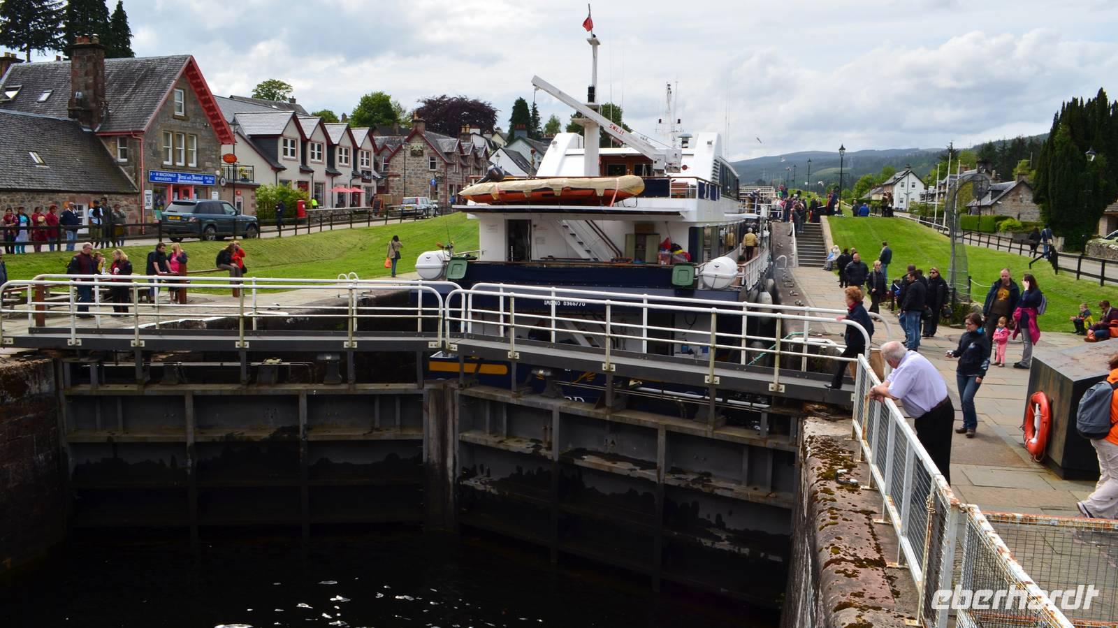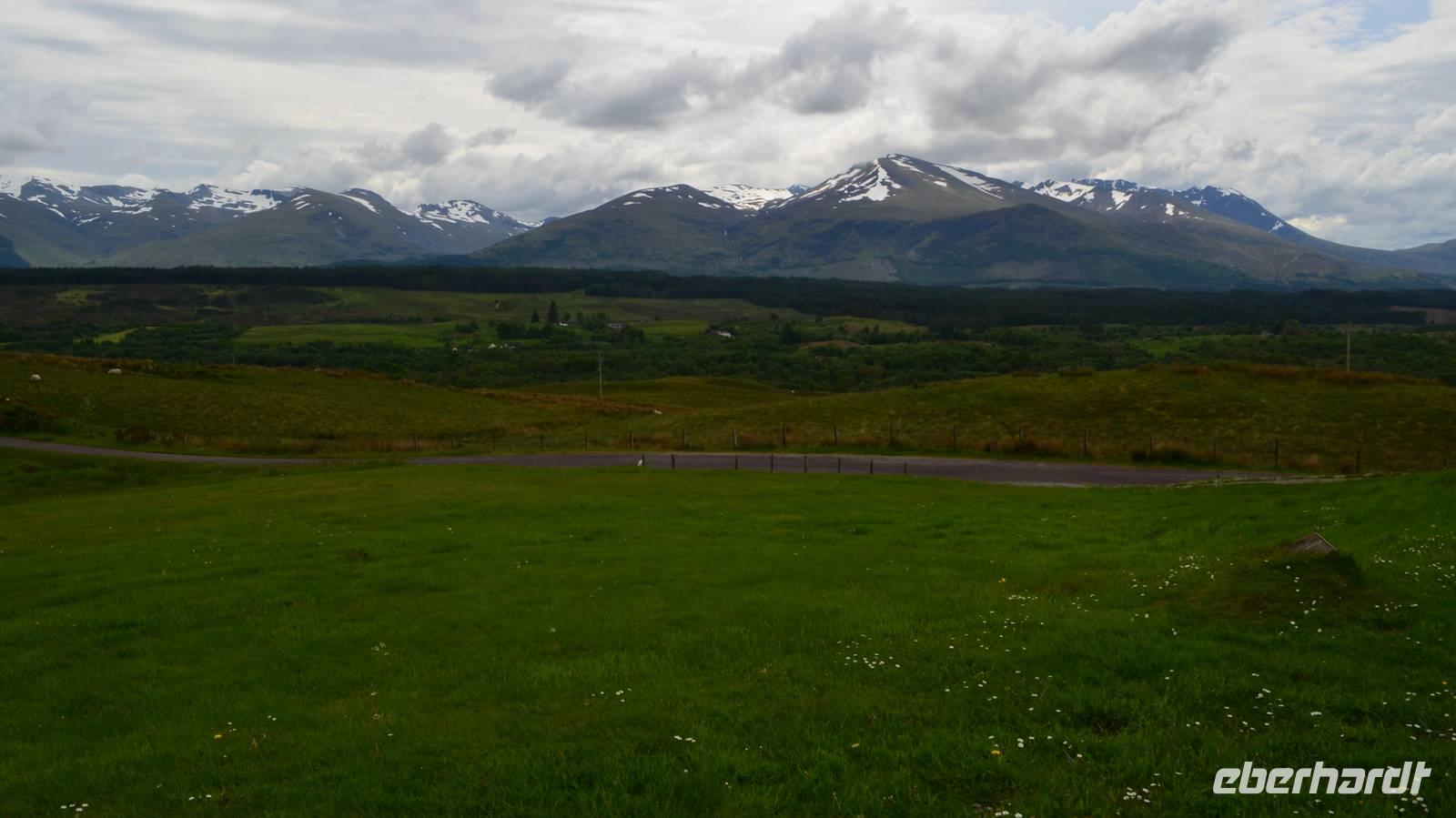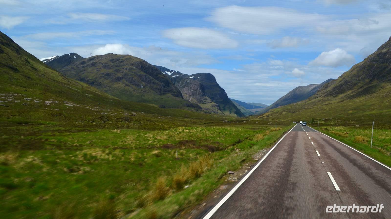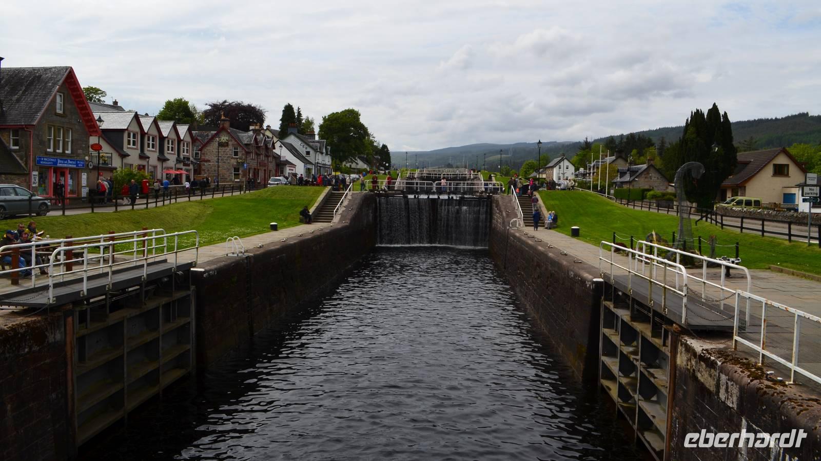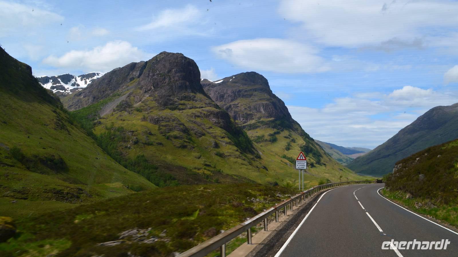 Weiter geht es über die Hochebene und durch das wildromantische Tal Glen Coe hinunter Richtung des Grabenbruchs. An einem wunderschönen Bergpanorama-Parkplatz nochmals ein Fotostopp mit herrlichem Panoramablick und einem Piper, den wir für unsere Gruppenfotos in unsere Mitte nehmen. Über das Visitor Centre von Glencoe fahren wir nach Fort Williams, dann bis zum Commando Memorial, wo wir einen Fotostopp zum höchsten Berg von GB, dem Ben Newis einlegen. Von hier ist es nur noch ein kurzes Stück bis Fort Augustus. An den Staustufen des Caledonian Canals schauen wir zu, wie Boote gerade durch die Schleusen gehoben werden. Dann kommt sogar noch ein kleiner Kreuzfahrer und die Brücke wird sogar geöffnet. Weiter geht es am Loch Ness entlang zum Urquhart Castle, die Treppe hinunter zur Kasse, dann gemeinsam nach unten in den Shop, dort links das kleine Kino, wo der Film über die Geschichte des Castles in englischer Sprache mit deutschen Untertiteln gezeigt wird (8 Minuten). Ein sehr schöner Effekt entsteht am Ende, wenn sich der Vorhang öffnet. Beim anschließenden individuellen Besuch des Castles kann jeder diesen romantischen und landschaftlich schönen Ort auf seine Weise erkunden.