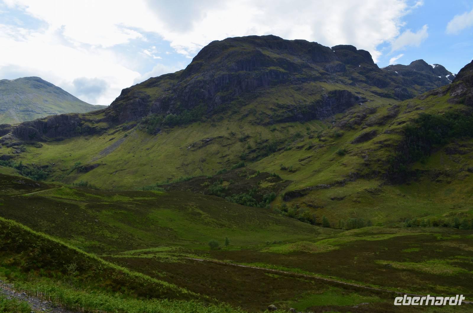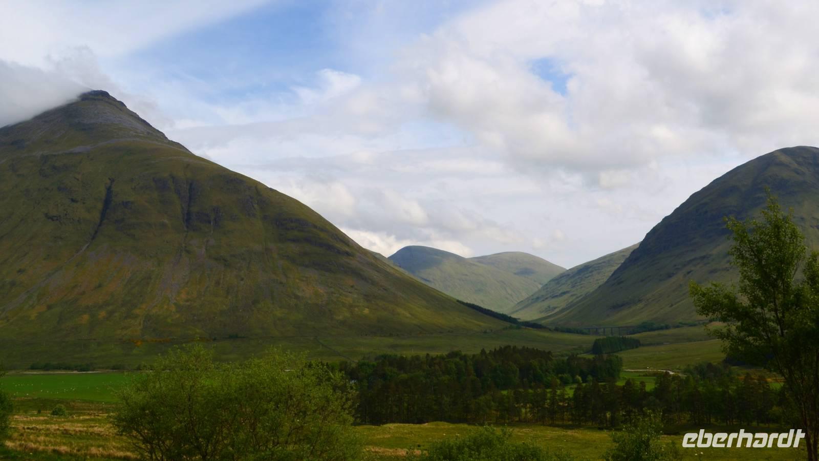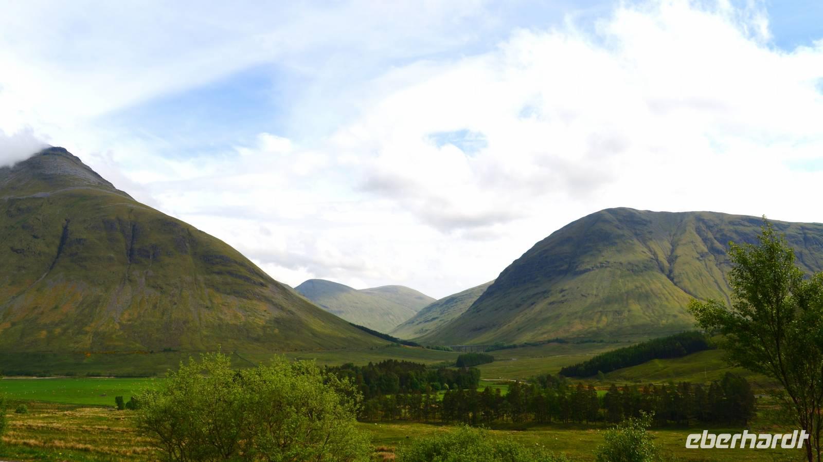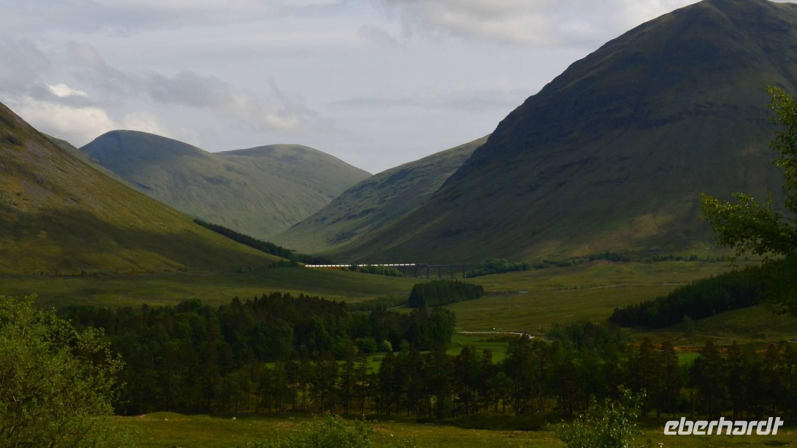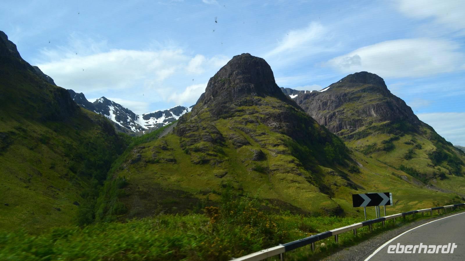 Weiter geht es über die Hochebene und durch das wildromantische Tal Glen Coe hinunter Richtung des Grabenbruchs. An einem wunderschönen Bergpanorama-Parkplatz nochmals ein Fotostopp mit herrlichem Panoramablick und einem Piper, den wir für unsere Gruppenfotos in unsere Mitte nehmen. Über das Visitor Centre von Glencoe fahren wir nach Fort Williams, dann bis zum Commando Memorial, wo wir einen Fotostopp zum höchsten Berg von GB, dem Ben Newis einlegen. Von hier ist es nur noch ein kurzes Stück bis Fort Augustus. An den Staustufen des Caledonian Canals schauen wir zu, wie Boote gerade durch die Schleusen gehoben werden. Dann kommt sogar noch ein kleiner Kreuzfahrer und die Brücke wird sogar geöffnet. Weiter geht es am Loch Ness entlang zum Urquhart Castle, die Treppe hinunter zur Kasse, dann gemeinsam nach unten in den Shop, dort links das kleine Kino, wo der Film über die Geschichte des Castles in englischer Sprache mit deutschen Untertiteln gezeigt wird (8 Minuten). Ein sehr schöner Effekt entsteht am Ende, wenn sich der Vorhang öffnet. Beim anschließenden individuellen Besuch des Castles kann jeder diesen romantischen und landschaftlich schönen Ort auf seine Weise erkunden.