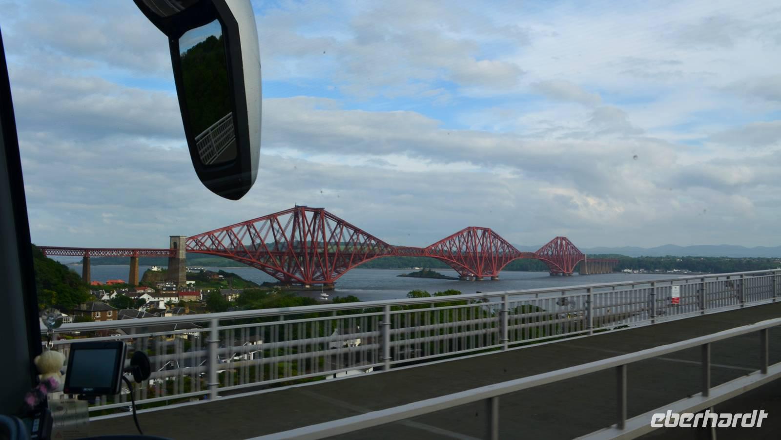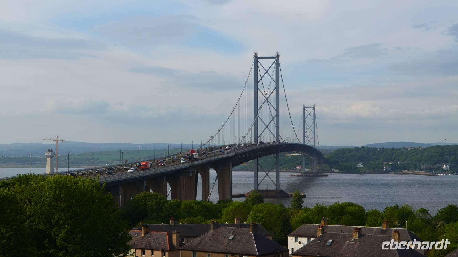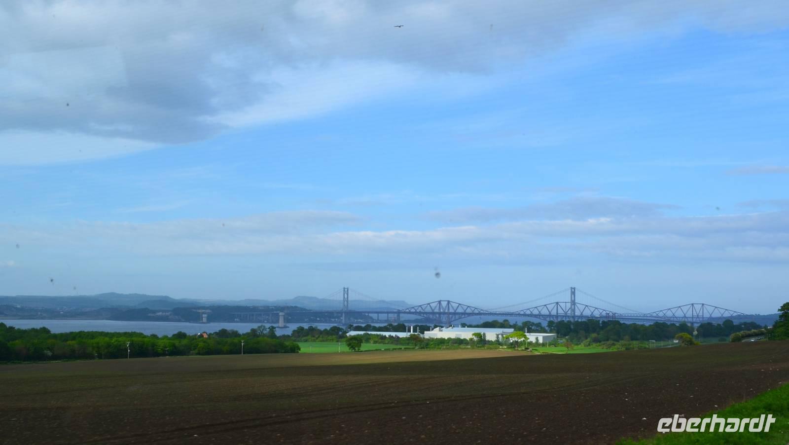 Entlang der Südseite des Firth of Forth fahren wir zur nächsten Sehenswürdigkeit, den Firth of Forth Bridges. Einmal geht die Brückenüberfahrt auf der Forth Road Bridge nach Norden hinüber und wieder zurück, mit Blick auf die tolle Eisenbahnbrücke und die Baustelle der neuen Road Bridge. Ein kurzer Stopp am Aussichtspunkt Three Bridges und dann fahren wir nach Edinburgh hinein, zum Hilton Hotel, das auch für zwei Nächte unser Quartier sein wird.