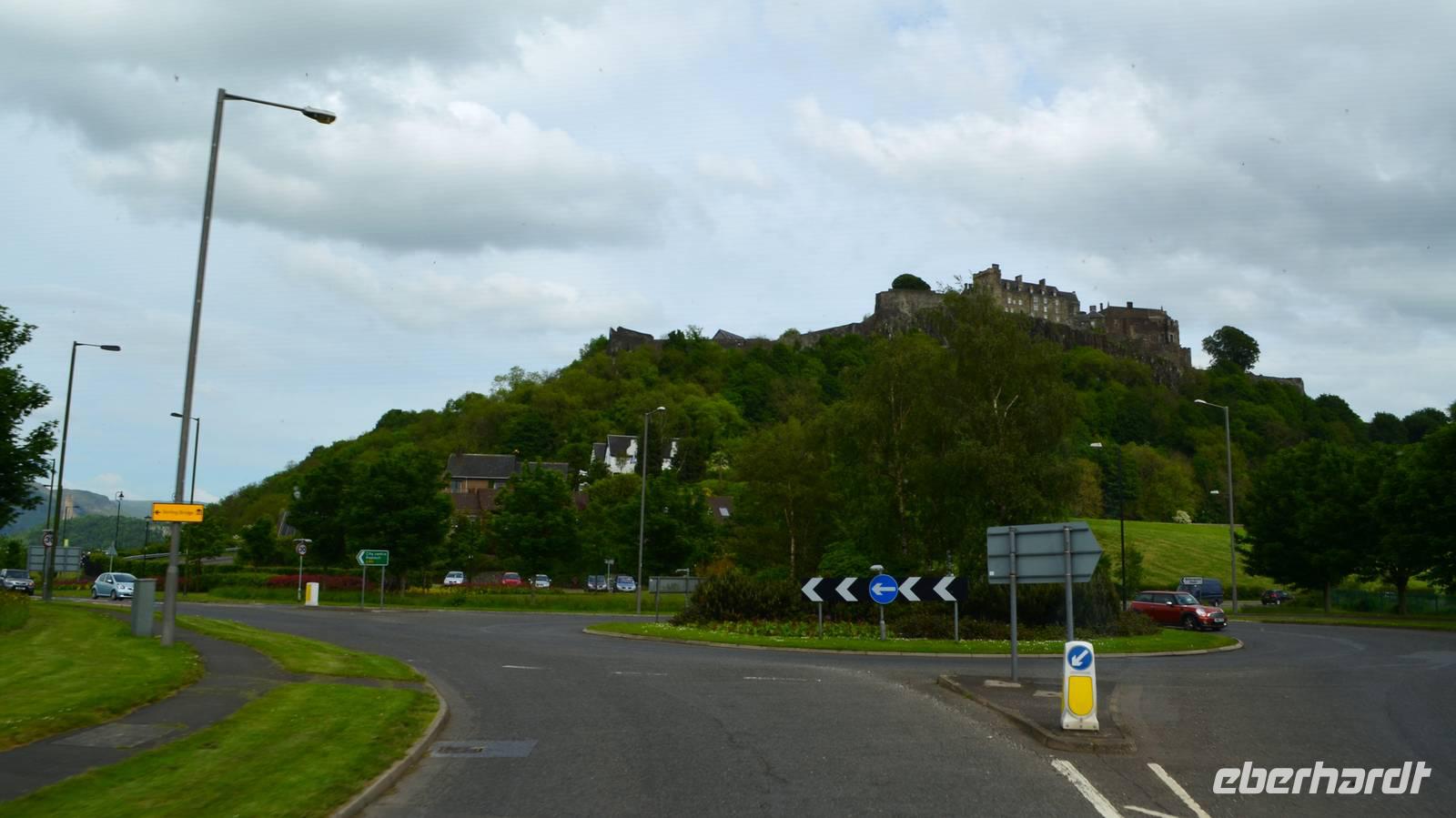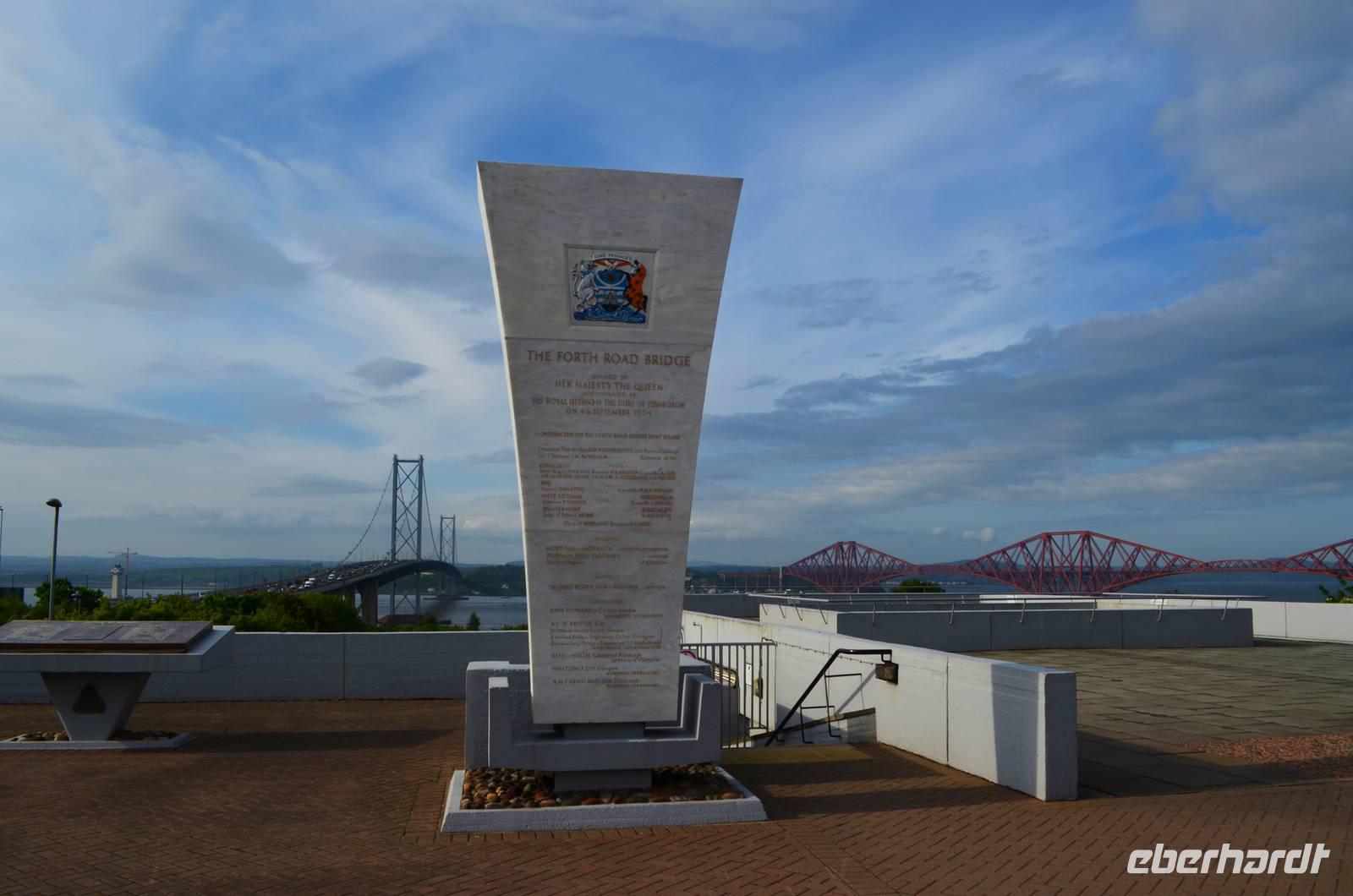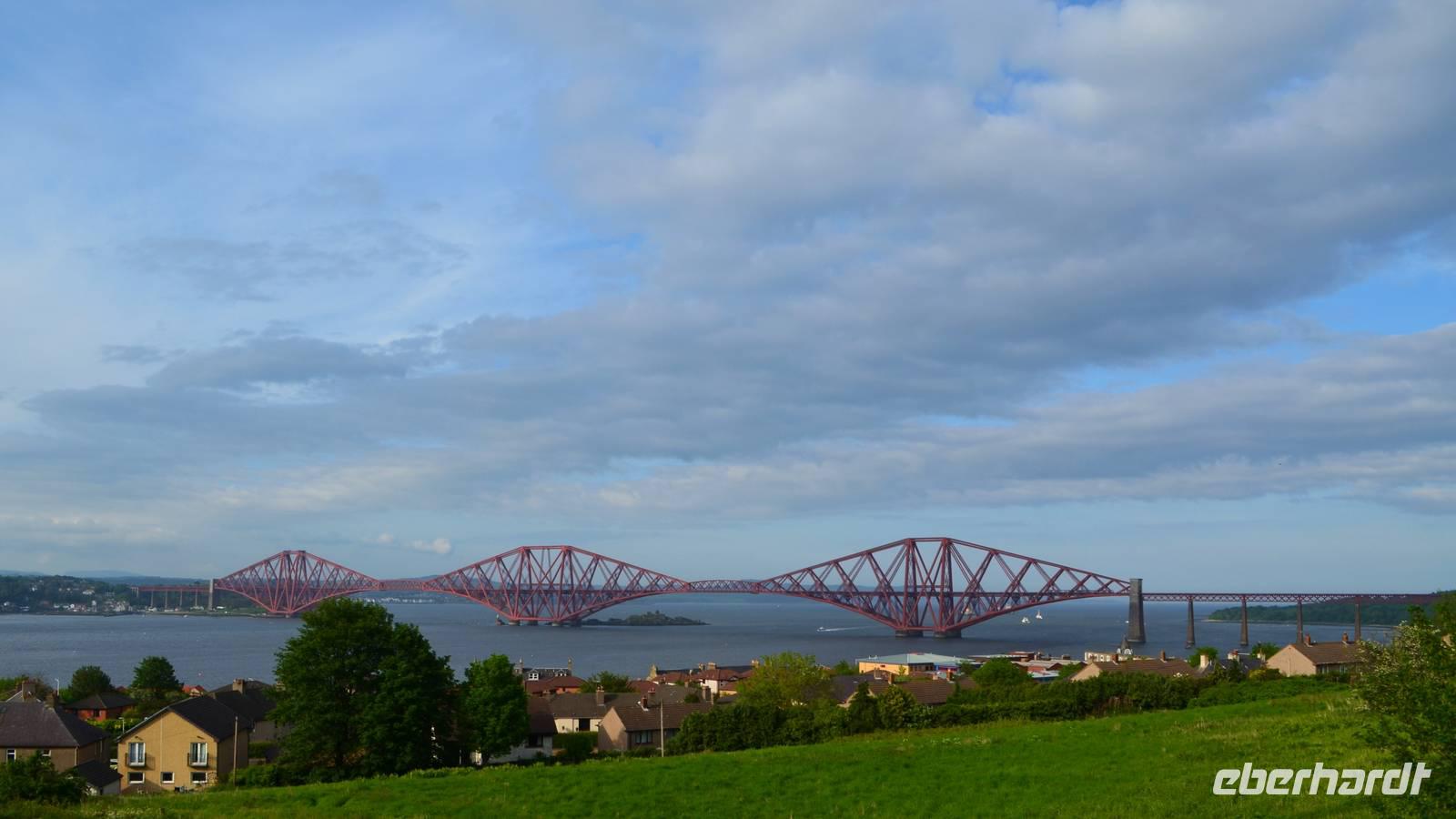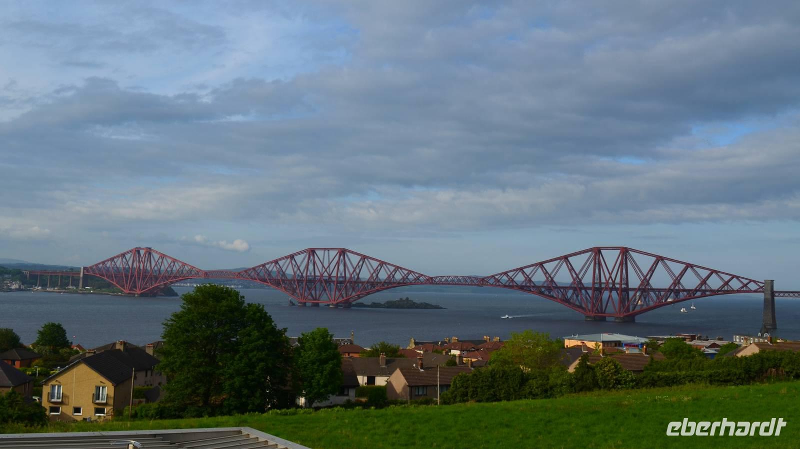 Entlang der Südseite des Firth of Forth fahren wir zur nächsten Sehenswürdigkeit, den Firth of Forth Bridges. Einmal geht die Brückenüberfahrt auf der Forth Road Bridge nach Norden hinüber und wieder zurück, mit Blick auf die tolle Eisenbahnbrücke und die Baustelle der neuen Road Bridge. Ein kurzer Stopp am Aussichtspunkt Three Bridges und dann fahren wir nach Edinburgh hinein, zum Hilton Hotel, das auch für zwei Nächte unser Quartier sein wird.
