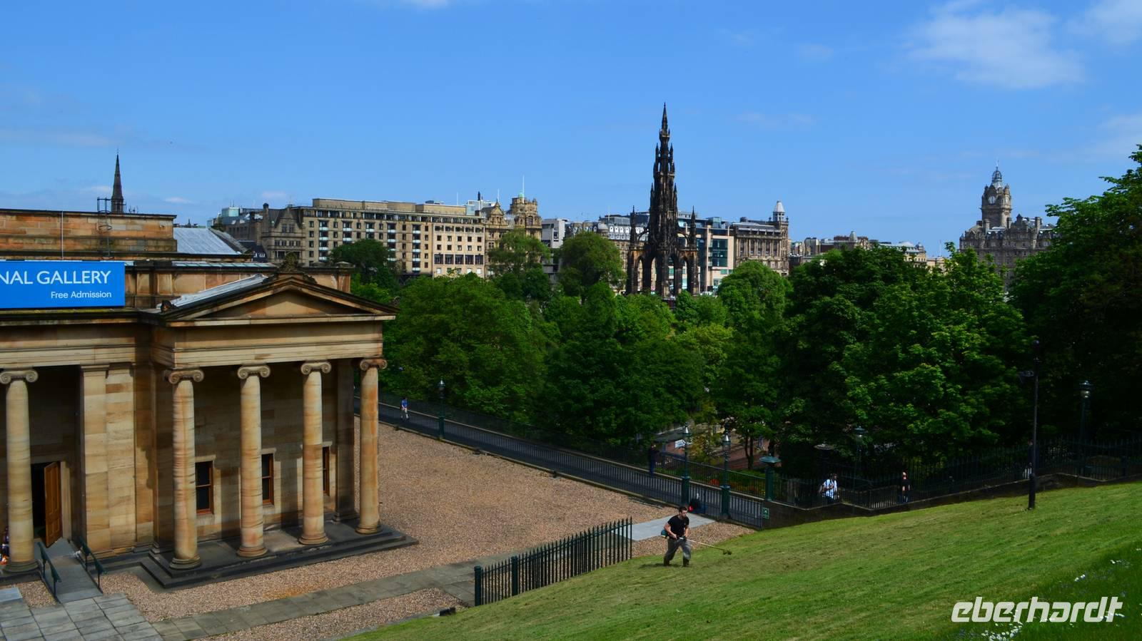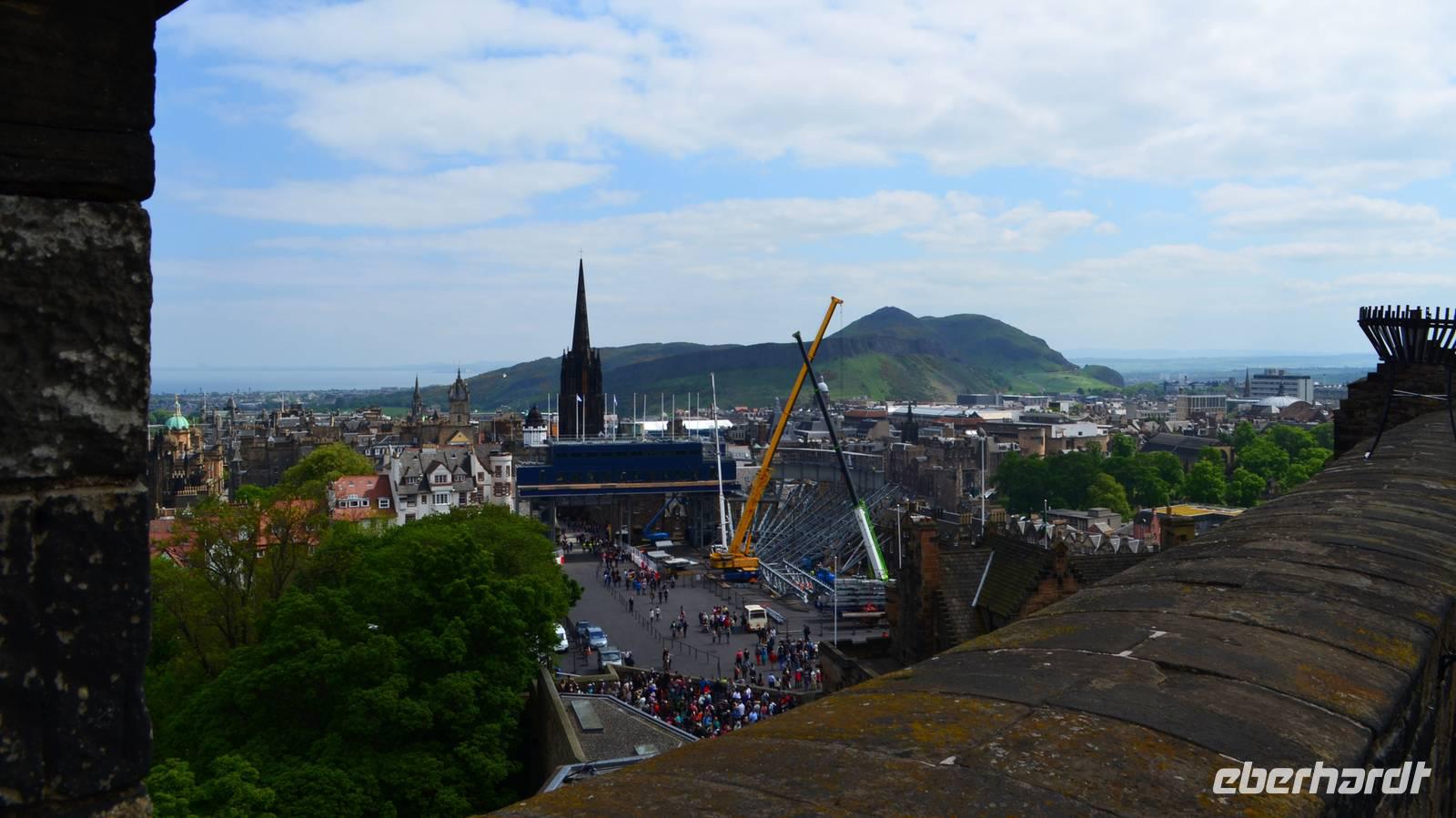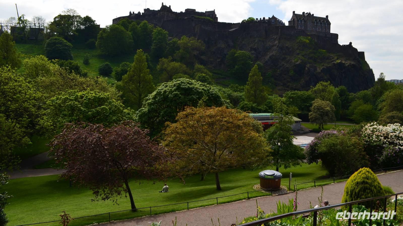 Auf der Royal Meile, unterhalb des Schlosses verlassen wir den Bus und laufen hinauf zum Castle. Die Gästeführerin geht mit ins Schloss und erklärt uns die Gebäude und Ausstellungen. Die Ein-Uhr-Kanone feuert pünktlich und alle haben jetzt Zeit für die individuelle Stadtbesichtigung - bei wunderschönem Wetter.
