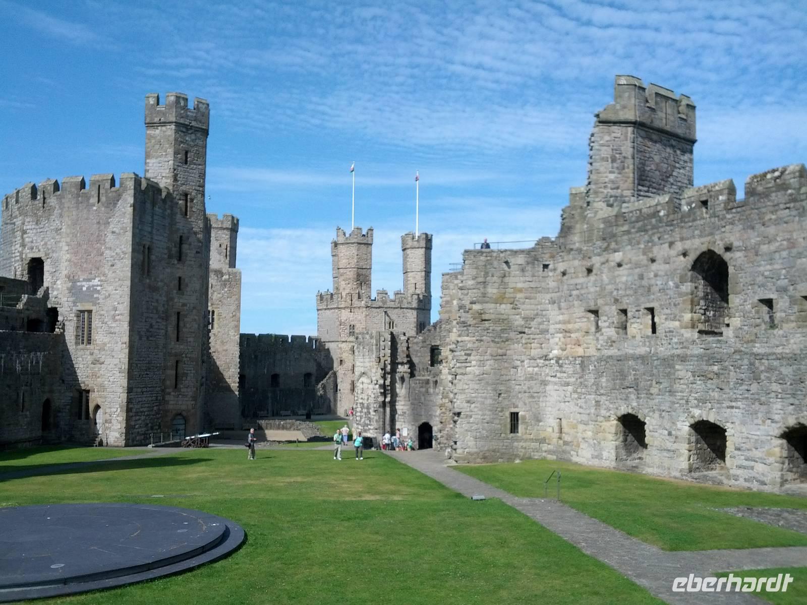 Von Mold, einem kleinen walisischen Ort aus, erkunden wir heute den kleinsten Landesteil Großbritanniens. Die teilweise als Küstenstrasse verlaufende Strasse nach Bangor gibt den Blick auf das Meer frei. Wir sehen mit der Clowyn Bay einen Abschnitt der sommers von zahlreichen Badeurlaubern aufgesucht wird. Die westlichere Conwy Bay begeistert durch den Kontrast der Meeresfläche und der unmittelbar aufragenden Bergen des Snowdonia Nationalparks. In Caernarfon „erobern" wir eine der mächtigsten Burgen der edwardianischen Zeit. Wir besteigen den Eagle Tower und lassen den Blick über die Menai Strait, eine Meeresenge, und den Hafen der Festungsstadt schweifen. Auch die Stelle an welcher Chales zum Prince of Wales gekrönt wurde sowie die dazugehörige Ausstellung interessiert uns.