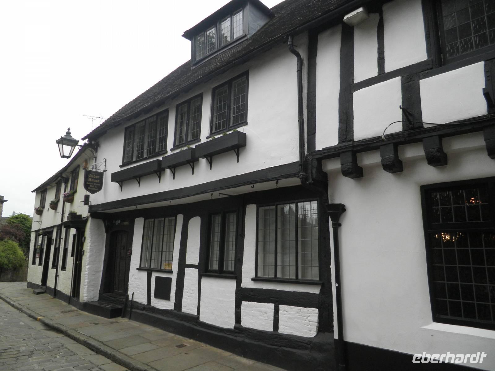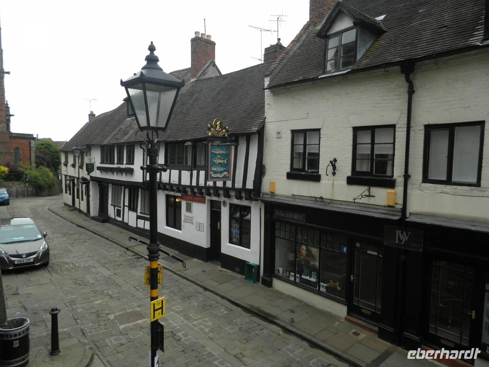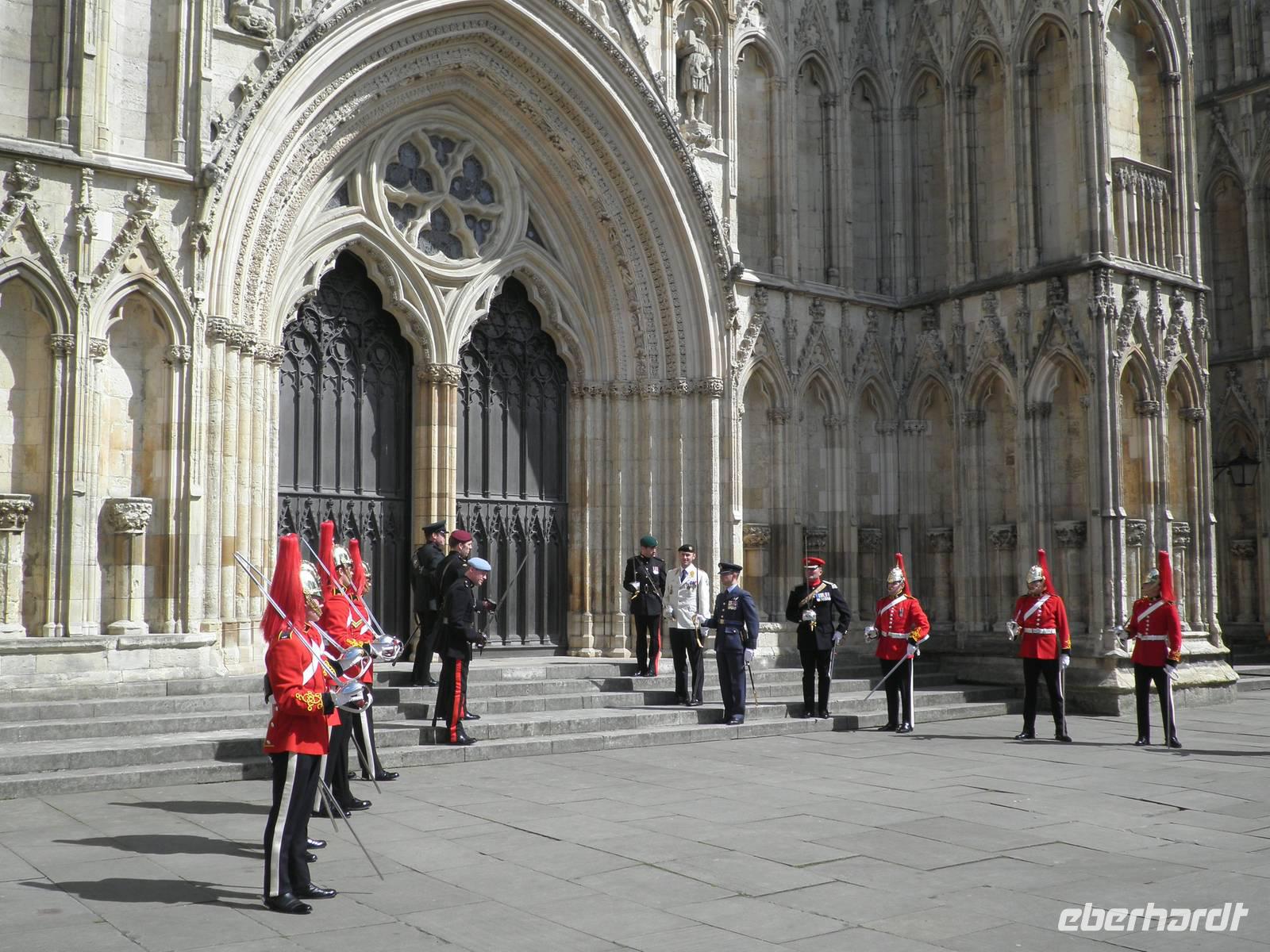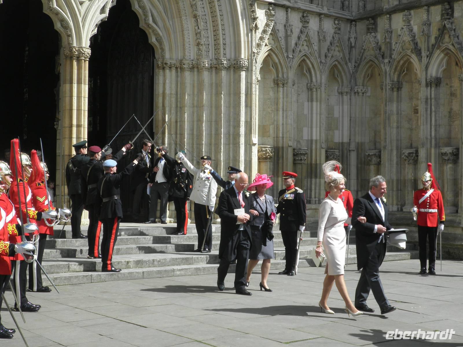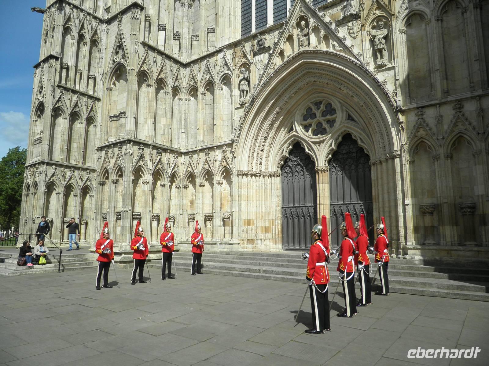 Der letzte Tag auf der Insel war angebrochen. Gemütlich fuhren wir mit unserem Bus in Richtung Süden, hin und wieder hielten wir an für eine Pause, so auch in Jedburg direkt neben der imposanten Ruine der Abtei und an Carters Bar, dem Grenzpunkt zwischen Schottland und England. In York, einer beeindruckenden Stadt mit historischem Stadtkern und berühmtem Minster machten wir eine längere Pause. Wir besichtigten die Altstadt mit ihren Fachwerkhäusern, den berühmten Shambles, einige besuchten das Minster, das schon von außen ein beeindruckendes Bauwerk ist. Gerade, als wir ankamen, trat ein frisch vermähltes Hochzeitspaar samt Feiergesellschaft mit den tollsten Hüten auf den Damenköpfen aus dem Portal des Minsters.