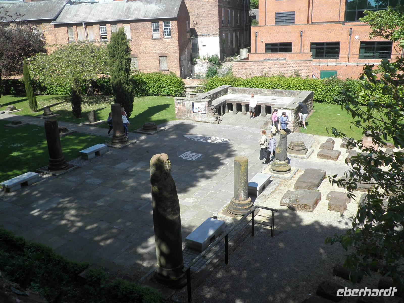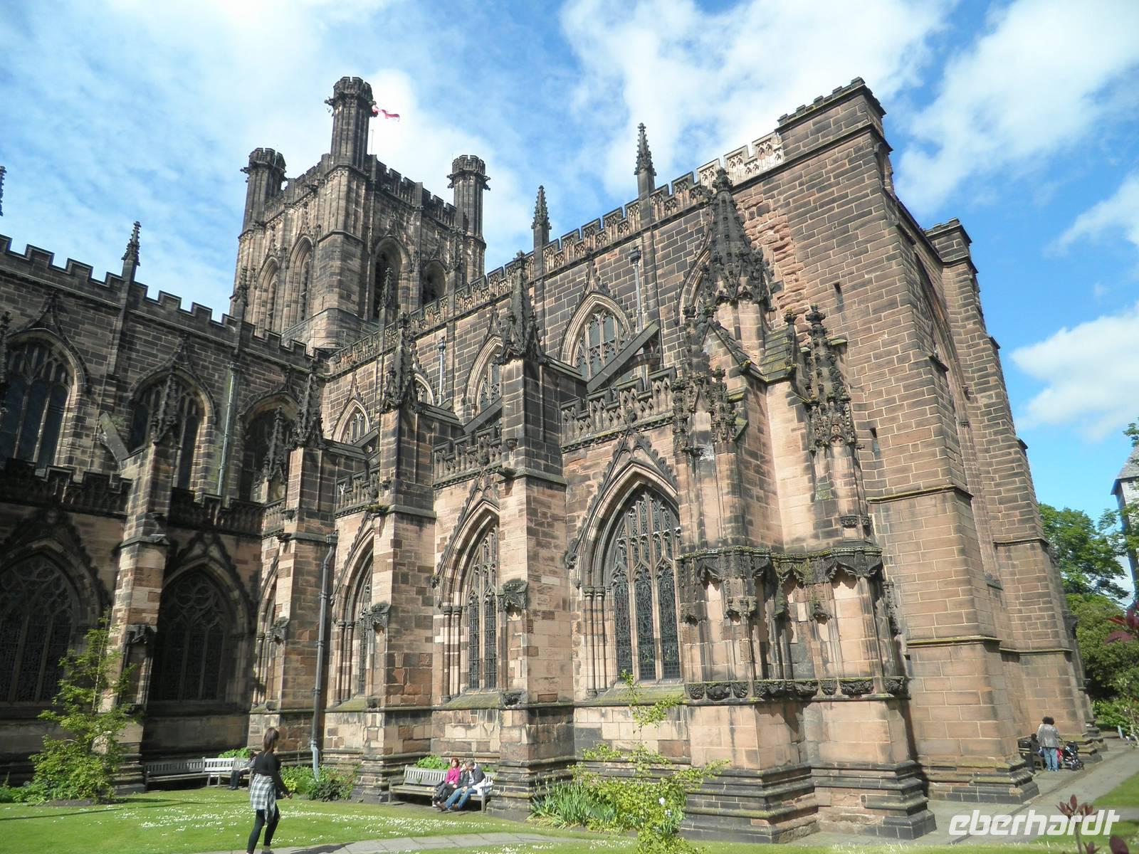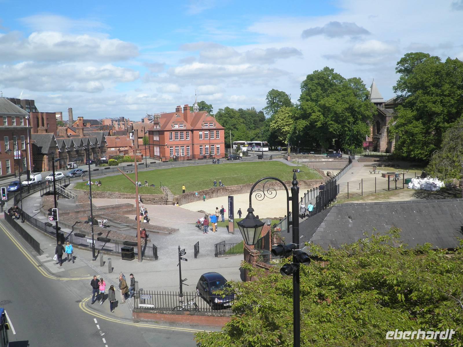 In Anschluss fuhren wir nach Chester, wo unsere Gruppe von unserem Stadtführer Peter abgeholt wurde. Bei einem Spaziergang durch Chester zeigte und erklärte er uns auf amüsante Weise diese herrliche Stadt. Wir sahen zum Beispiel die Rows, das sind überdachte Arkaden im 1. Stock, durch die man trockenen Fußes wandeln und dabei einkaufen kann. Wir hörten Anekdoten aus Chesters Vergangenheit und Gegenwart. Einer der Höhepunkte dieses Tages war ein landestypischer Besuch in einem traditionellen Tearoom, wir probierten englischen Tee mit Scones (leckeres Gebäck), clotted creme (Schlagrahm) und Erdbeermarmelade.