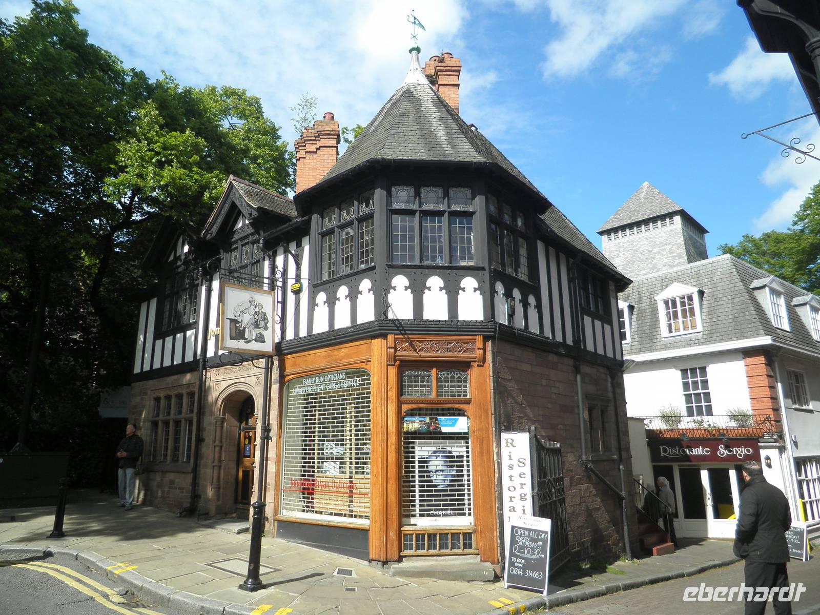 Weiter ging's nach Shrewsbury, einer Stadt mit vielen Fachwerkhäusern, einem Castle und darüber hinaus die Geburtsstadt Charles Darwins. Hier bot sich ein kleiner Spaziergang durch die Altstadt an. Wir gingen bis zum Castle und zur Bibliothek, vor der Charles Darwins Statue auf einem Sockel sitzt und in einer Zeitung blättert.