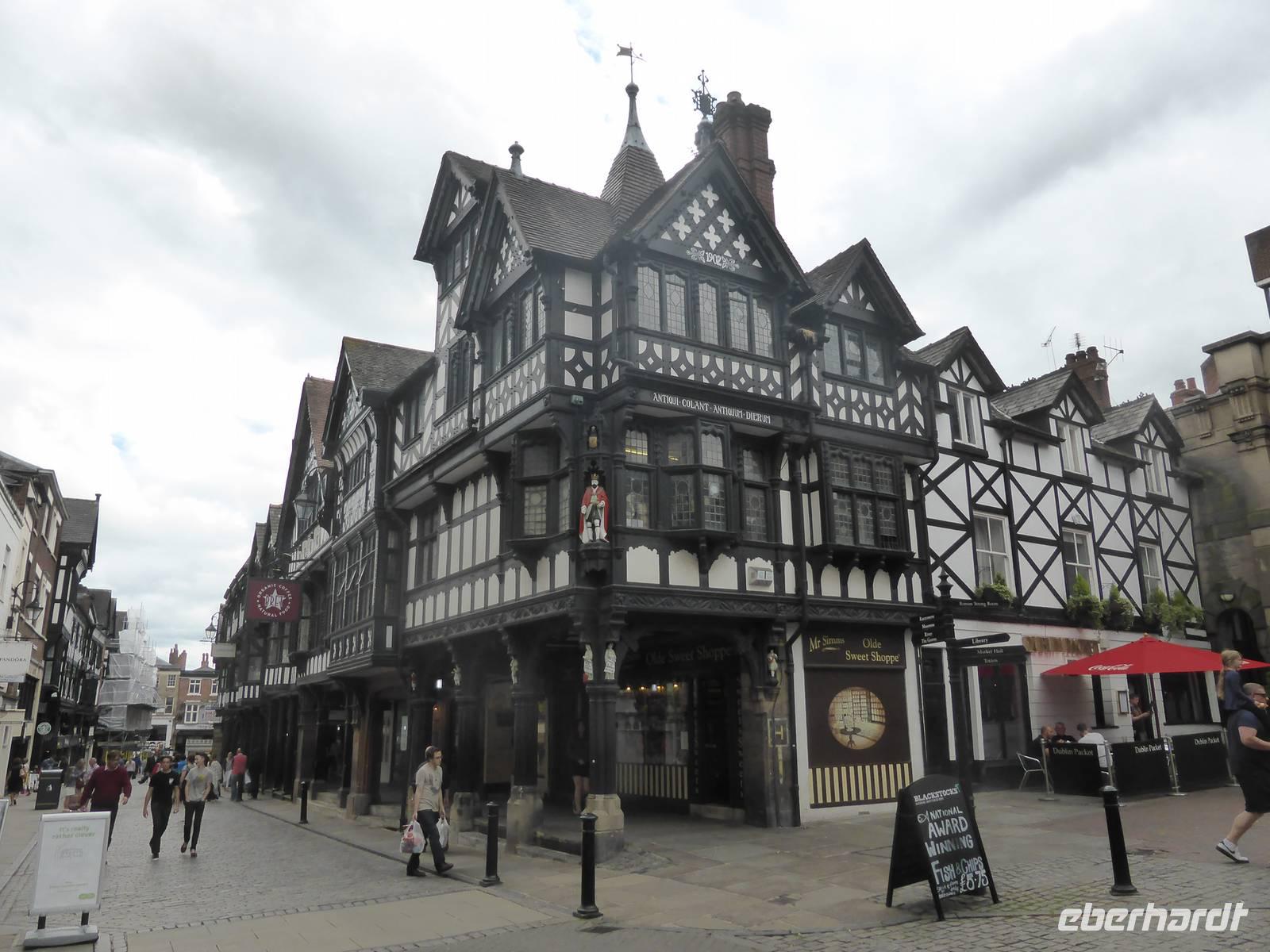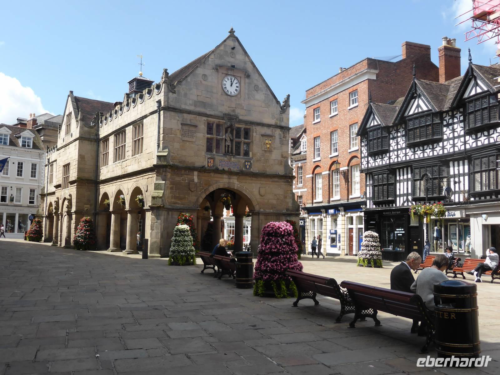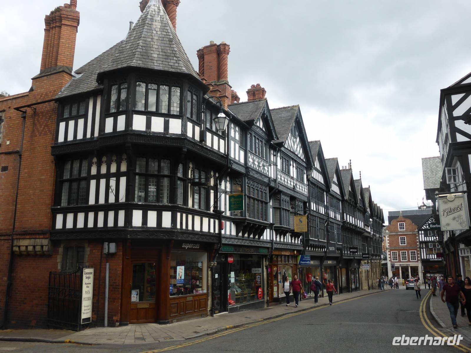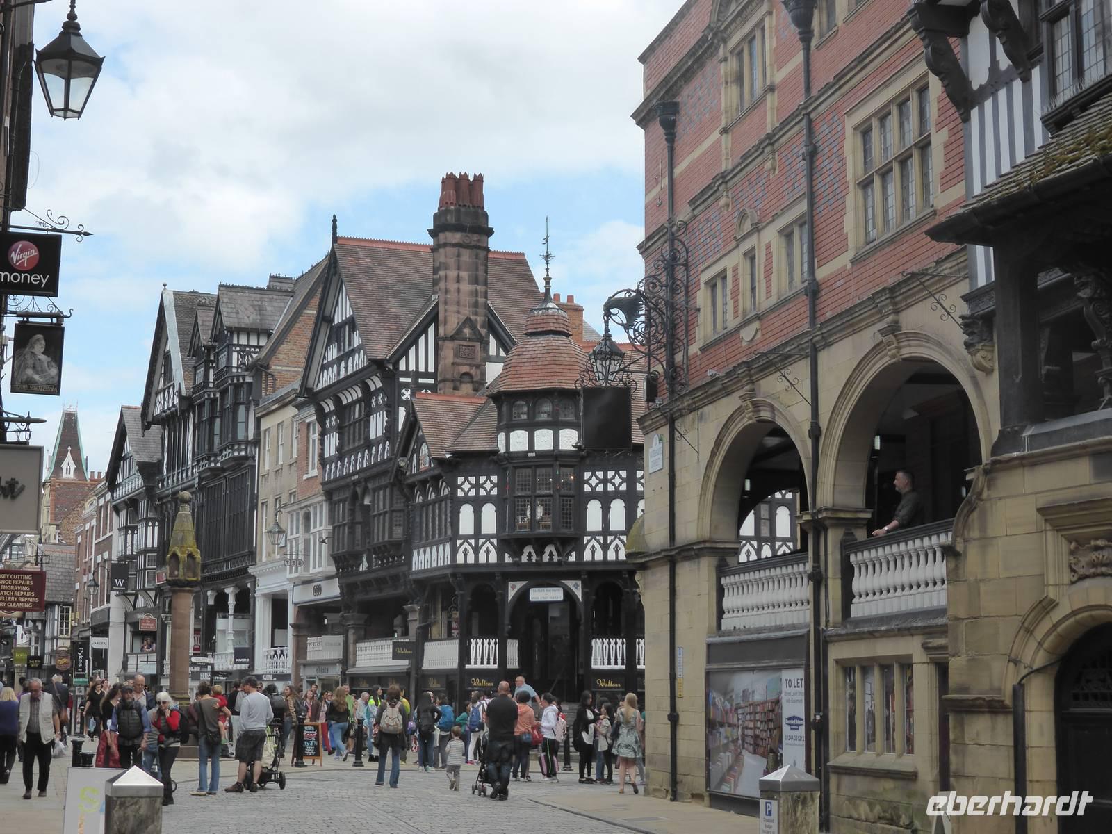 Unsere Mittagspause verbrachten wir im wunderschönen Tudorstädtchen Shrewsbury an einer Schlinge des Flusses Severn. Die Stadt spielte eine wichtige Rolle in den Kriegen der englischen Könige gegen die Waliser. In der Geburtsstadt von Charles Darwin sahen wir die Old Market Hall am Square Platz sowie die schmucken Gassen der Altstadt. Ein weiterer Höhepunkt dieser Reise erwartete uns am Nachmittag. Bei einem sehr abwechslungsreichen Stadtrundgang mit unseren örtlichen Stadtführern Peter und Elvie besichtigten wir Chester. Zwei Besonderheiten machen Chester zu einer der sehenswertesten Städte Nordenglands: die Fachwerkarkaden, Rows genannt sowie die gut erhaltene Stadtmauer. Chester bietet in England die einzige Möglichkeit, einen kompletten Rundgang auf einer mittelalterlichen Stadtmauer durchzuführen. Wir bummelten einen Teil dieser Stadtmauer entlang und genossen die Aussicht auf den Fluss Dee sowie die Umgebung. Beeindruckt waren wir von den zweigeschossigen Arkadengängen, The Rows. Diese Konstruktion ist in England trotz des feuchten Klimas eine Seltenheit. Fasziniert waren wir auch von filigran verzierten Uhr zum 60jährigen Jubiläum der Queen Victoria am Eastgate.