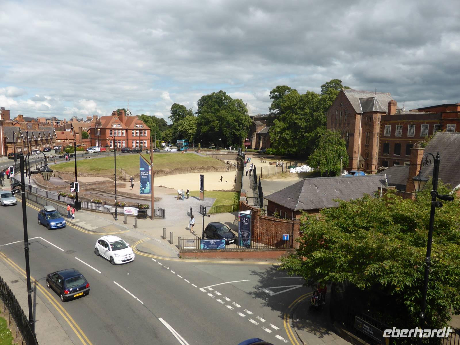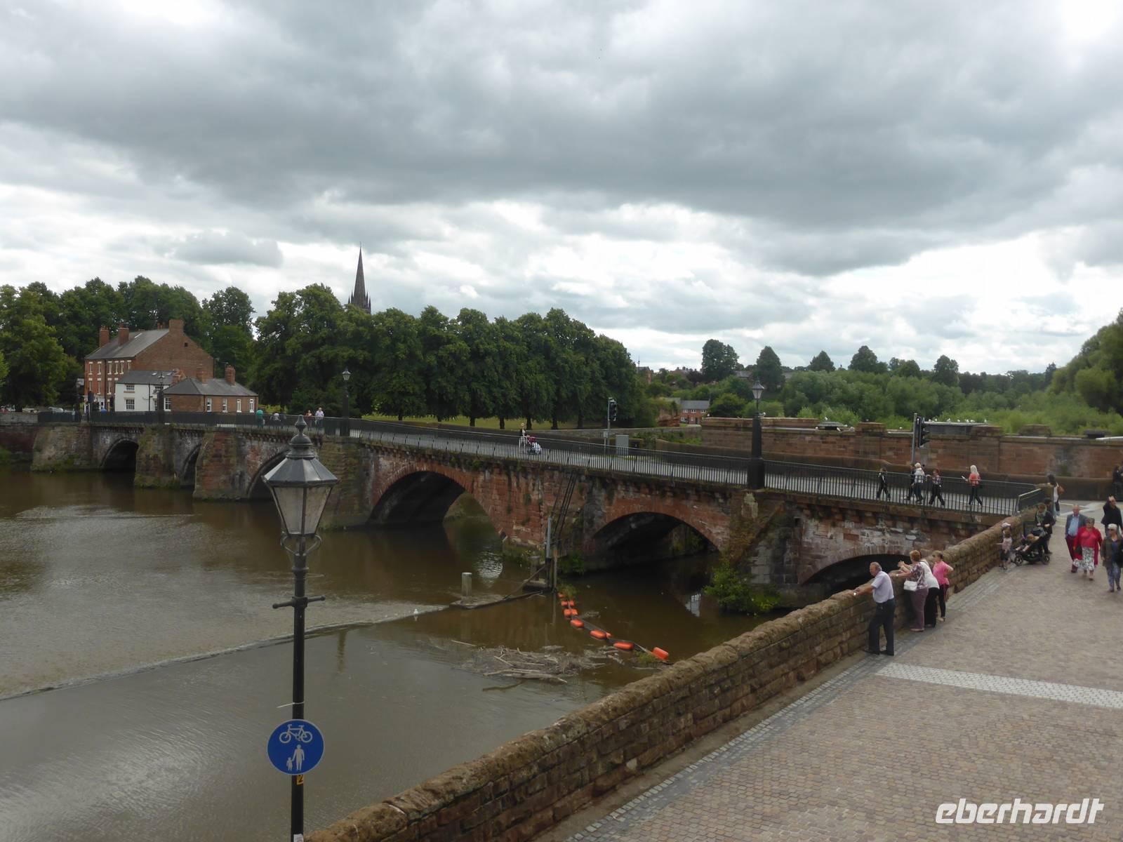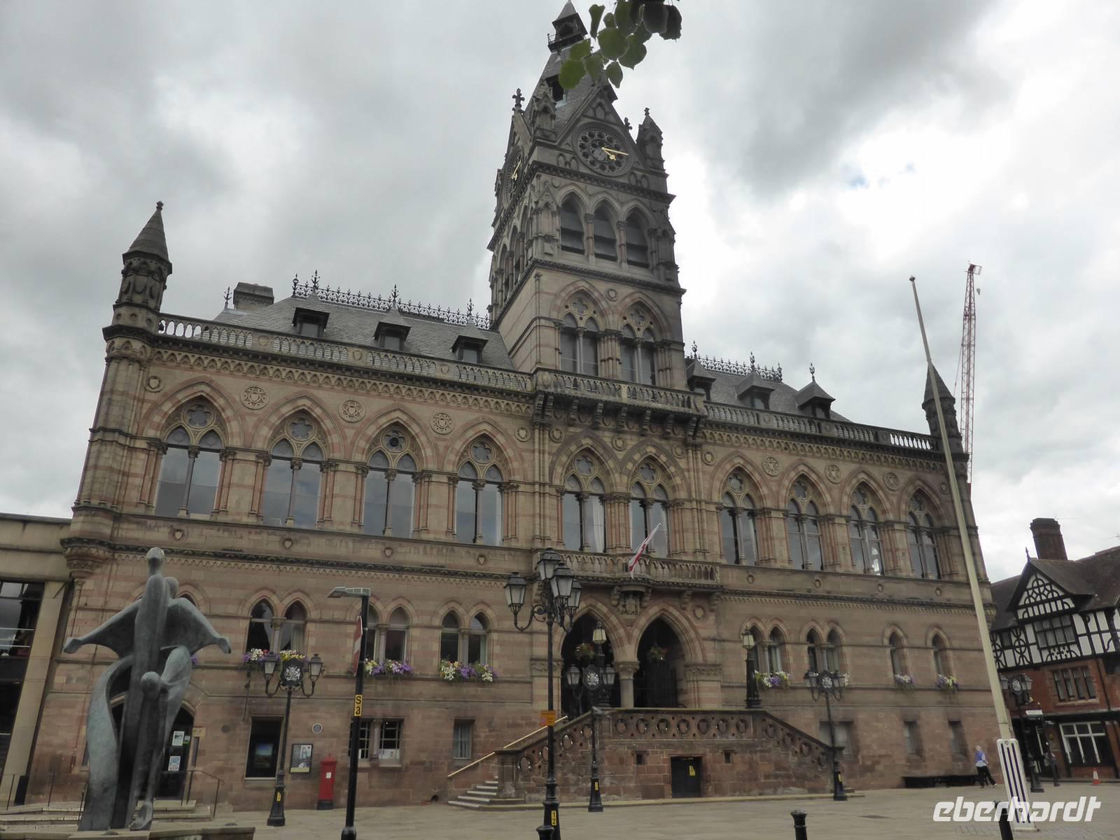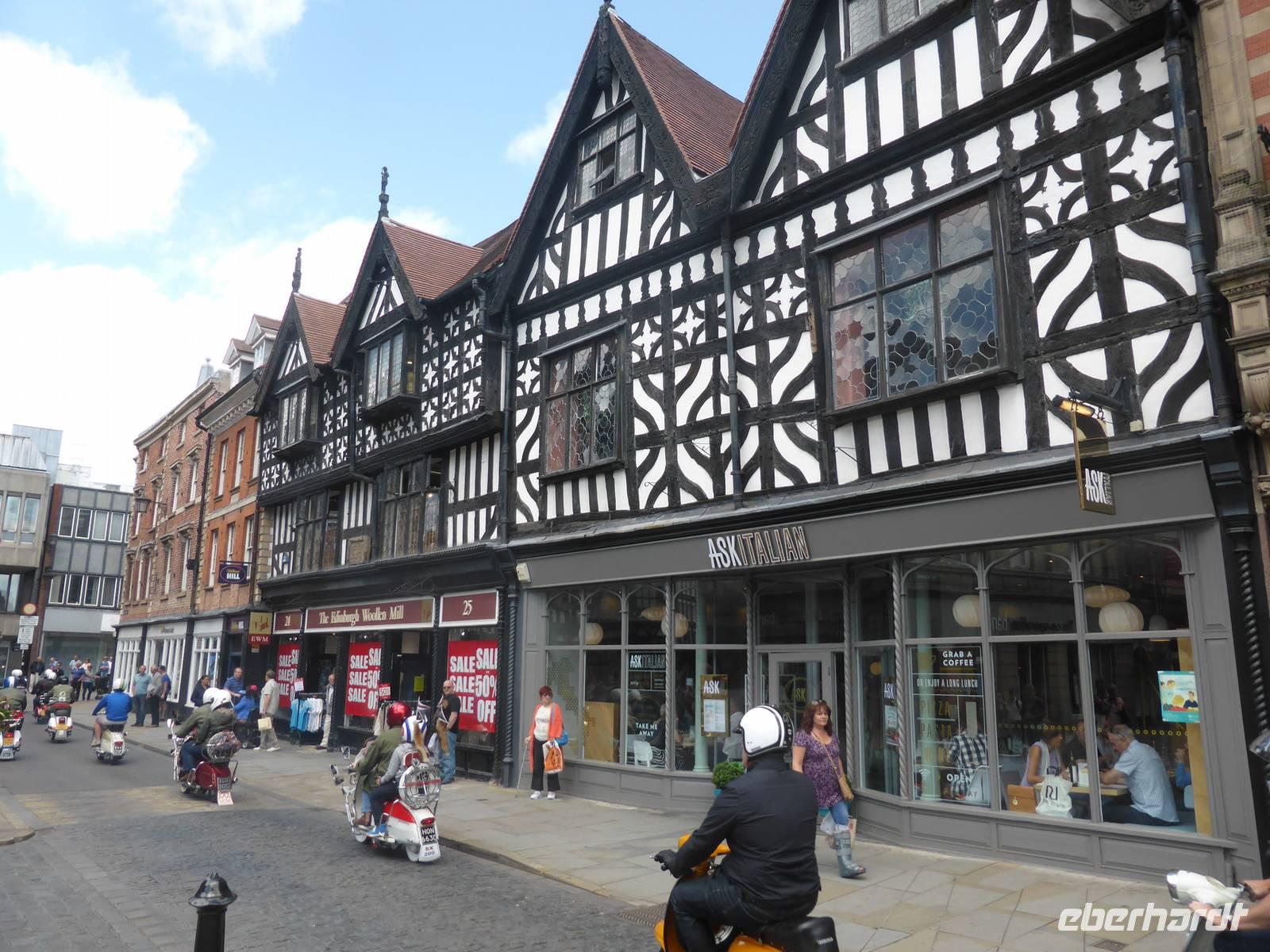 Unsere Mittagspause verbrachten wir im wunderschönen Tudorstädtchen Shrewsbury an einer Schlinge des Flusses Severn. Die Stadt spielte eine wichtige Rolle in den Kriegen der englischen Könige gegen die Waliser. In der Geburtsstadt von Charles Darwin sahen wir die Old Market Hall am Square Platz sowie die schmucken Gassen der Altstadt. Ein weiterer Höhepunkt dieser Reise erwartete uns am Nachmittag. Bei einem sehr abwechslungsreichen Stadtrundgang mit unseren örtlichen Stadtführern Peter und Elvie besichtigten wir Chester. Zwei Besonderheiten machen Chester zu einer der sehenswertesten Städte Nordenglands: die Fachwerkarkaden, Rows genannt sowie die gut erhaltene Stadtmauer. Chester bietet in England die einzige Möglichkeit, einen kompletten Rundgang auf einer mittelalterlichen Stadtmauer durchzuführen. Wir bummelten einen Teil dieser Stadtmauer entlang und genossen die Aussicht auf den Fluss Dee sowie die Umgebung. Beeindruckt waren wir von den zweigeschossigen Arkadengängen, The Rows. Diese Konstruktion ist in England trotz des feuchten Klimas eine Seltenheit. Fasziniert waren wir auch von filigran verzierten Uhr zum 60jährigen Jubiläum der Queen Victoria am Eastgate.