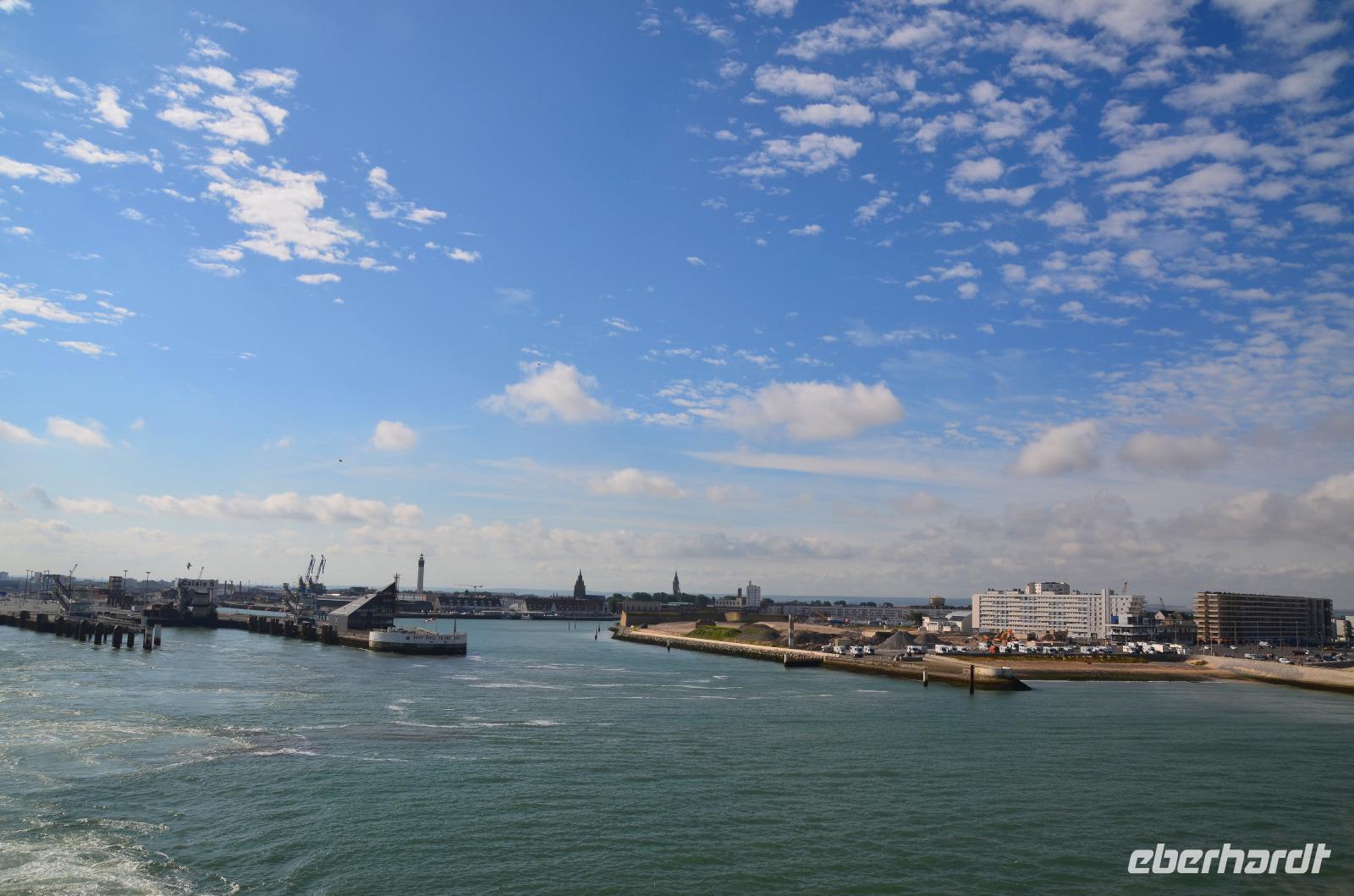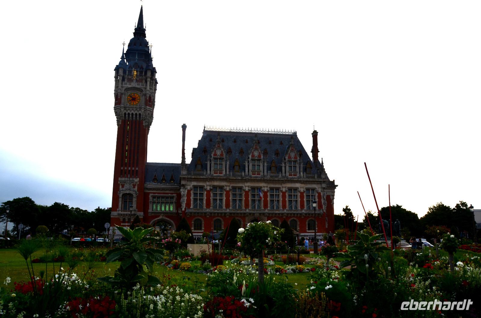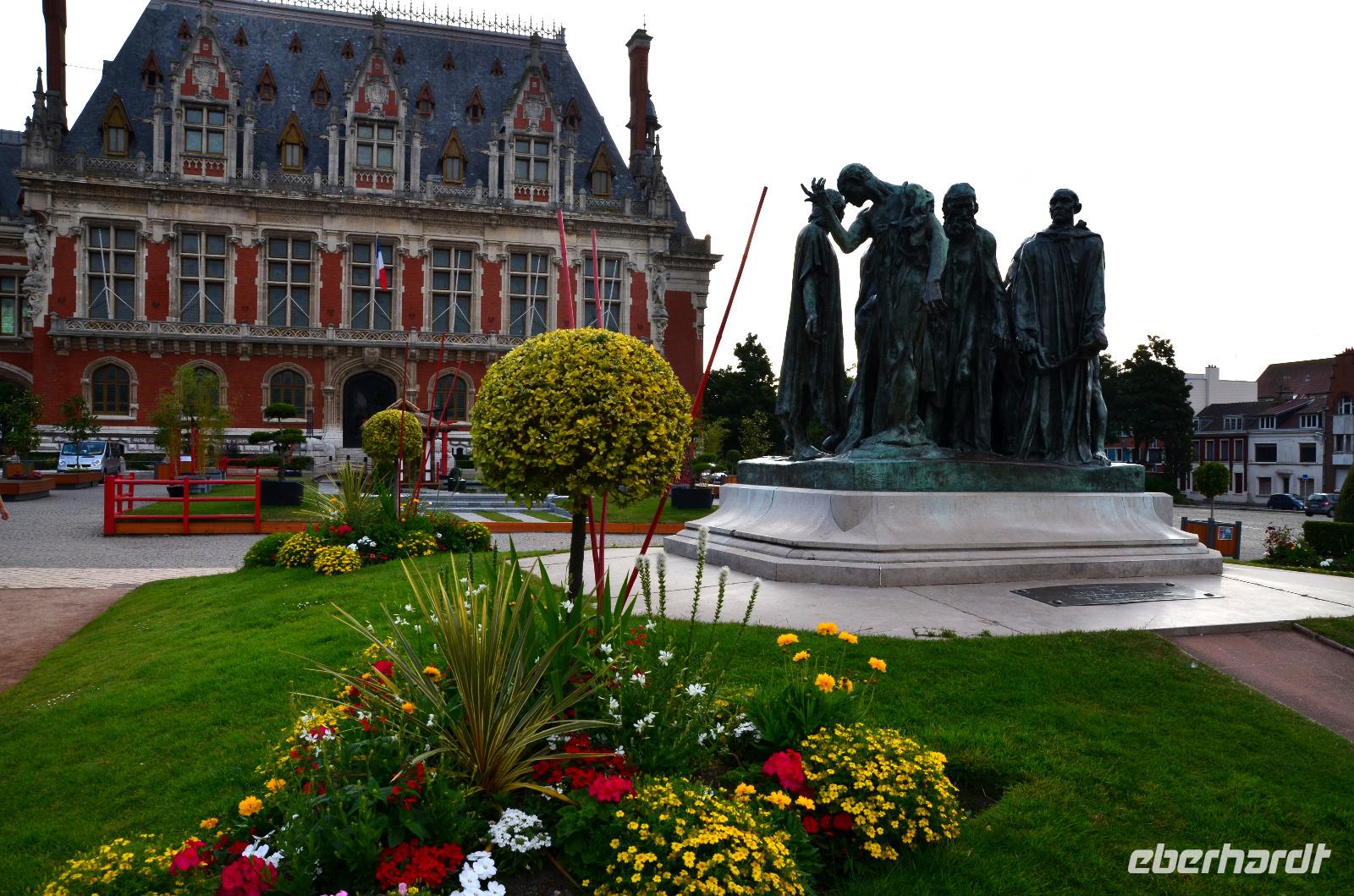 Das Wetter war verlockend schön als wir zum Fährhafen durch die Innenstadt von Calais, vorbei am Theater, durch die Einkaufsstraße zum Rathaus fuhren. Hier machten wir einen Fotostopp, um das in der flanderischen Gotik erbaute Prunkvolle Gebäude zu bewundern. Die Rabatten der Grünanlagen waren wieder überwältigend schön gestaltet und vor Rudins Denkmal der 6 Helden verneigten wir uns ehrfurchtsvoll.