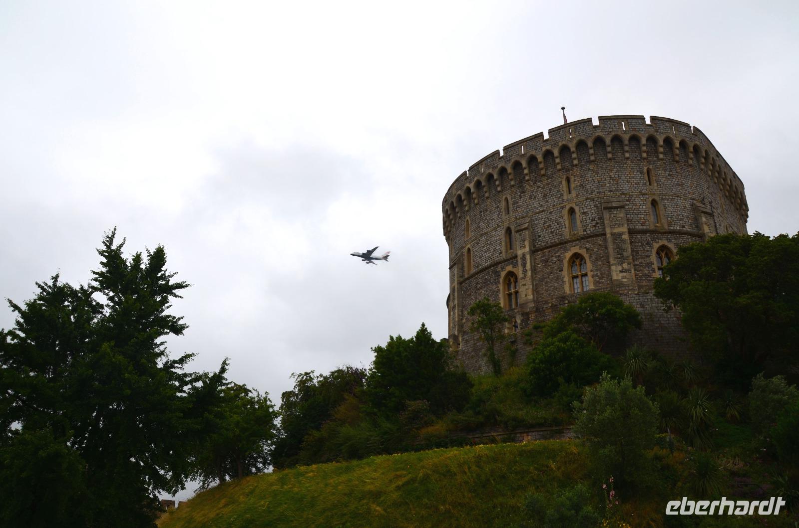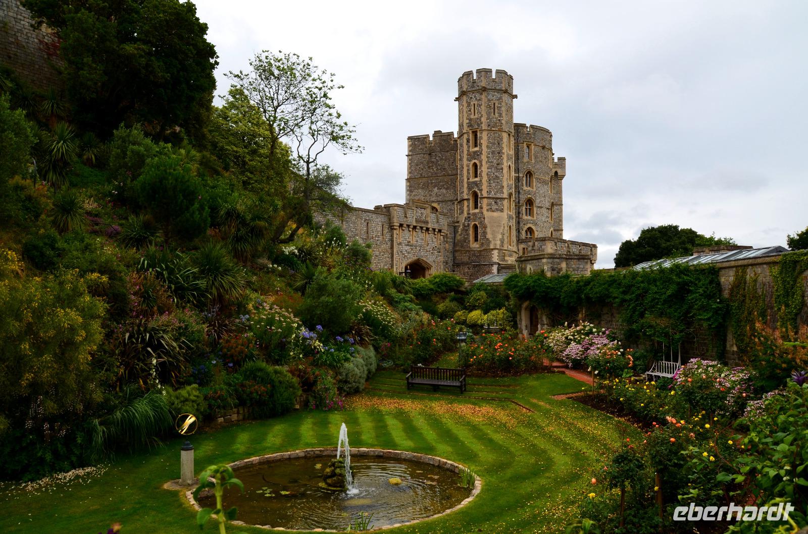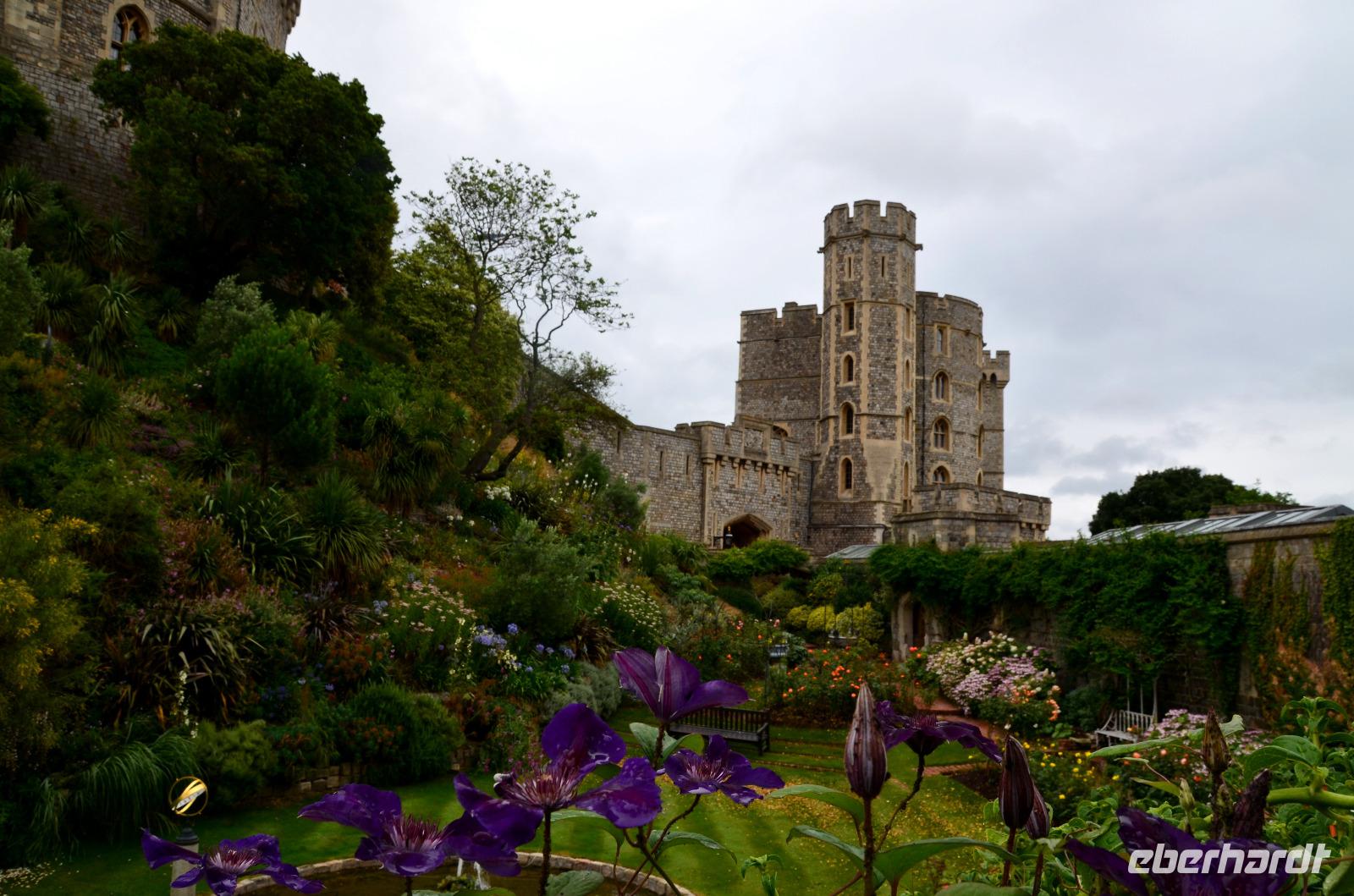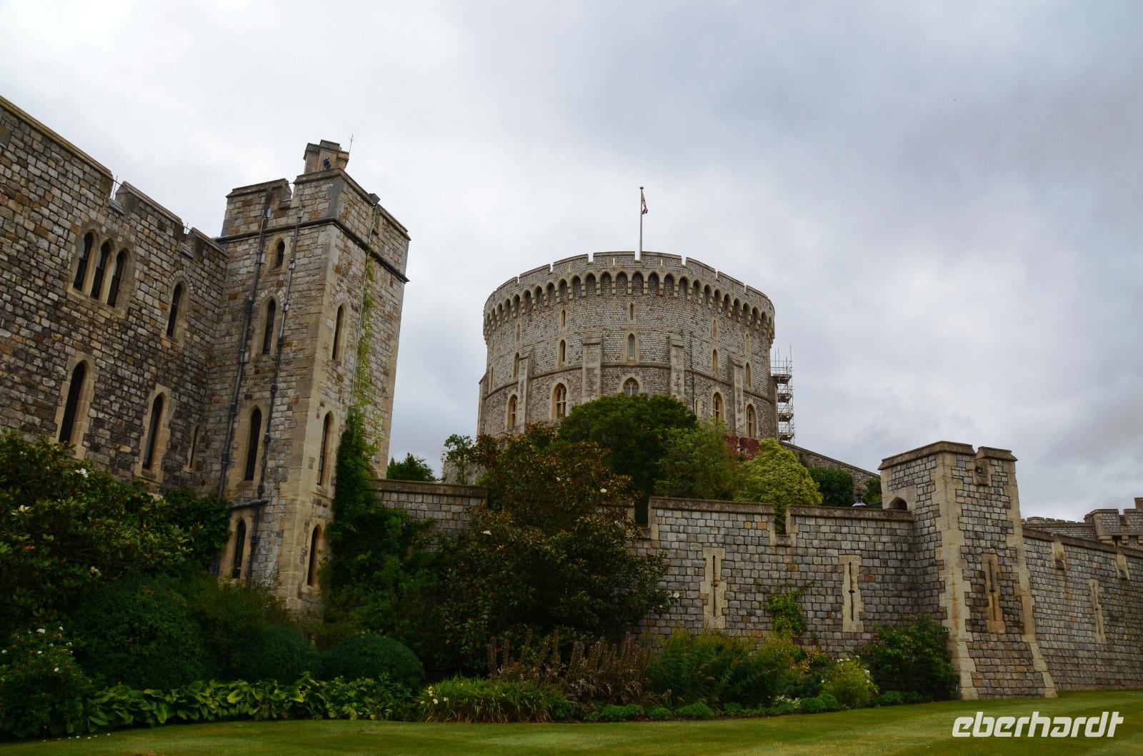 Vom Windsor Coach-Parkplatz spazierten wir über die Treppen zum Bahnhof hinauf, auf dem Bahnsteig bis zur alten Lok von Queen Victoria, weiter durch Fußgängerzone Richtung Castle, jetzt aber erst durch die Gassen der Stadt und mit ihren Sehenswürdigkeiten, wie dem Rathaus von Christopher Wren, dem Schiefen Haus und der kürzesten Straße Englands. Am Besucherzentrum des Castles gab es sehr viel Andrang, dadurch etwas Wartezeit aber dann eroberten wir ausgestattet mit Orientierungsplänen und Audioguides die weitläufige Schlossanlage.