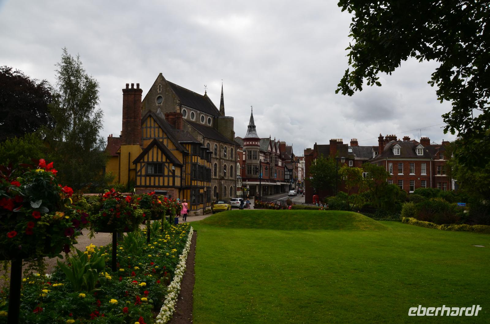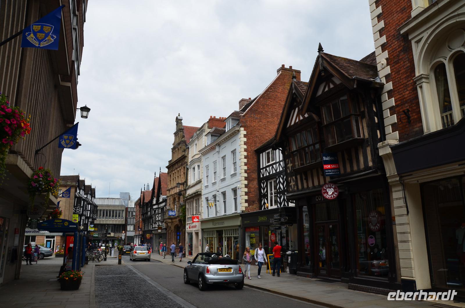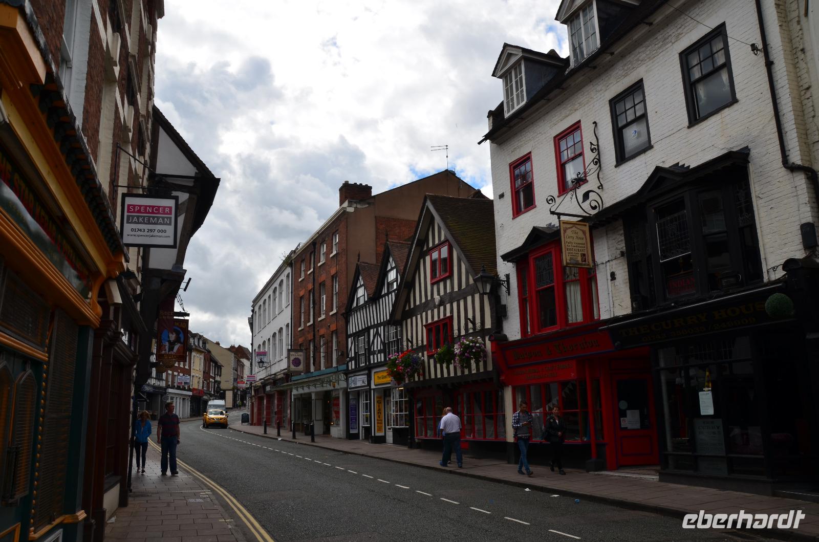 Die Weiterfahrt führt über die Landstraße entlang dem River Severn nach Shrewsbury, der einst bedeutenden Stadt an der waliser Grenze. Wir laufen zum „Alten Haus, über den Markt und durch die hübschen Gassen mit den alten Fachwerkhäusern zum Castle. Die Geburtsstadt Darwins ist auch mehrfach ausgezeichnete Blumenstadt Englands.