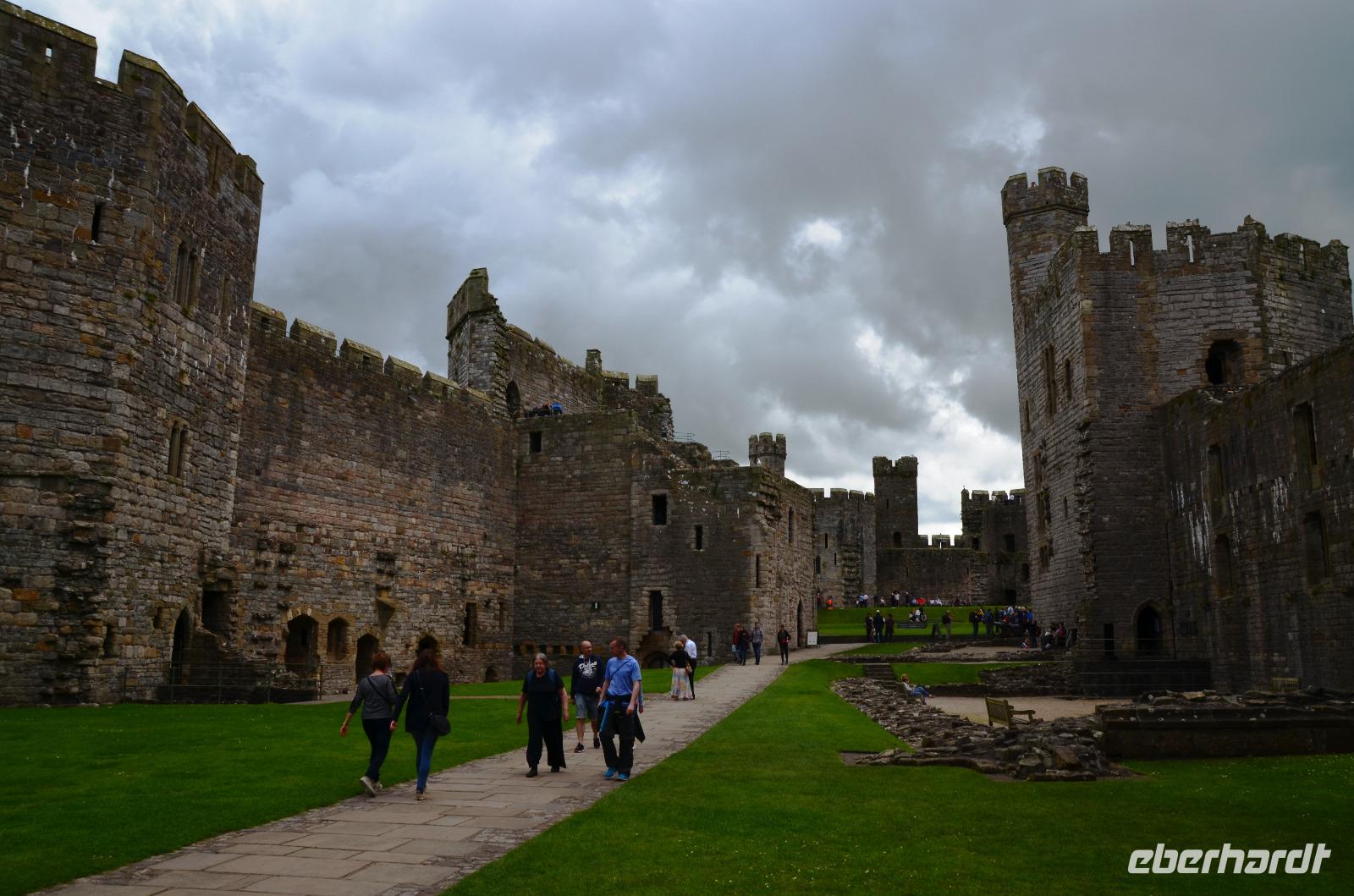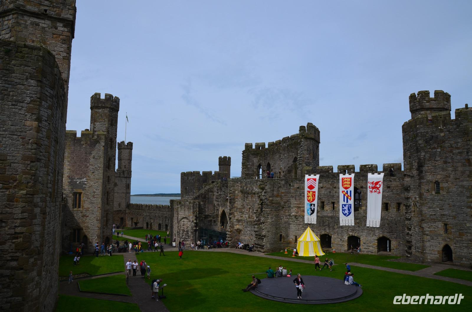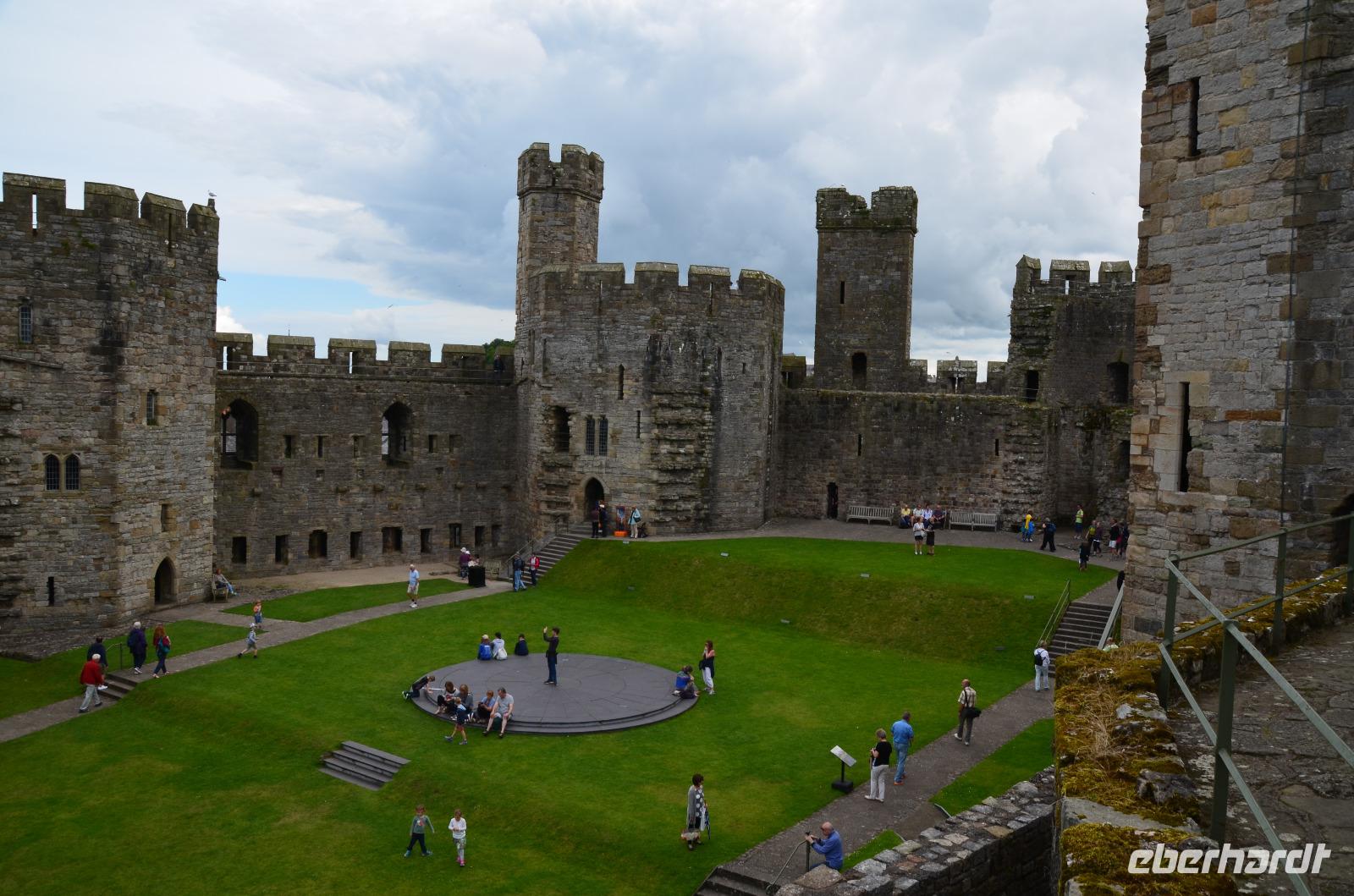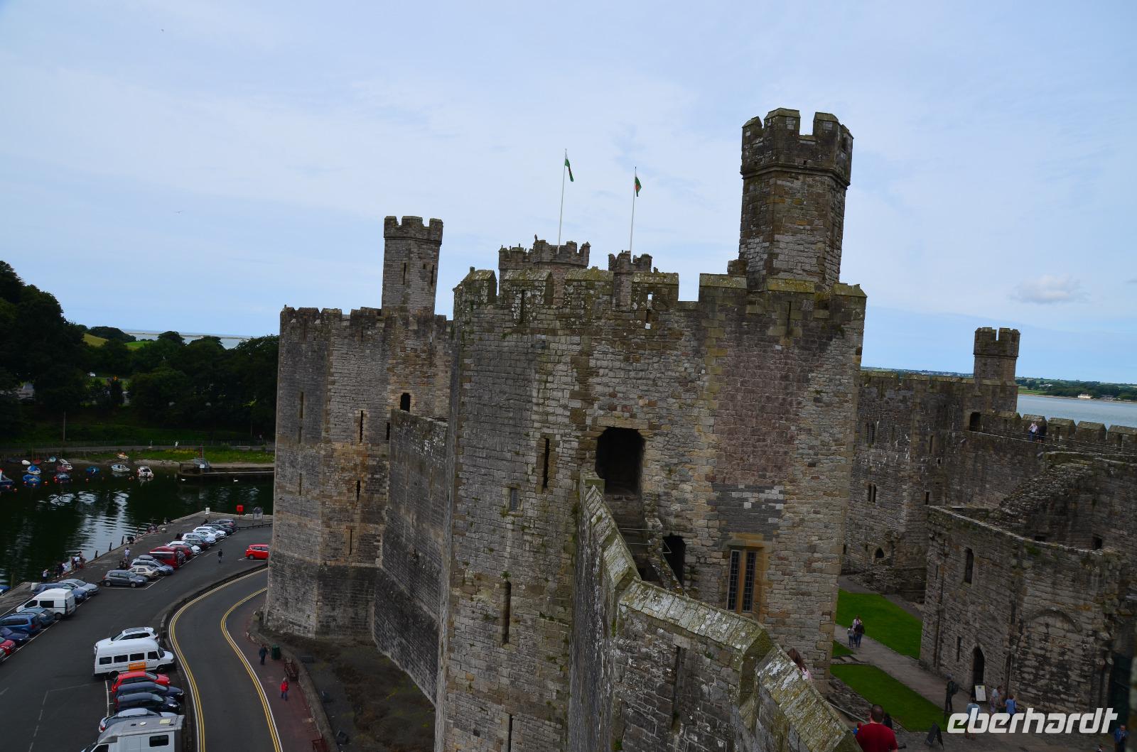 Von hier geht se durch das Stadttor weiter nach Südwesten, bis zur Insel Anglessy. Über die Britannia Bridge fahren wir hinüber zum Ort mit dem längsten Namen der Welt. Eine Waliserin aus Visitor Center sagt uns den unaussprechlichen Namen. Später die Rückfahrt über die Britannia Bridge und nach Caernarfon. Durch die Stadtmauer gehen wir gemeinsam zum Castle. Die schwarzen, rund angeordnete Schieferplatten in der Mitte des Rasens im Schlosshof waren die Bühne für die Krönung von Charles zum Prince of Wales im Jahre 1969. Im oberen Turm (Stadtseite) können wir einer Filmvorführung zur Geschichtefolgen, im unteren Turm einer Ausstellung zu den waliser Königen und über die Treppen Mauern und Türme kann man fast jeden Winkel der für ihre Zeit modernen Anlage erreichen. Immerhin gab es schon Glasfenster und eine Wasserkunst.