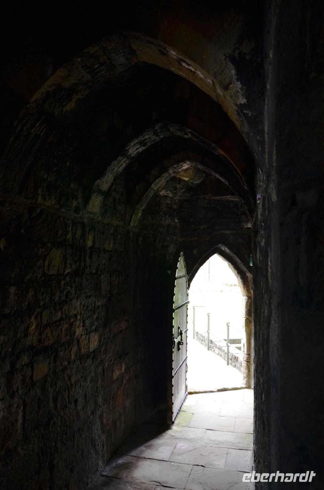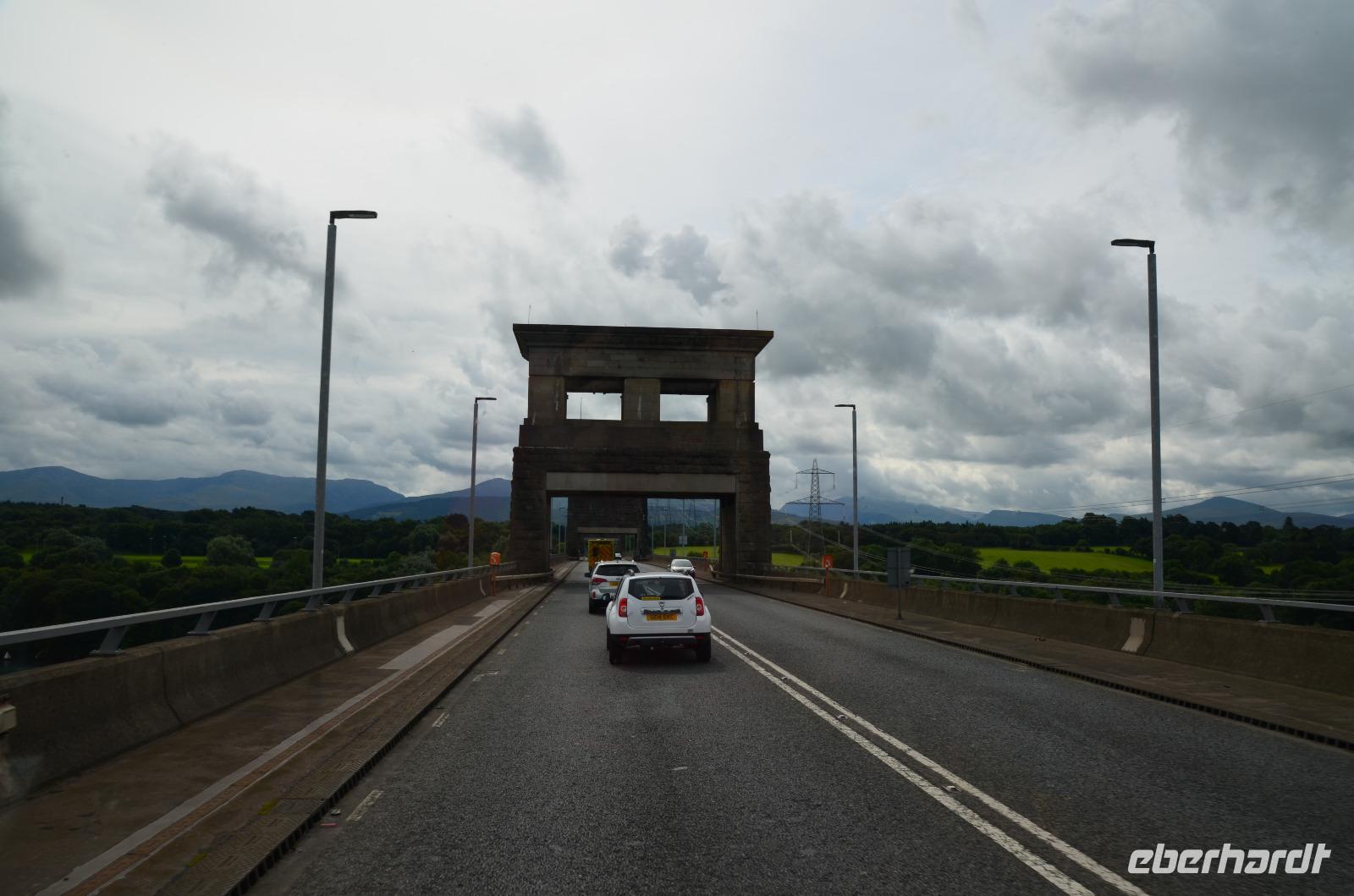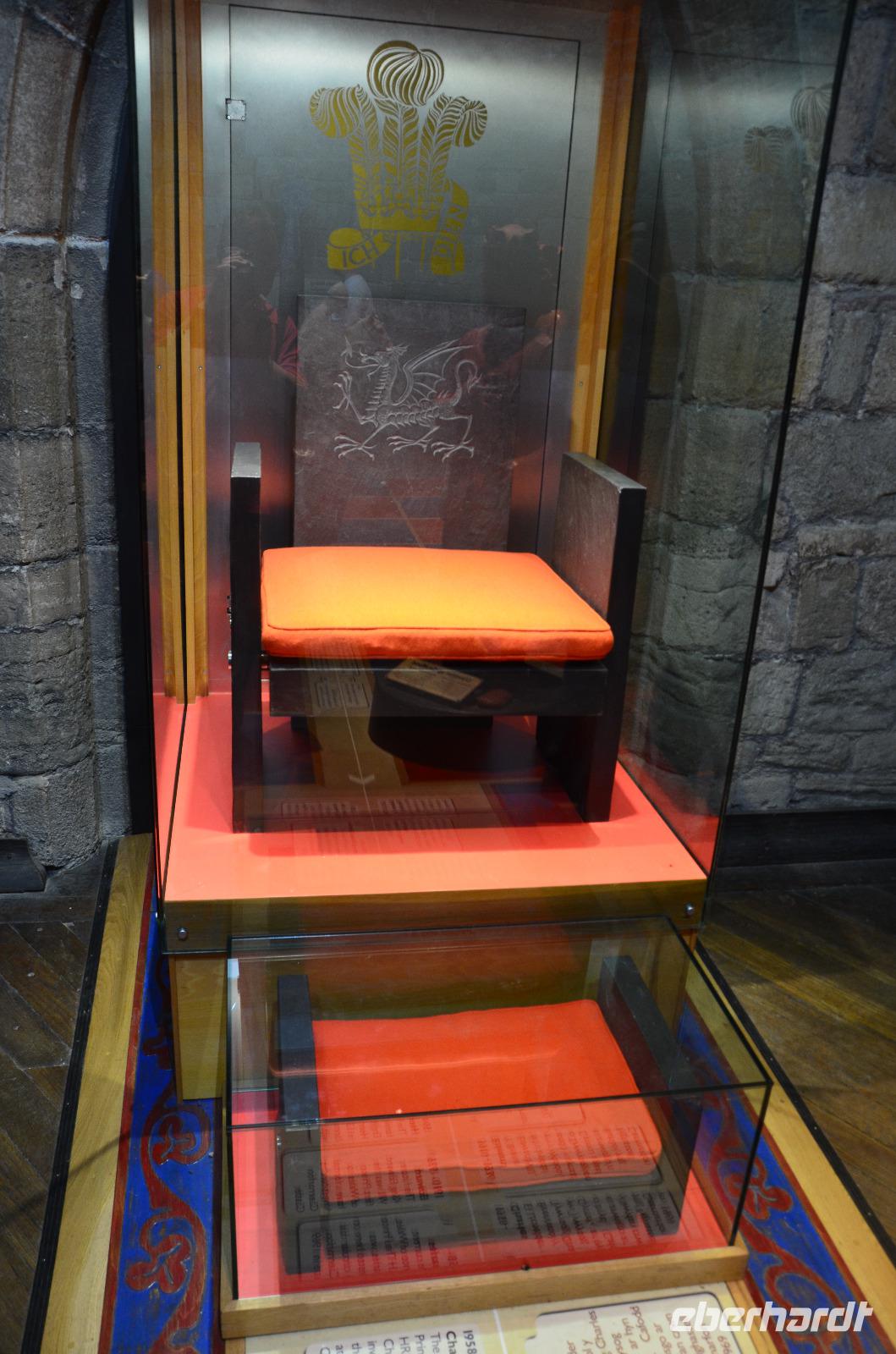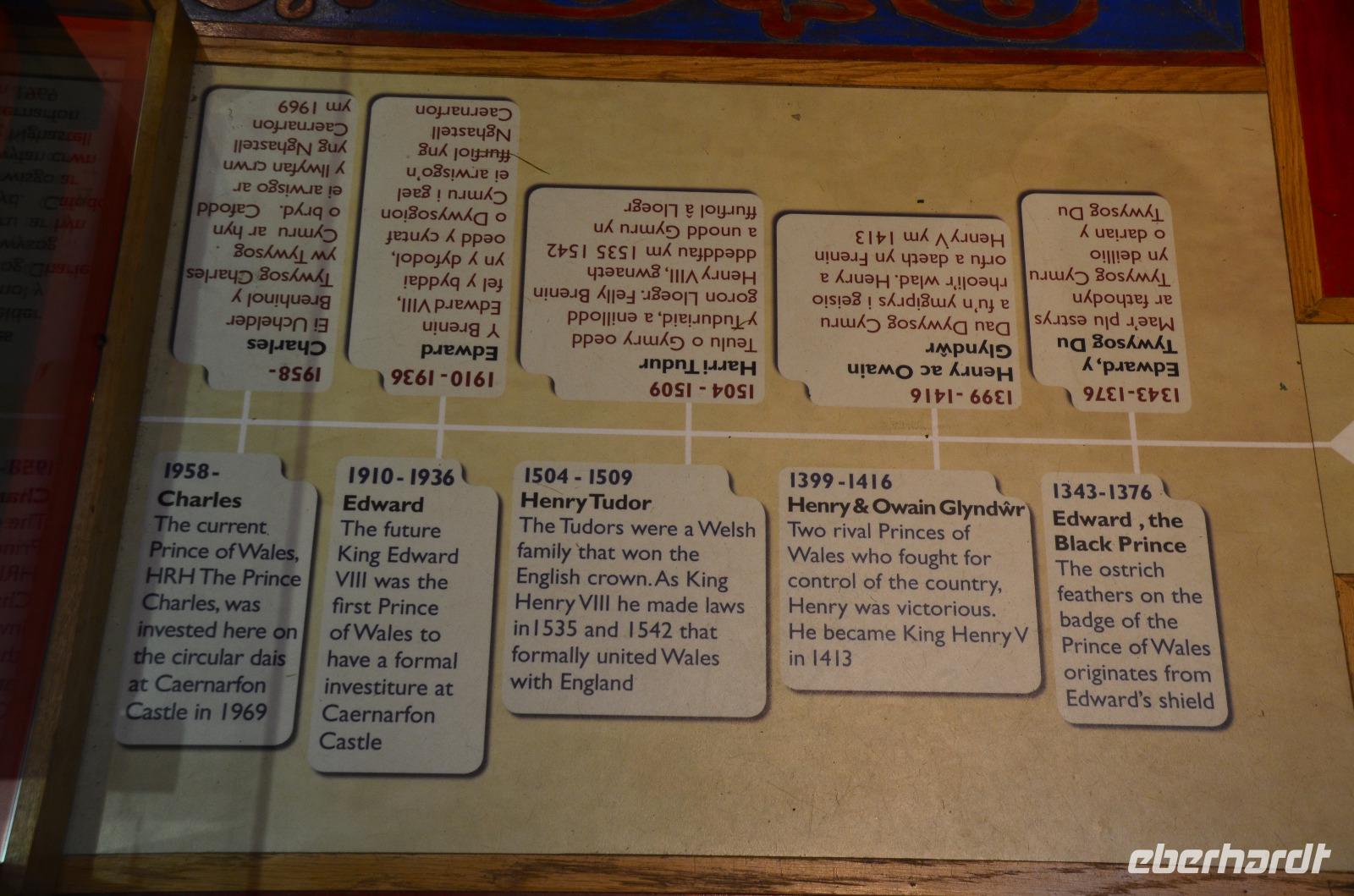 Von hier geht se durch das Stadttor weiter nach Südwesten, bis zur Insel Anglessy. Über die Britannia Bridge fahren wir hinüber zum Ort mit dem längsten Namen der Welt. Eine Waliserin aus Visitor Center sagt uns den unaussprechlichen Namen. Später die Rückfahrt über die Britannia Bridge und nach Caernarfon. Durch die Stadtmauer gehen wir gemeinsam zum Castle. Die schwarzen, rund angeordnete Schieferplatten in der Mitte des Rasens im Schlosshof waren die Bühne für die Krönung von Charles zum Prince of Wales im Jahre 1969. Im oberen Turm (Stadtseite) können wir einer Filmvorführung zur Geschichtefolgen, im unteren Turm einer Ausstellung zu den waliser Königen und über die Treppen Mauern und Türme kann man fast jeden Winkel der für ihre Zeit modernen Anlage erreichen. Immerhin gab es schon Glasfenster und eine Wasserkunst.