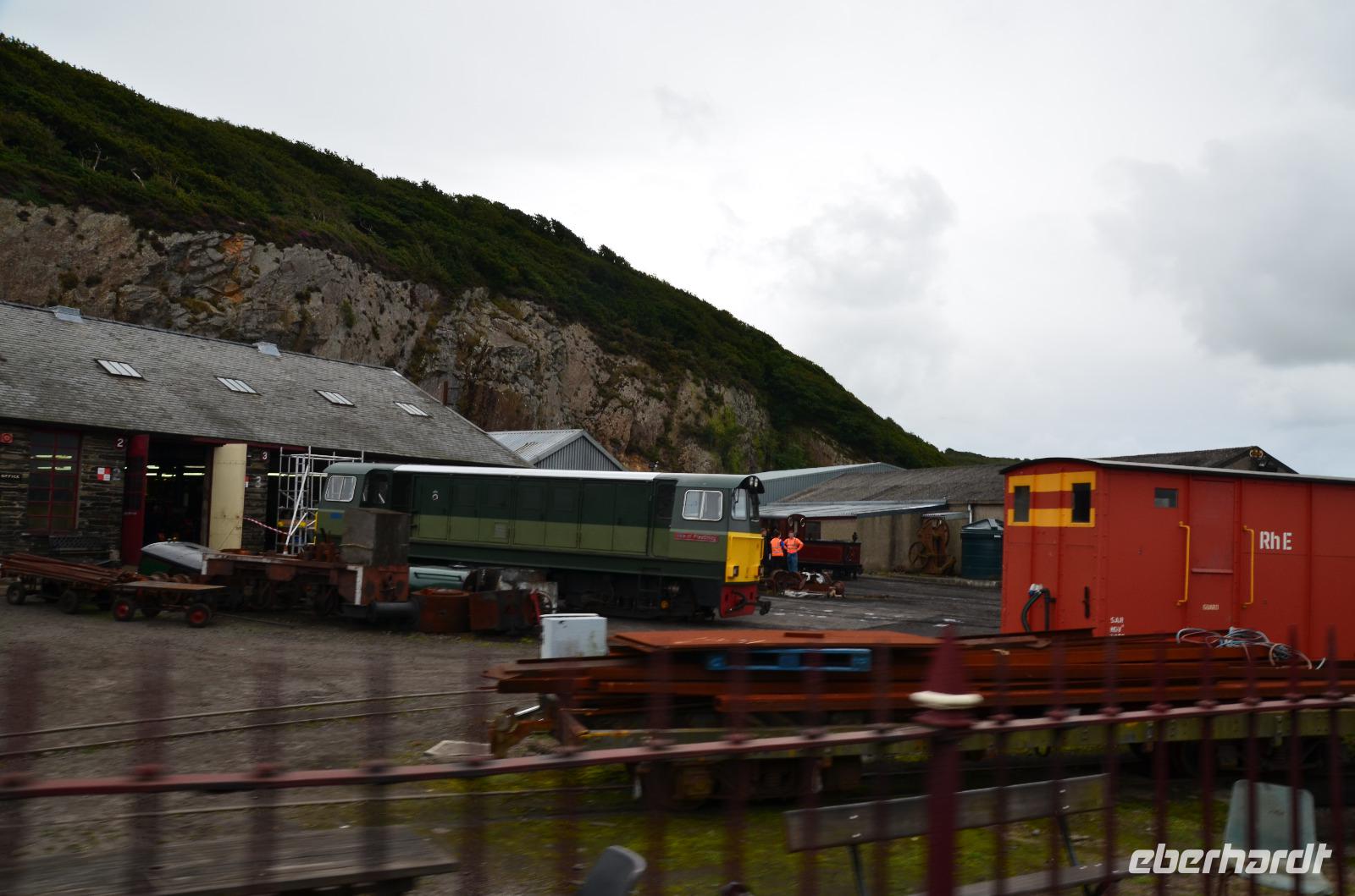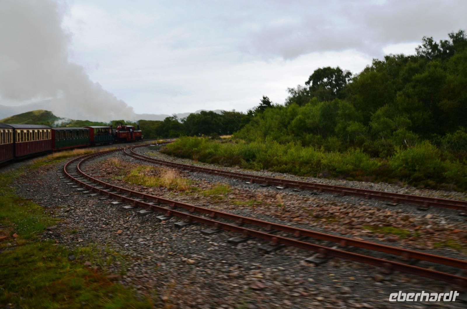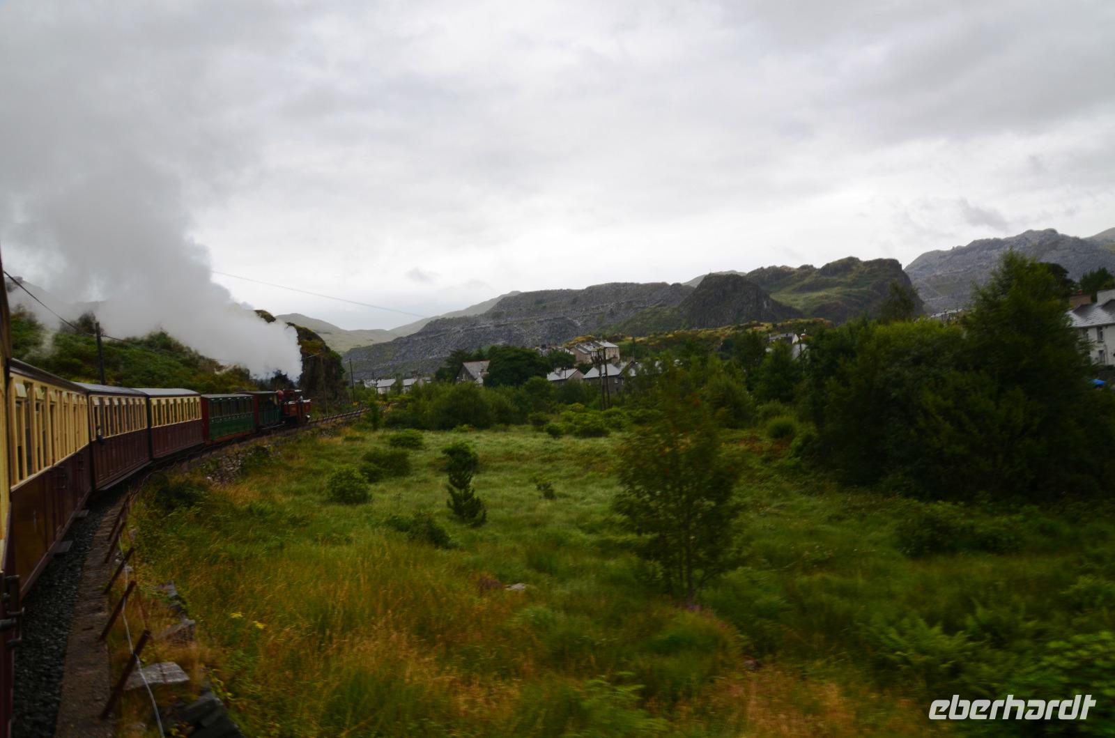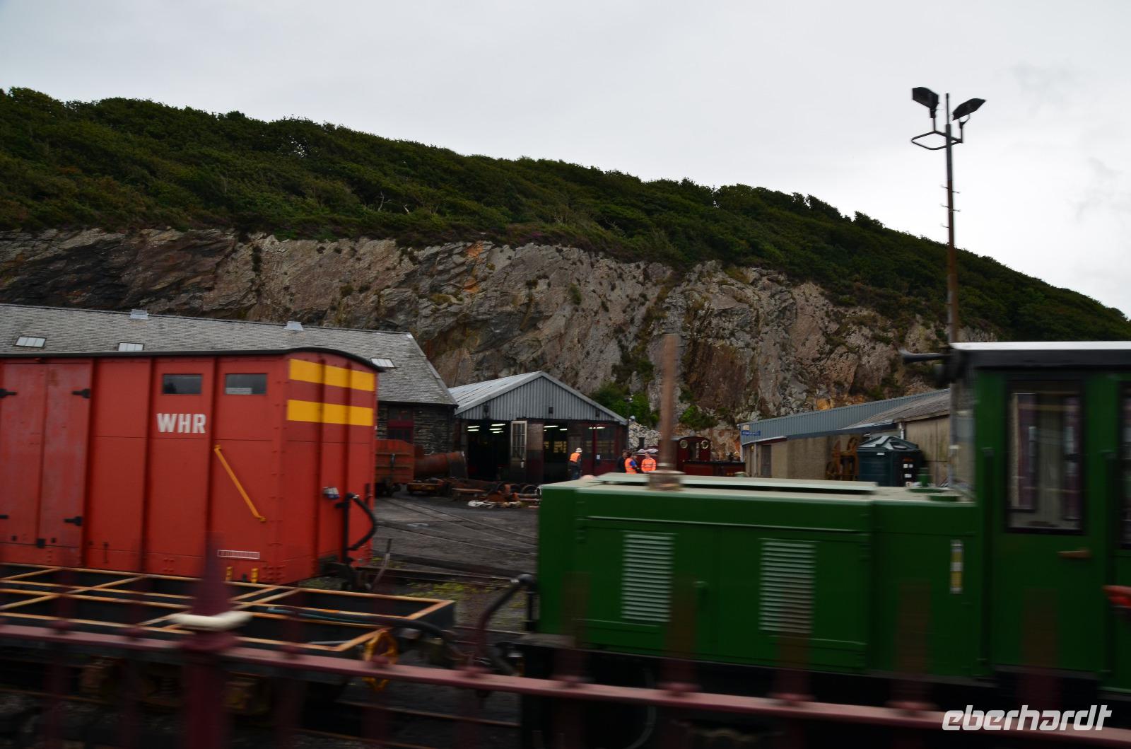 Vorbei an den Bergen des Snowdon Mountain Nationalparks fahren wir mittags weiter nach Porthmadog. Wir wollen mit der Ffestinog Railway hinauf in die Schieferberge von Wales fahren. Die Wagen Nr. 106/108 sind für uns reserviert und schaufend und ruckelnd geht es hinauf nach Blaneau.