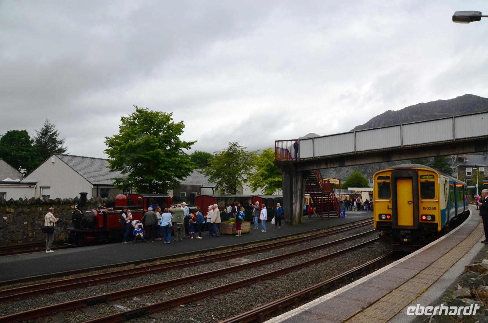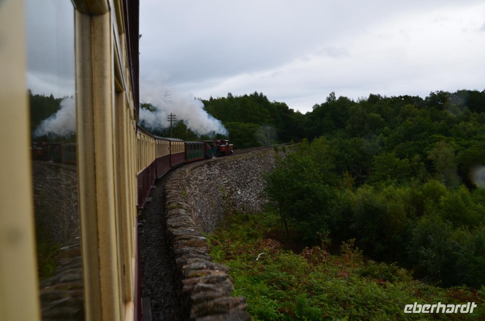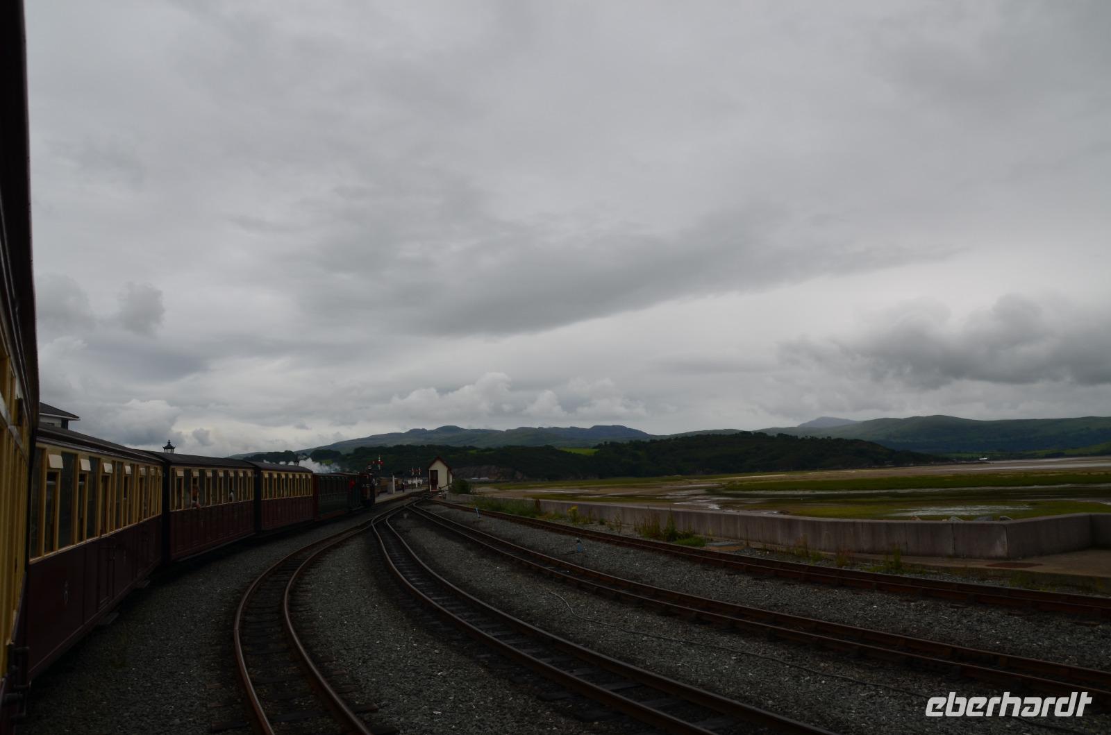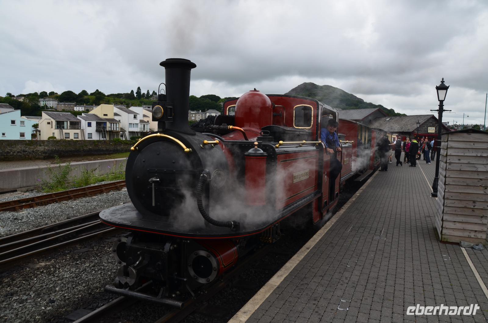 Vorbei an den Bergen des Snowdon Mountain Nationalparks fahren wir mittags weiter nach Porthmadog. Wir wollen mit der Ffestinog Railway hinauf in die Schieferberge von Wales fahren. Die Wagen Nr. 106/108 sind für uns reserviert und schaufend und ruckelnd geht es hinauf nach Blaneau.
