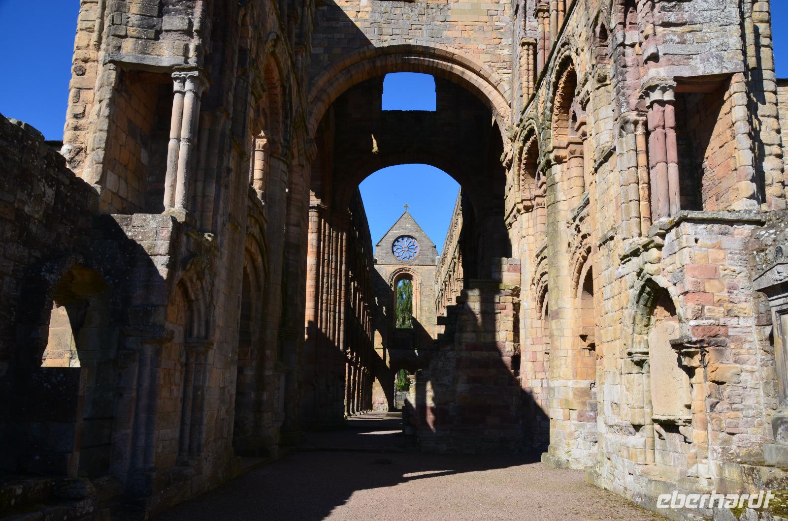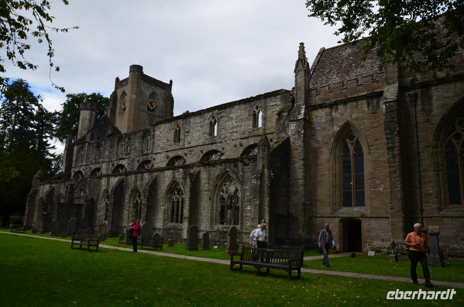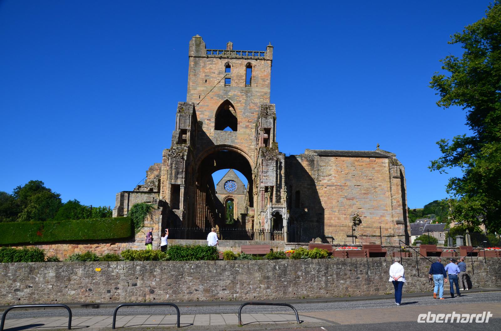 Wir fuhren nun immer weiter nach Süden, verließen Edinburgh und die Lothians. Im Borderland ging es durch die sanften Täler der River Leather und Tweed. Wir erreichten die Aussicht am Leather-Viadukt und fuhren hinauf zur Aussicht Scotts View, mit herrlichem Blick auf die Eildon Hills und den Tweed. Schließlich kamen wir nach Jedburgh, wo ein Fotostopp an der berühmten Abbey nicht fehlen darf.