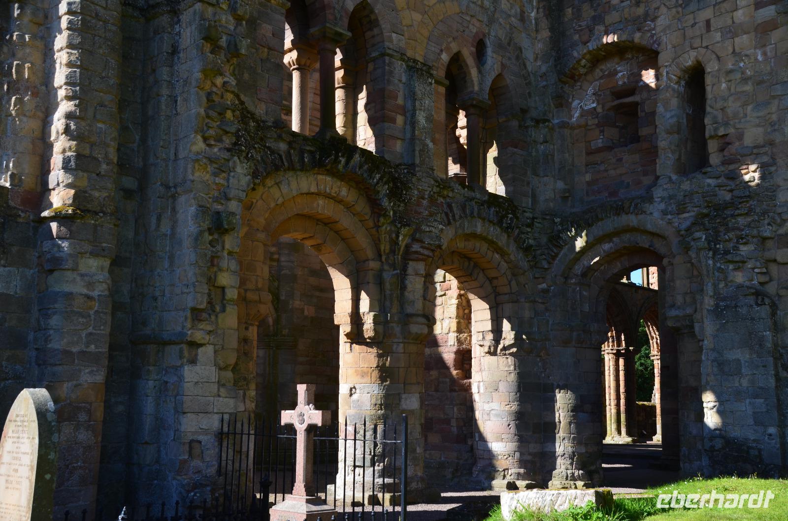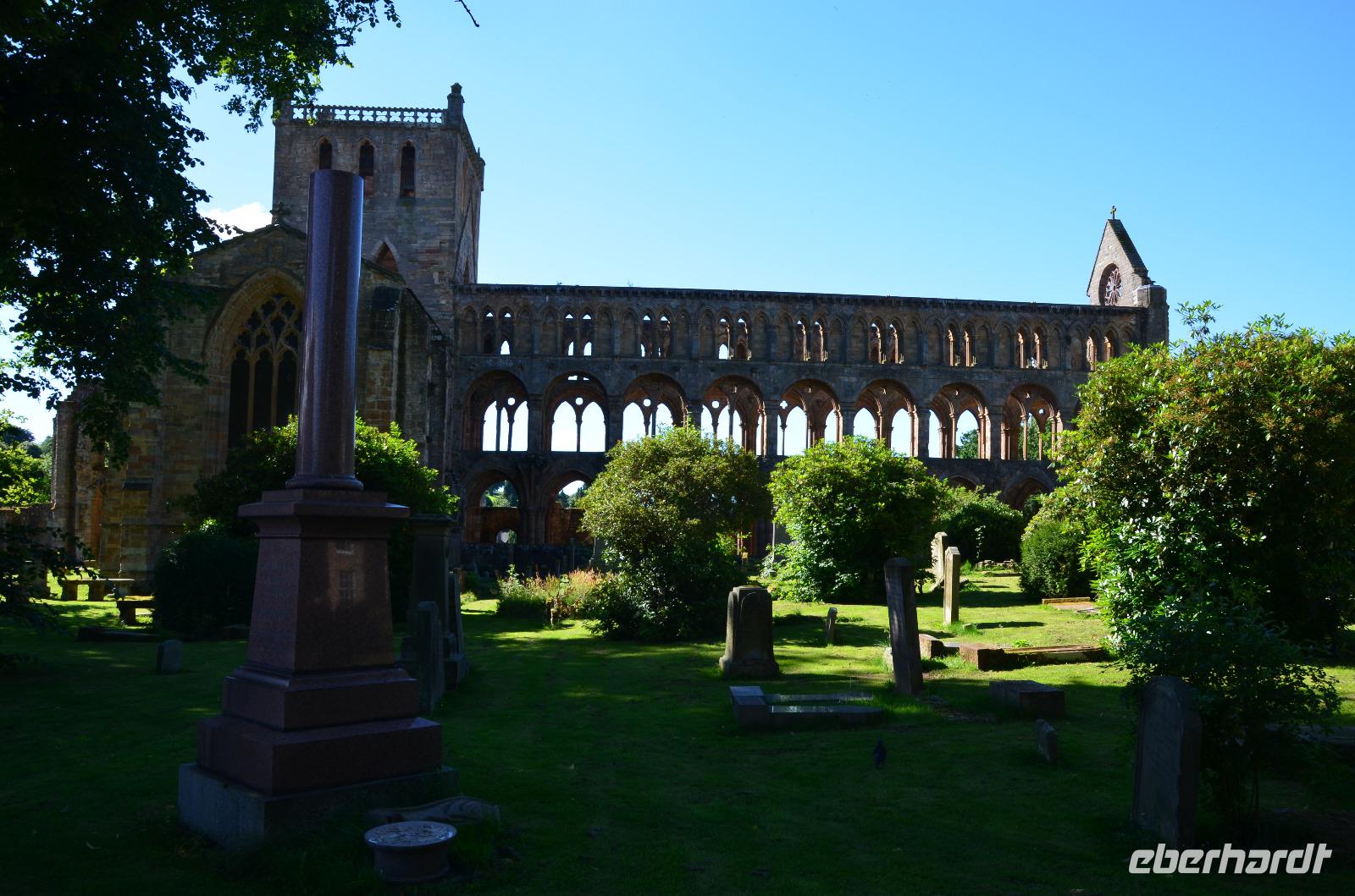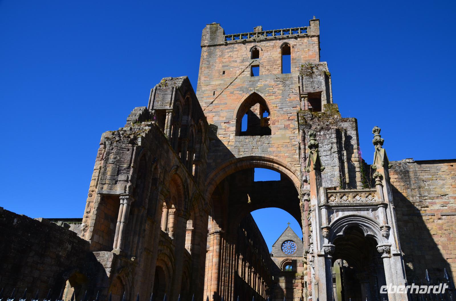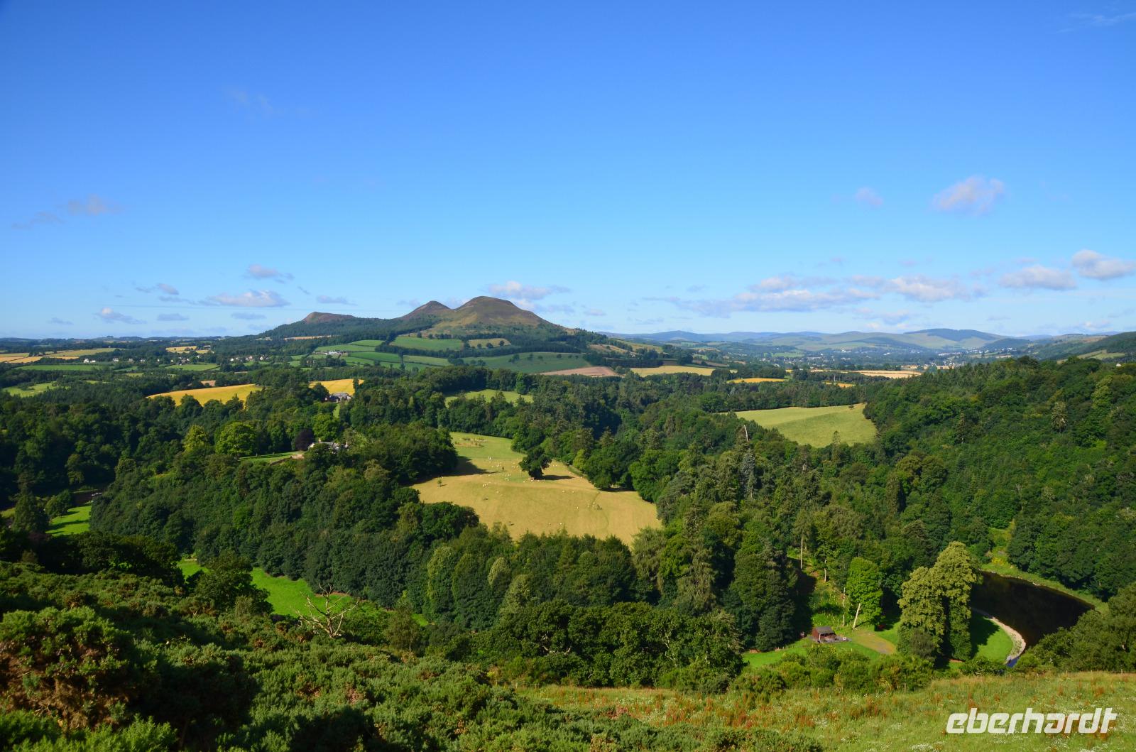 Wir fuhren nun immer weiter nach Süden, verließen Edinburgh und die Lothians. Im Borderland ging es durch die sanften Täler der River Leather und Tweed. Wir erreichten die Aussicht am Leather-Viadukt und fuhren hinauf zur Aussicht Scotts View, mit herrlichem Blick auf die Eildon Hills und den Tweed. Schließlich kamen wir nach Jedburgh, wo ein Fotostopp an der berühmten Abbey nicht fehlen darf.