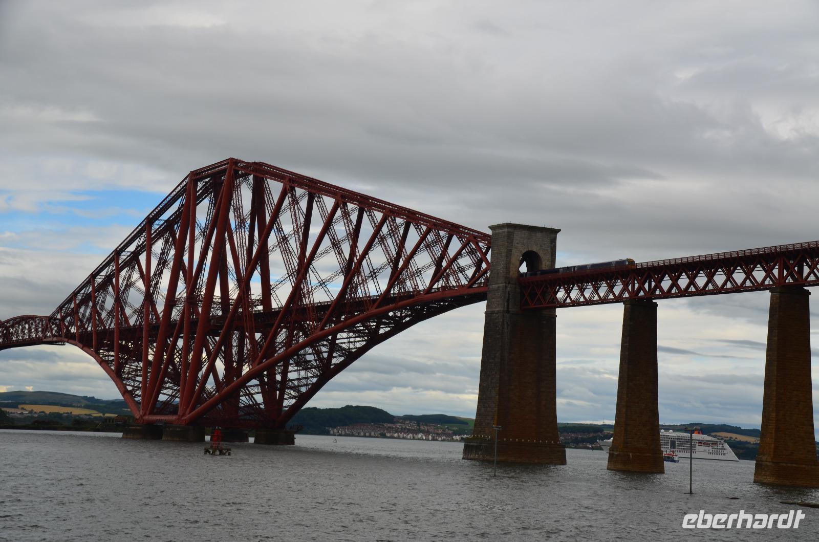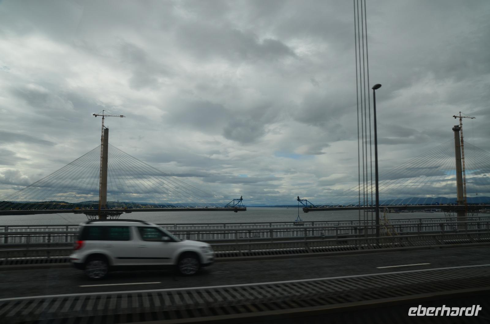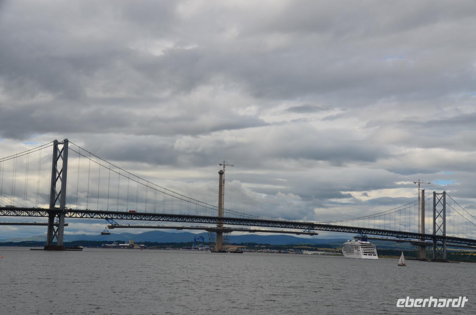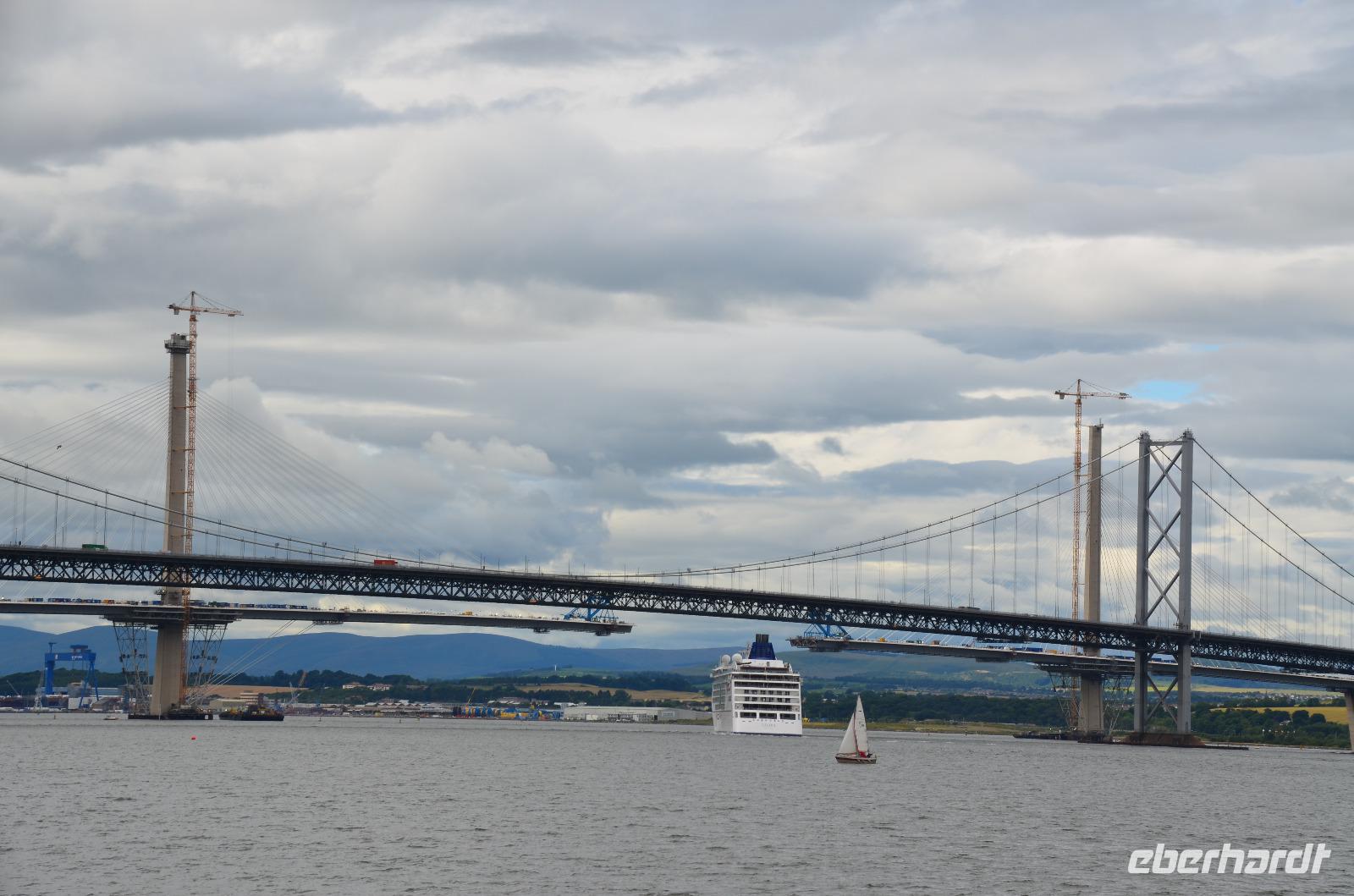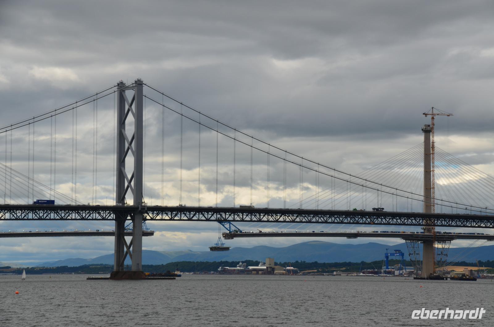 Schließlich erreichen wir nachmittags die Firth of Forth Bridges, machen eine Überfahrt der Road Bridge, mit Blick auf die Railway Bridge sowie die neue Straßenbrücke und fahren dann zur neu ausgebauten Aussicht auf der Südseite - Threebridges. Später von hier hinunter nach South Queensferry, hier nochmals ein Fotostopp und dann hinein nach Edinburgh, die schottische Hauptstadt.