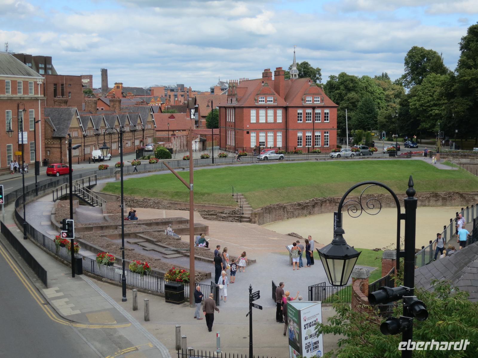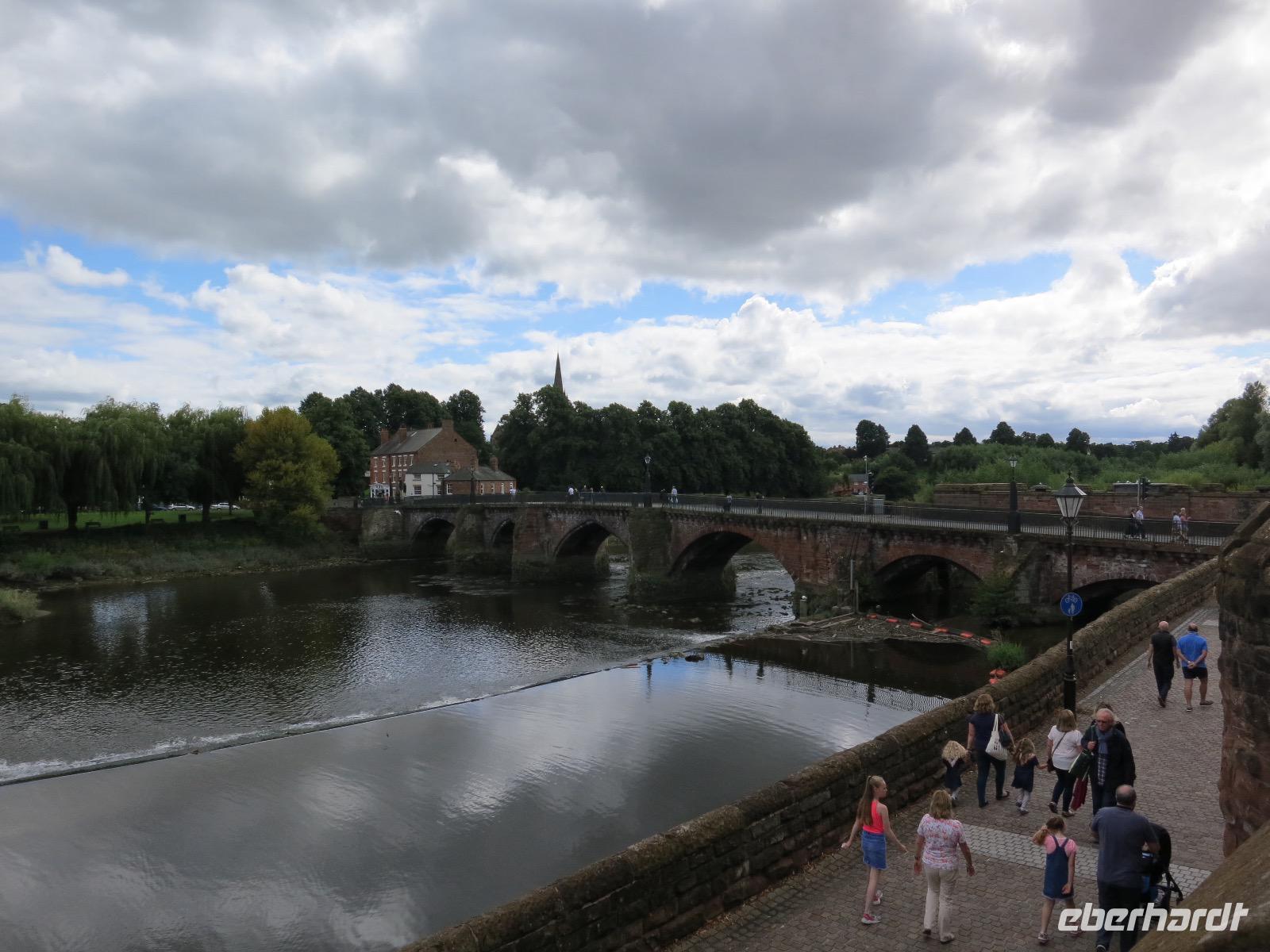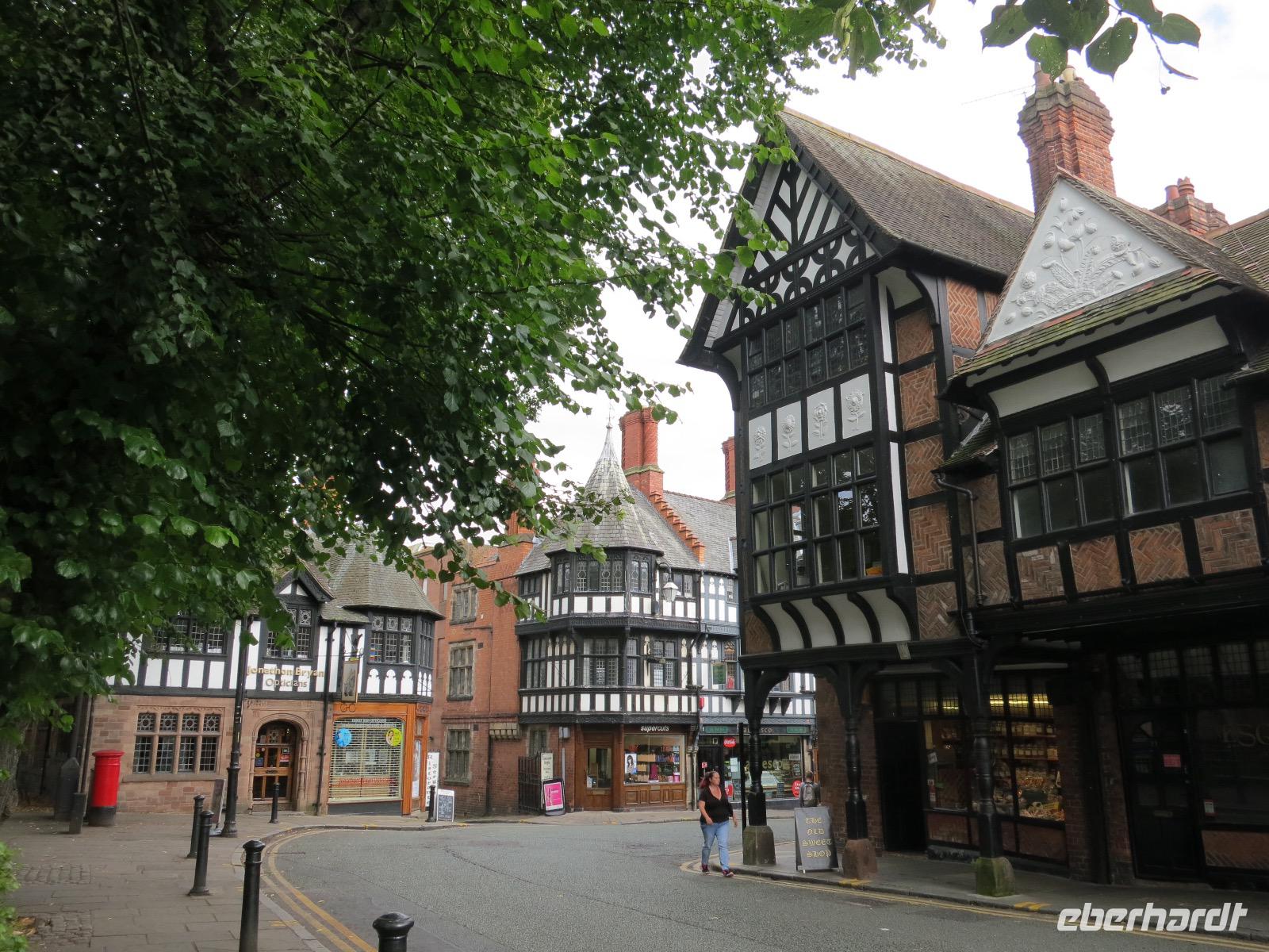Die erste Sehenswürdigkeit des Tages führte uns nach Ironbridge, einem kleinen Ort, der nach seiner Hauptattraktion, einer eisernen Brücke, benannt worden ist. Die gleichnamige Brücke erinnert an die industrielle Revolution und die Anfänge der Architektur mit Eisen, denn sie ist die erste Eisenbrücke der Welt. Das Bauwerk wird ständig gewartet, um korrodierte Stellen zu pflegen. So macht die Brücke auch heute einen soliden Eindruck, so dass man gern darüber hinweg spaziert und den Fluss Severn unter sich dahinströmen sieht.?Weiter ging's nach Shrewsbury, einer Stadt mit vielen Fachwerkhäusern, einem Castle und darüber hinaus die Geburtsstadt Charles Darwins. Hier bot sich ein kleiner Spaziergang durch die Altstadt an. Wir gingen bis zum Castle und zur Bibliothek, vor der Charles Darwins Statue auf einem Sockel sitzt und in einer Zeitung blättert. Im Anschluss fuhren wir nach Chester, wo unsere Gruppe von unserem Stadtführer Peter abgeholt wurde. Bei einem Spaziergang durch Chester zeigte und erklärte er uns auf amüsante Weise diese herrliche Stadt. Wir sahen zum Beispiel die Rows, das sind überdachte Arkaden im 1. Stock, durch die man trockenen Fußes wandeln und dabei einkaufen kann. Wir hörten Anekdoten aus Chesters Vergangenheit und Gegenwart. Einer der Höhepunkte dieses Tages war ein landestypischer Besuch in einem traditionellen Tearoom, wir probierten englischen Tee mit Scones (leckeres Gebäck), clotted creme (Schlagrahm) und Erdbeermarmelade.?Nach dem Stadtrundgang und der Teestunde fuhren wir in unser Hotel vor den Toren von Chester und ließen uns ein leckeres englisches Abendessen schmecken.