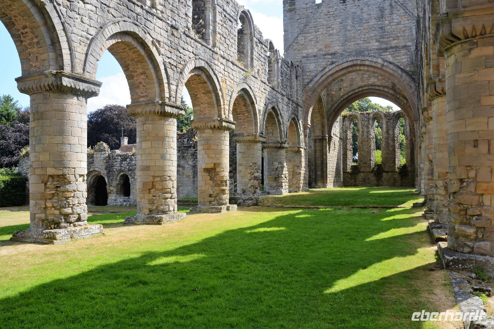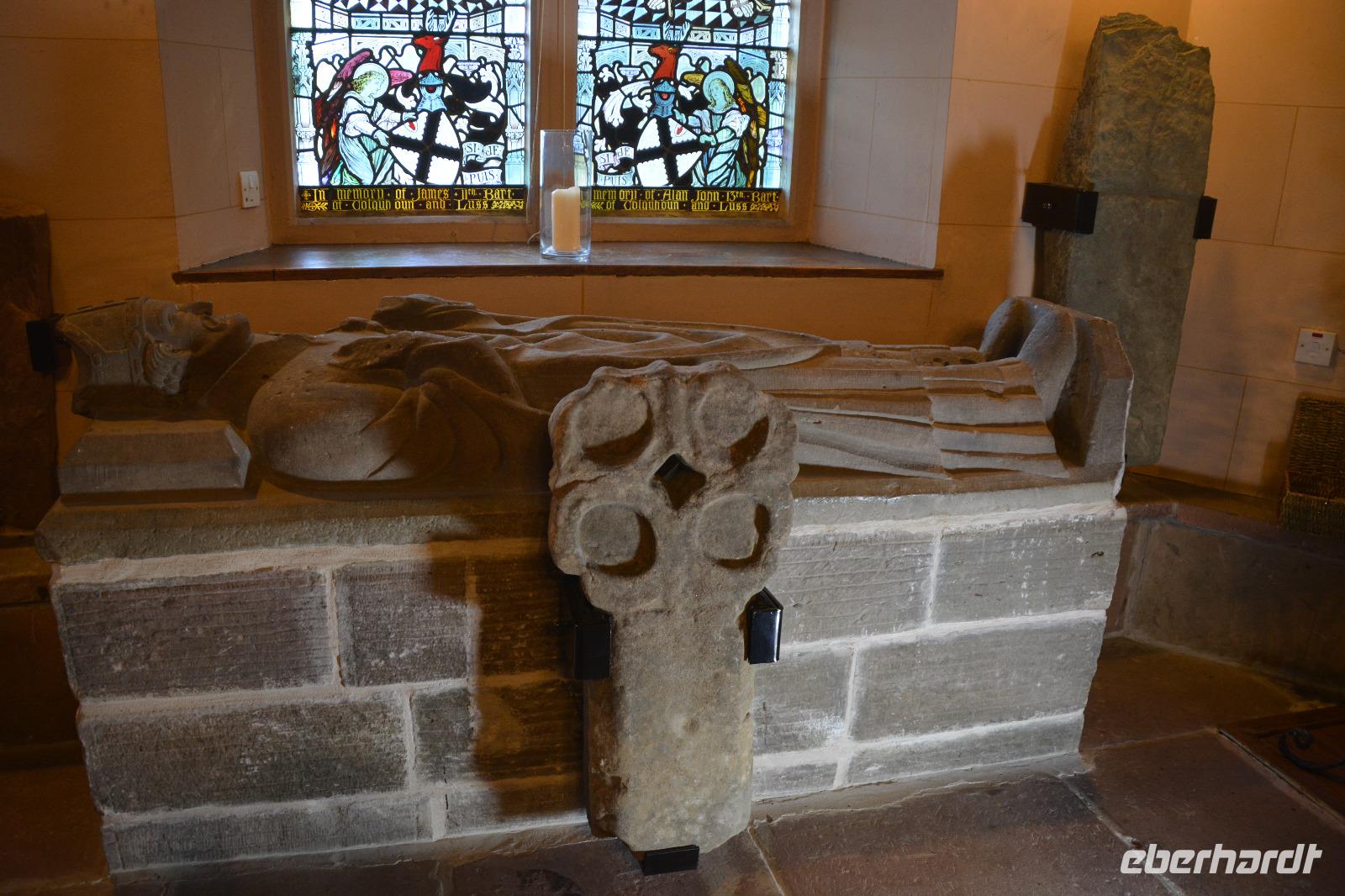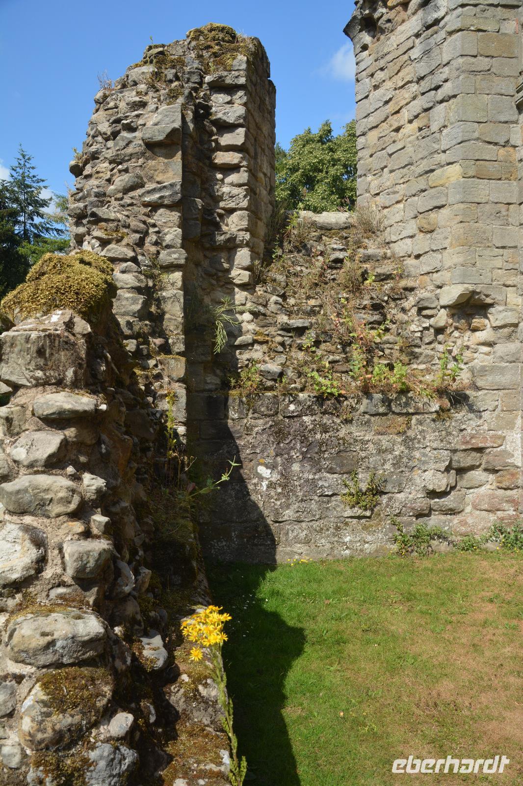 Früh geht es in Richtung Süden. Wir machen einen Fotostopp an der Kathedrale von Jedburgh, eine der letzten Kathedralen unserer Reise. An der Grenze zu England grüßt ein Dudelsackspieler der seit 20 Jahren mit seinem kleinen fahrbaren Lädchen hier ausharrt. Er spielt uns ein schottisches Ständchen.