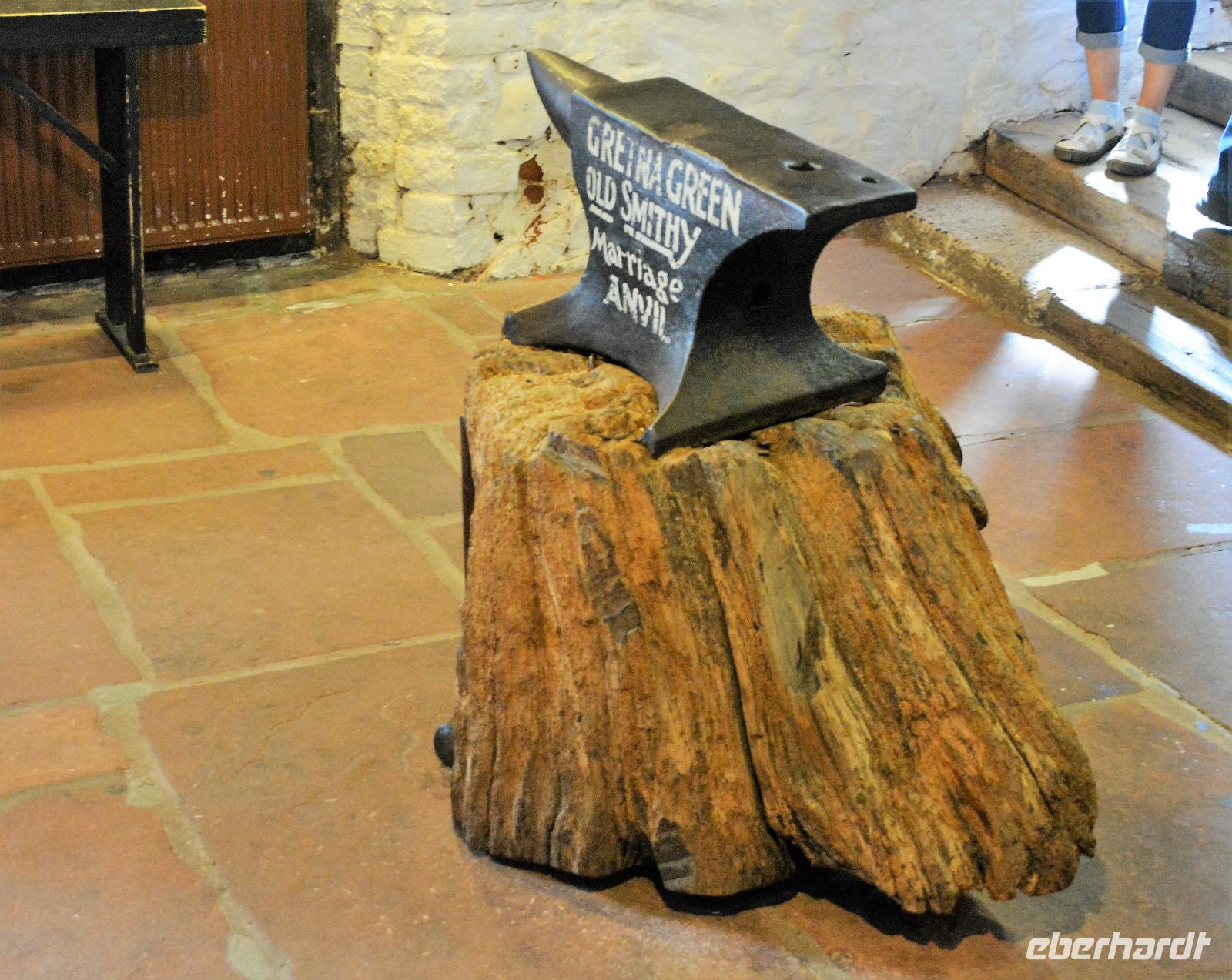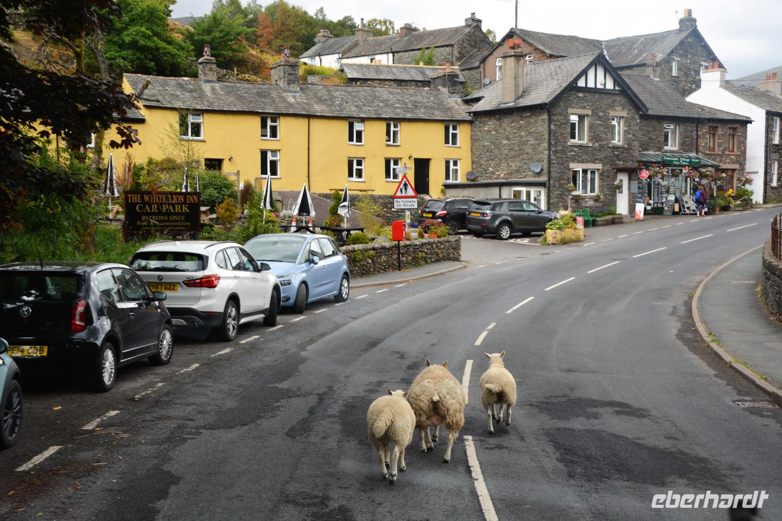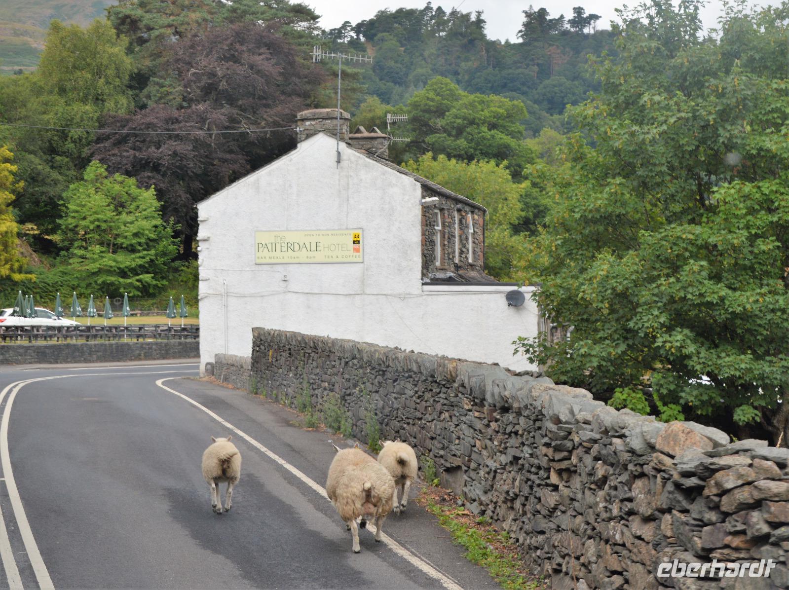 Ab Bowness am Ende der Schiffsfahrt geht dann die Route über eine landschaftlich besonders schöne Strecke zum Kirkstone Pass, wo wir eine Pause einlegen. Unser nächstes Ziel ist Gretna Green. Aus der Gruppe kam der Vorschlag, das am längsten verheiratete Paar noch einmal durch Amboßschlag vermählen zu lassen. Vorher aber blockieren noch drei Schafe den Weg. Ob sie auch nach Gretna Green unterwegs sind? Wir überfahren die Grenze zu Schottland.