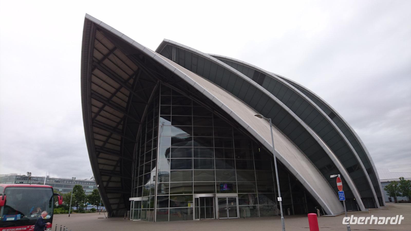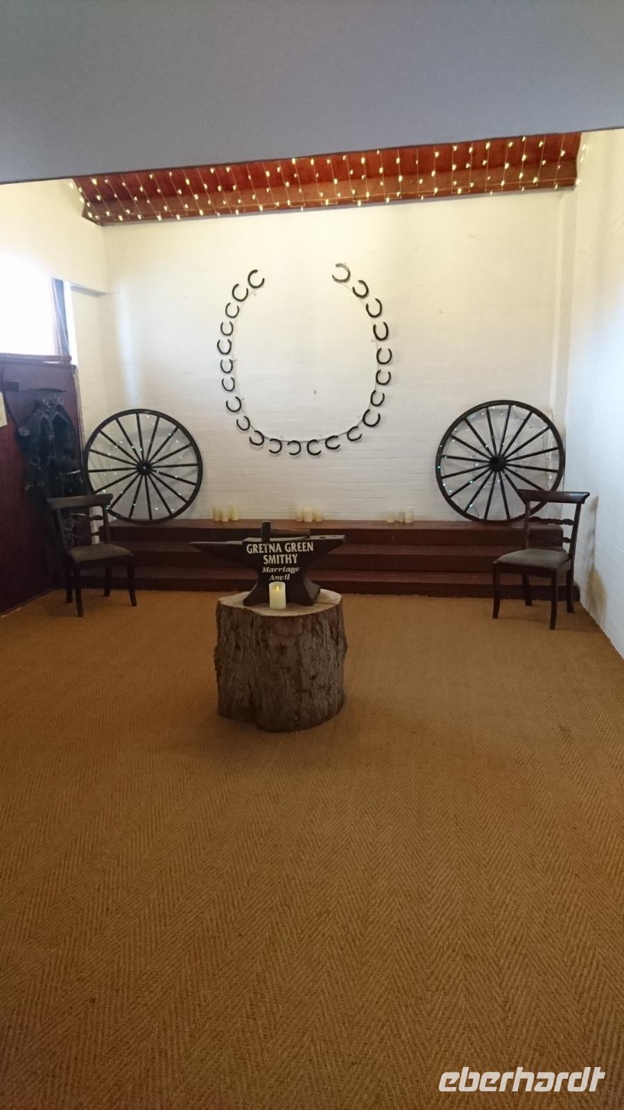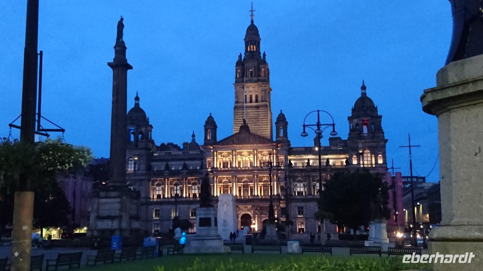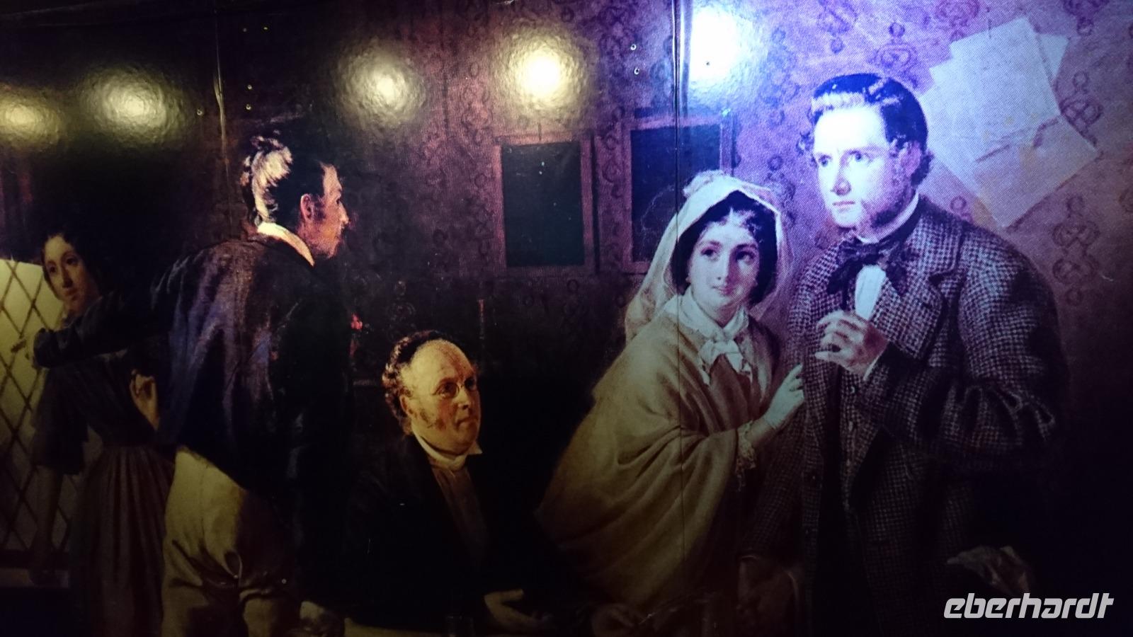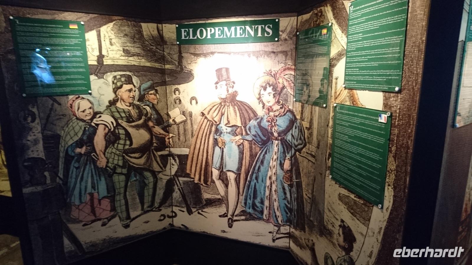 Am Morgen verlud Roy wieder unsere Koffer und nach der Tagesansprache durch Stefan, bei der wir immer besser die Antwort auf sein „good morning, ladys and gentlemen" lernten, ging es auf nach Norden, denn am Abend wollten wir das nächste und letzte Königreich unserer Tour erreichen, ehe wir nach England zurückkehren und nach den Niederlanden übersetzen würden. Doch bis dahin war noch etwas Zeit. Wir fuhren durch den landschaftlich herrlichen Lake District zum größten See der Region, dem Lake Windermere. Im kleinen Ort Lake Side stiegen wir aus und schauten uns den alten Bahnhof, aber auch den See und die Bootsstation an. Zum Glück kam gerade ein alter Dampfzug an und wir fühlten und zurückversetzt, wie bei unserer eigenen Zugfahrt am Tag vorher, in die alten Zeiten dieser Gegend, ehe unser Schiff am Kai eintraf und wir darauf Platz nahmen. Quer über den See ging es nun in den kleinen Ort Bowness, der hauptsächlich vom Tourismus lebt und auch so eingerichtet ist. Wir genossen das Bummeln eine Weile, schauten wieder zum See und stiegen schließlich in unseren Bus, um weiter gen Norden zu fahren, stoppten noch ein paar Mal für einen obligatorischen Fotostopp in herrlicher Landschaft und erreichten schließlich, vorbei am einstigen Flugzeugunglücksort Lockerbie, die englisch-schottische Grenze und den gleich an der Grenze liegenden schottischen kleinen Ort Gretna Green. In Schottland durfte früher mit 12 Jahren geheiratet werden, in England erst viel später. Ohne Genehmigung der Eltern durfte man es in England gar nicht, in Schottland ab dem 16. Lebensjahr. So war die Schmiede in Gretna Green Anlaufpunkt von vielen jungen heiratswilligen Paaren und deren sie verfolgenden, die Hochzeit verhindern wollenden Familien. In Schottland durfte jeder eine Ehe stiften, wenn drei Fragen von den Brautleuten entsprechend mit „JA" beantwortet wurden: Ist man über 16 Jahre alt, ist man frei zu heiraten und will man heiraten. Der Schmied von Gretna Green ließ dann den Hammer auf den Amboss fallen und der helle metallische Klang verkündete weithin, dass diese Ehe geschlossen war. Oft wandelten sich bei dieser schnell durchgeführten Zeremonie die wütenden Eltern in weinende, dem jungen Paar alles Gute wünschende Menschen und so konnte die Ehe gut beginnen. Wir erlebten nach ein wenig Freizeit im Schmiedehof solch eine Zeremonie und zwei unserer Reisegäste erklärten sich bereit, hier zu heiraten, zwei weitere stellten die Eltern des Paares dar und so bekamen wir einen schönen Einblick in das damalige Geschehen, ehe wir uns noch das zur Schmiede gehörige Museum anschauten und schließlich wieder in den Bus stiegen und weiter zu unserem Hotel mitten in der Innenstadt von Glasgow fuhren. Nach dem Zimmerbezug und ein wenig erfrischender Zeit trafen wir uns alle in der Lobby wieder und spazierten mit Roy und Stefan zu einem Pub in der Nähe des George Square, nahe des Glasgower Rathauses, um unser Abendessen typisch schottisch einzunehmen, die Atmosphäre noch etwas zu genießen und dann individuell zu unserem schönen Hotel am Hauptbahnhof der größten und bevölkerungsreichsten Stadt Schottlands zurückzukehren und uns für die morgige Schottland-Highland-Tour auszuschlafen.