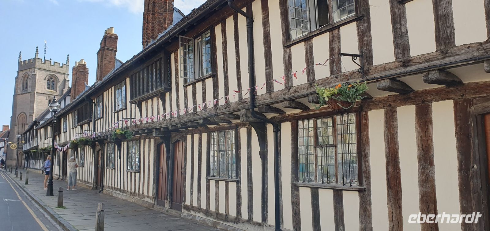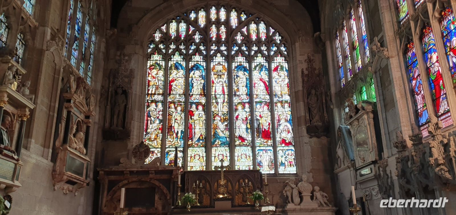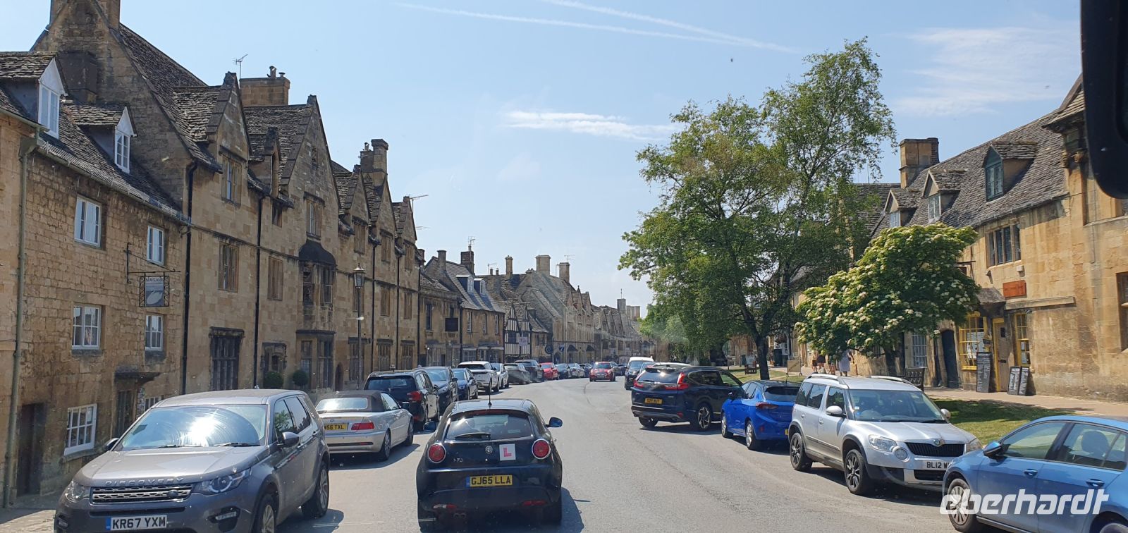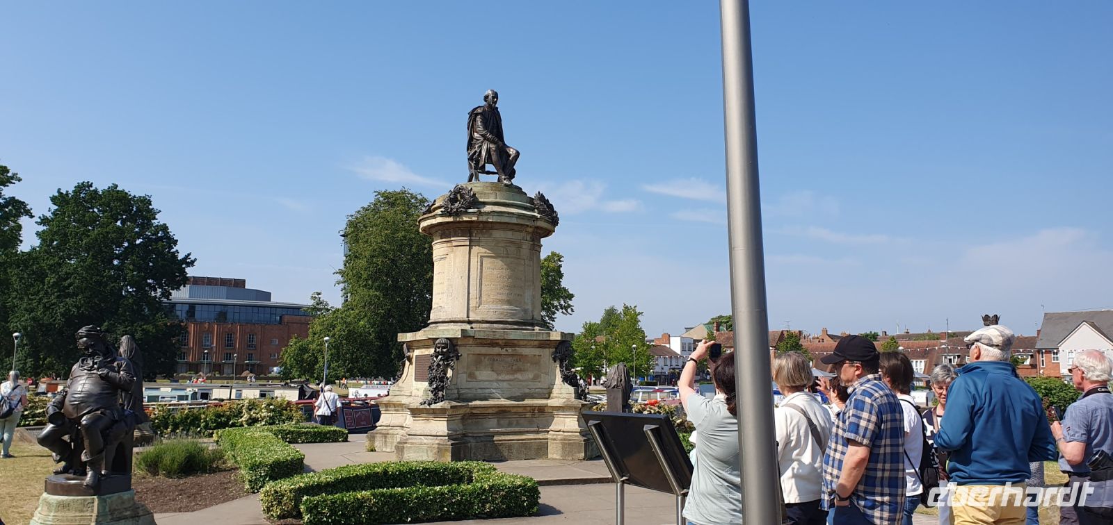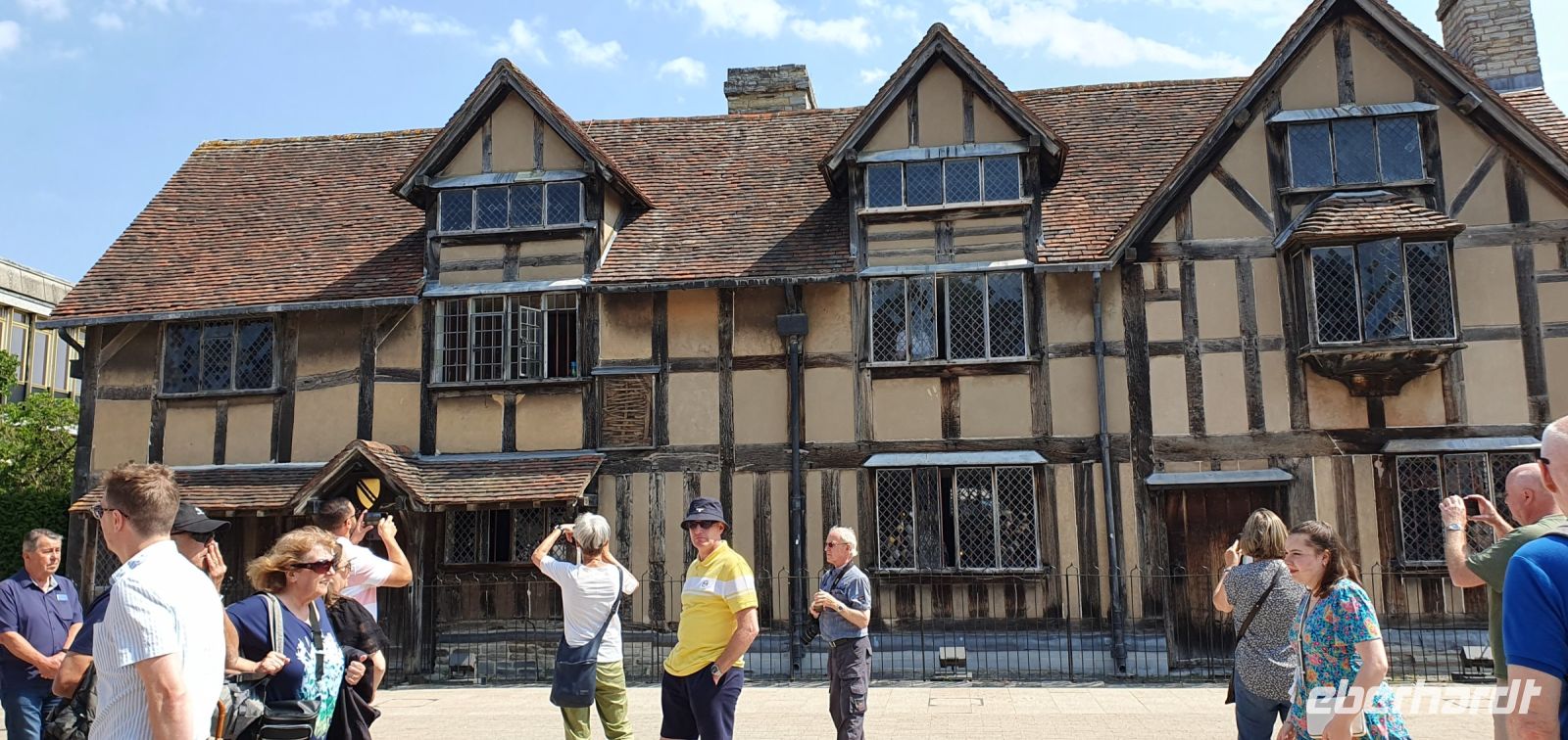 Zeitig fahren wir heute los. Wir wollen die frühe Stunde für einen Besuch der Kathedrale von Coventry nutzen. Sie war im zweiten Weltkrieg von deutschen Bombern zerstört worden, viele Menschen kamen damals ums Leben. Coventry und Dresden verbindet heute diese gemeinsame Geschichte von sinnloser Zerbombung. Wo der Altar stand steht heute ein Kreuz aus verkohlten Deckenbalken. Neben den Ruinen wurde die neue Kathedrale gebaut. Sie ist noch geschlossen, sonst hätten wir das Nagelkreuz sehen können- ein Symbol der Hoffung und Versöhnung. So spazieren wir weiter, an der Holy Trinity Church vorbei zum Broadgate. Hier steht die Statue von Lady Godiva. Unbekleidet und hoch zu Ross ist sie zu sehen. Ihr Mann hatte ein Kloster gestiftet und hohe Abgaben erhoben. Sie bat vergeblich um die Senkung dieser Lasten- eher reitest du nackt durch die Stadt als dass ich das tun würde- soll er gesagt haben. Sie tat genau dies und er hielt sein Wort. Wir spazieren zurück zum Bus und machen uns auf den Weg nach Stratford upon Avon. In dieser Stadt ist Shakespeare getauft und beerdigt worden, also dreht sich vieles hier um ihn. Am Freizeitzentrum parkt Roy den Bus und wir spazieren am Avon entlang zur Holy Trinity Church. Den Eintritt zur Grabstelle übernimmt Eberhardt Travel als WOW für alle und wir können uns in Ruhe umsehen. Die Kirche ist wunderschön, so viele Details gibt es zu entdecken, die Gräber, die Kapellen, der Altarraum, das Chorgestühl, die Buntglasfenster...Wer möchte folgt mir zu einem Spaziergang durch die Gassen Stratford upon Avons, am Nash´s Haus vorbei, Shakespeares Schule, obwohl das weiß man nicht so genau, bis zum großen Museum mit dem Geburtshaus Shakespeares. Es läßt sich wunderbar Bummeln hier und wir sind froh, dass wir so zeitig gekommen sind- gerade laufen Vorbereitungen für ein Fest am Avon und die Stadt wird langsam voll und voller. Am Bus treffen wir uns wieder, hier ereilt uns eine kleine Hiobsbotschaft: eine unserer Gäste ist gestürzt und wurde von Sanitätern versorgt, es geht ihr aber soweit gut, nur die Platzwunde am Kopf hat ordentliche Spuren hinterlassen...Wir setzen also unsere Fahrt fort und fahren wieder durch ein Gebiet von außergewöhnlicher Schönheit: die Cotswolds. Man nennt sie auch das "Herz Englands". Bernsteinfarbene Häuser mit blühenden Gärten, imposante Herrensitze und Kirchen, verwunschene Weiher und sanfte, hügelige Landschaften. Schafe und ihre Wolle brachten einst Reichtum in das Gebiet und viele Wollhändler ermöglichten den Bau von Kirchen- sie heißen deshalb Wollkirchen. Hier, mitten in den Cotswolds besuchen wir den "Bären von Rodborough". So heißt eine alte Burg, in der heute Hotel, Restaurants und Cafes untergebracht sind. Wir werden zum traditionellen "Afternoon Tea" erwartet. Entwickelt hat sich dieser Brauch, als man die Zeit zwischen Mittagessen und spätem Abendessen irgendwie überbrücken mußte- mit einem Tee und kleinen Häppchen. Unsere Häppchen entpuppten sich als leckere Sandwiches, dazu Pralines und Scones mit Clotted Cream und Marmelade. Das ließen wir uns gern schmecken. Unser "Reisebär" entdeckte noch einen neuen Spielgefährten und von da ab ging es zu zweit an der Frontscheibe unseres Busses durchs Land. Und was wäre eine Fahrt "durchs Land" ohne die heimliche Hauptstadt der Cotswolds- Cirencester- zu besuchen. Auf der High Street gab es keinen Parkplatz für unseren Bus also stoppte Roy kurz am PkW-Parkplatz. Hier war auch Gelegenheit für einen Service-Stopp und wir spazierten zur Kirche des Johannes des Täufers. Auch eine der sogenanten Wollkirchen. Eigentlich schon geschlossen konnten wir doch hinein und uns umsehen. Was für eine Pracht! Das Fächergewölbe und die Ausstattungen. Auch ein Pokal von Anne Boleyn steht hier hinter Glas, wegen ihr hatte Heinrich VIII. mit der Kirche Roms gebrochen und seine eigene Kirche in England gegründet. Der Papst hatte einer Scheidung von Katharina von Aragon- seiner ersten Frau- nicht zugestimmt. Für Anne jedoch gab er alles auf und seitdem gibt es die Church of England, deren Oberhaupt immer auch der König / die Königin ist. Der Kelch wurde eigens für Anne angefertigt und kam über ihre Verwandten nach Cirencester. Was für eine Geschichte! Eigentlich wollten wir uns noch auf dem Markt und den umliegenden Plätzen umsehen, nun aber holte uns das Gewitter, dessen dunkle Wolken wir schon einige Zeit beobachtet hatten, endgültig ein. Wir flüchteten zum Bus und machten uns auf den Heimweg nach Coventry. Ein gemeinsames Abendessen brachte uns im Hotel noch einmal zusammen und so klang dieser Tag langsam aus.