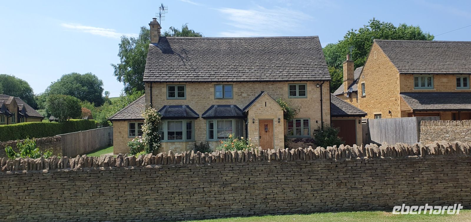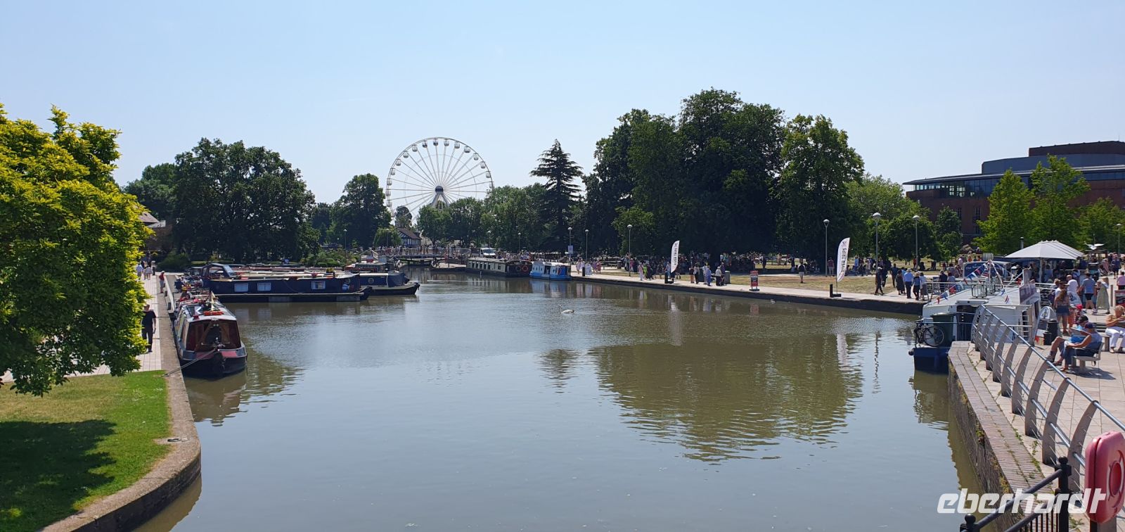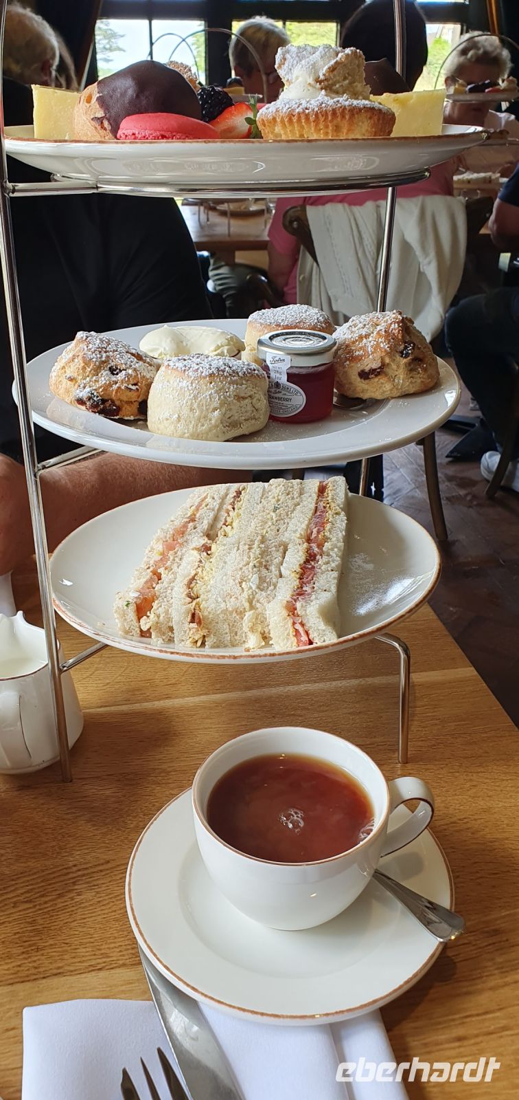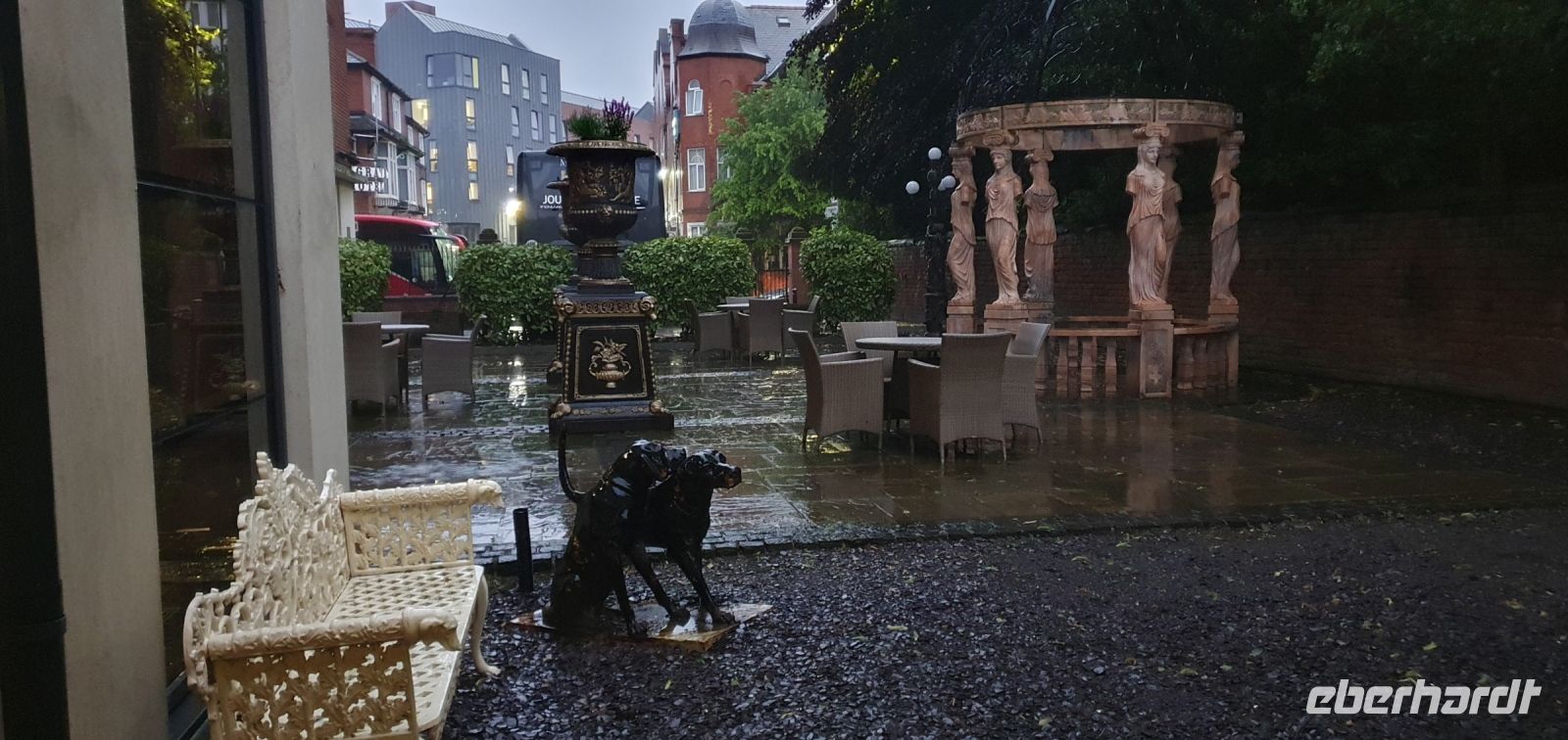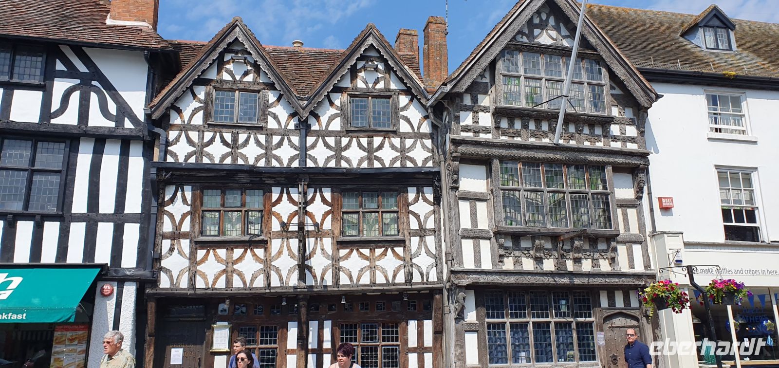 Zeitig fahren wir heute los. Wir wollen die frühe Stunde für einen Besuch der Kathedrale von Coventry nutzen. Sie war im zweiten Weltkrieg von deutschen Bombern zerstört worden, viele Menschen kamen damals ums Leben. Coventry und Dresden verbindet heute diese gemeinsame Geschichte von sinnloser Zerbombung. Wo der Altar stand steht heute ein Kreuz aus verkohlten Deckenbalken. Neben den Ruinen wurde die neue Kathedrale gebaut. Sie ist noch geschlossen, sonst hätten wir das Nagelkreuz sehen können- ein Symbol der Hoffung und Versöhnung. So spazieren wir weiter, an der Holy Trinity Church vorbei zum Broadgate. Hier steht die Statue von Lady Godiva. Unbekleidet und hoch zu Ross ist sie zu sehen. Ihr Mann hatte ein Kloster gestiftet und hohe Abgaben erhoben. Sie bat vergeblich um die Senkung dieser Lasten- eher reitest du nackt durch die Stadt als dass ich das tun würde- soll er gesagt haben. Sie tat genau dies und er hielt sein Wort. Wir spazieren zurück zum Bus und machen uns auf den Weg nach Stratford upon Avon. In dieser Stadt ist Shakespeare getauft und beerdigt worden, also dreht sich vieles hier um ihn. Am Freizeitzentrum parkt Roy den Bus und wir spazieren am Avon entlang zur Holy Trinity Church. Den Eintritt zur Grabstelle übernimmt Eberhardt Travel als WOW für alle und wir können uns in Ruhe umsehen. Die Kirche ist wunderschön, so viele Details gibt es zu entdecken, die Gräber, die Kapellen, der Altarraum, das Chorgestühl, die Buntglasfenster...Wer möchte folgt mir zu einem Spaziergang durch die Gassen Stratford upon Avons, am Nash´s Haus vorbei, Shakespeares Schule, obwohl das weiß man nicht so genau, bis zum großen Museum mit dem Geburtshaus Shakespeares. Es läßt sich wunderbar Bummeln hier und wir sind froh, dass wir so zeitig gekommen sind- gerade laufen Vorbereitungen für ein Fest am Avon und die Stadt wird langsam voll und voller. Am Bus treffen wir uns wieder, hier ereilt uns eine kleine Hiobsbotschaft: eine unserer Gäste ist gestürzt und wurde von Sanitätern versorgt, es geht ihr aber soweit gut, nur die Platzwunde am Kopf hat ordentliche Spuren hinterlassen...Wir setzen also unsere Fahrt fort und fahren wieder durch ein Gebiet von außergewöhnlicher Schönheit: die Cotswolds. Man nennt sie auch das "Herz Englands". Bernsteinfarbene Häuser mit blühenden Gärten, imposante Herrensitze und Kirchen, verwunschene Weiher und sanfte, hügelige Landschaften. Schafe und ihre Wolle brachten einst Reichtum in das Gebiet und viele Wollhändler ermöglichten den Bau von Kirchen- sie heißen deshalb Wollkirchen. Hier, mitten in den Cotswolds besuchen wir den "Bären von Rodborough". So heißt eine alte Burg, in der heute Hotel, Restaurants und Cafes untergebracht sind. Wir werden zum traditionellen "Afternoon Tea" erwartet. Entwickelt hat sich dieser Brauch, als man die Zeit zwischen Mittagessen und spätem Abendessen irgendwie überbrücken mußte- mit einem Tee und kleinen Häppchen. Unsere Häppchen entpuppten sich als leckere Sandwiches, dazu Pralines und Scones mit Clotted Cream und Marmelade. Das ließen wir uns gern schmecken. Unser "Reisebär" entdeckte noch einen neuen Spielgefährten und von da ab ging es zu zweit an der Frontscheibe unseres Busses durchs Land. Und was wäre eine Fahrt "durchs Land" ohne die heimliche Hauptstadt der Cotswolds- Cirencester- zu besuchen. Auf der High Street gab es keinen Parkplatz für unseren Bus also stoppte Roy kurz am PkW-Parkplatz. Hier war auch Gelegenheit für einen Service-Stopp und wir spazierten zur Kirche des Johannes des Täufers. Auch eine der sogenanten Wollkirchen. Eigentlich schon geschlossen konnten wir doch hinein und uns umsehen. Was für eine Pracht! Das Fächergewölbe und die Ausstattungen. Auch ein Pokal von Anne Boleyn steht hier hinter Glas, wegen ihr hatte Heinrich VIII. mit der Kirche Roms gebrochen und seine eigene Kirche in England gegründet. Der Papst hatte einer Scheidung von Katharina von Aragon- seiner ersten Frau- nicht zugestimmt. Für Anne jedoch gab er alles auf und seitdem gibt es die Church of England, deren Oberhaupt immer auch der König / die Königin ist. Der Kelch wurde eigens für Anne angefertigt und kam über ihre Verwandten nach Cirencester. Was für eine Geschichte! Eigentlich wollten wir uns noch auf dem Markt und den umliegenden Plätzen umsehen, nun aber holte uns das Gewitter, dessen dunkle Wolken wir schon einige Zeit beobachtet hatten, endgültig ein. Wir flüchteten zum Bus und machten uns auf den Heimweg nach Coventry. Ein gemeinsames Abendessen brachte uns im Hotel noch einmal zusammen und so klang dieser Tag langsam aus.