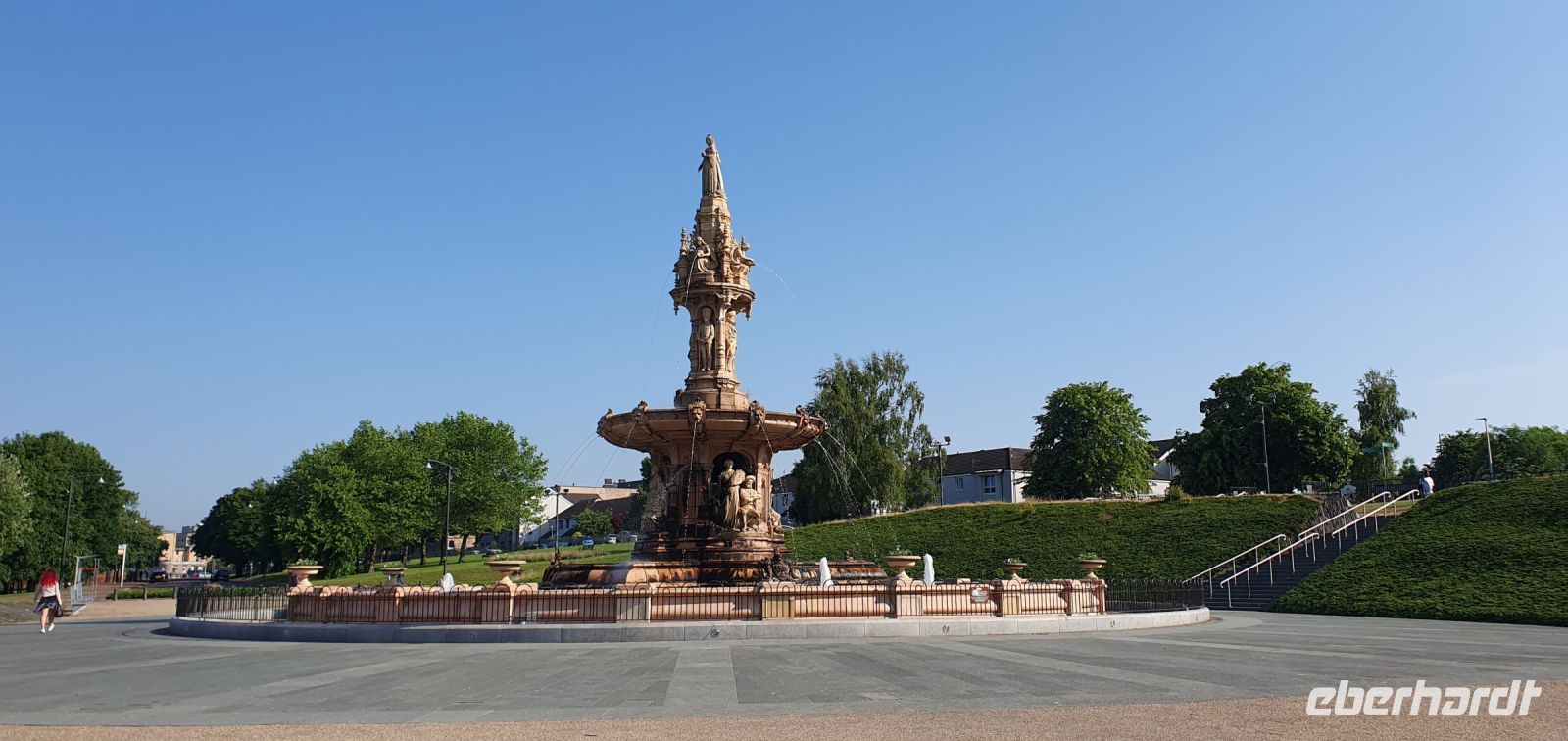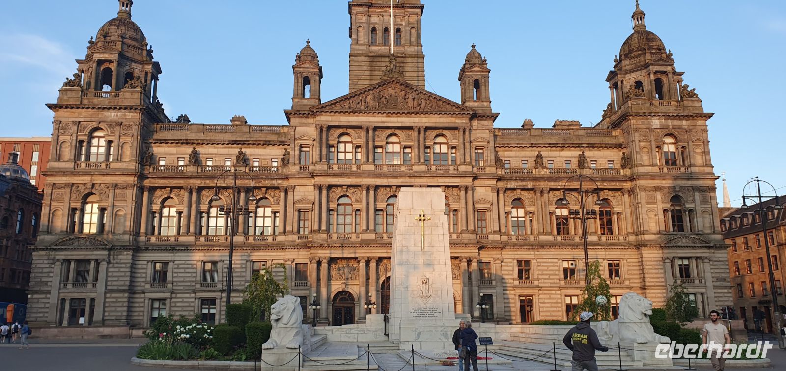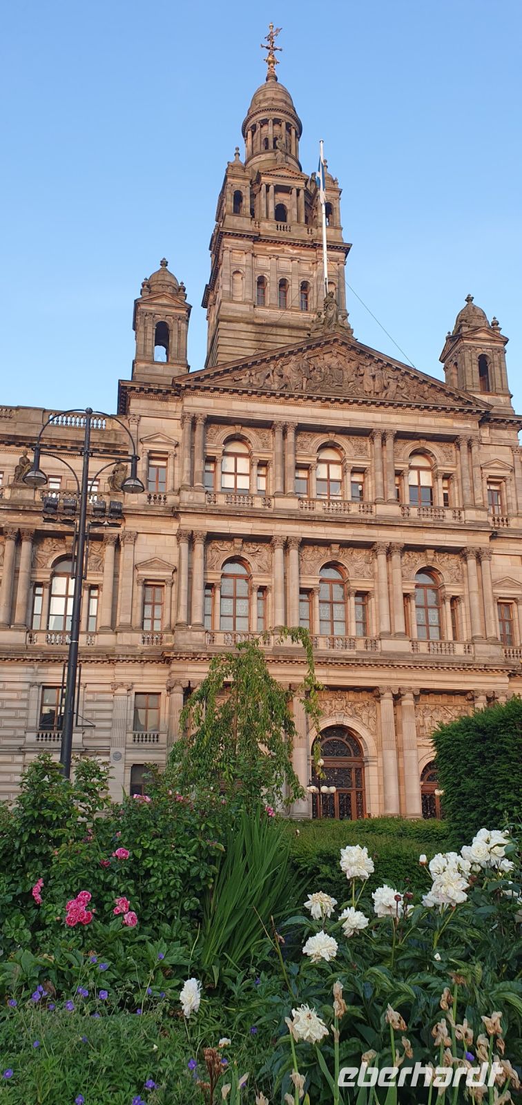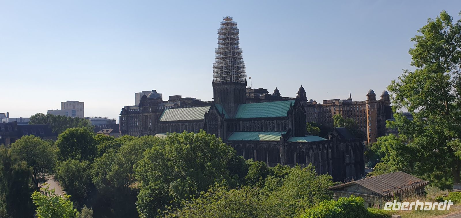 Strahlender Sonnenschein begrüßt uns heute morgen wieder- gut so, schließlich wollen wir heute "aufs Wasser". Der Lake Distrikt wartet auf uns, ein einzigartiger Nationalpark, der zum Welterbe der UNESCO gehört. Auf dem größten See, dem Lake Windermere, wollen wir eine Bootsfahrt zum Nordufer unternehmen. Roy bringt uns nach Bowness zum Pier und fährt dann schon mal vor, wir folgen gemütlich mit dem Schiff und steigen erst in Ambleside aus. Da der Kirkstone Pass wegen Bauarbeiten gesperrt ist folgen wir einer anderen- nicht minder schönen Route durch den Lake Distrikt. Am Fishers Place halten wir für eine Mittagspause- wow- wie schön es hier ist. Kurz nach Carlisle schließlich überqueren wir die englisch-schottische Grenze und besuchen in Gretna Green die Hochzeitsschmiede. Unser Jubelpaar, das auf dieser Reise seinen 60. Hochzeitstag feiert, kam so in den Genuss einer weiteren Hochzeit- vollzogen vor dem Schmied an seinem Amboss. Wie in alten Zeiten. Zahlreiche "richtige" Hochzeiten hier verhindern allerdings, dass wir uns in der Schmiede weiter umsehen können und so brechen wir schließlich nach Glasgow auf. Die größte Stadt Schottlands erreichen wir rechtzeitig und statten schon mal der berühmten Kathedrale einen Besuch ab. Leider dürfen wir nicht mehr hinein also steigen wir zur Nekropolis hinauf. Hier zeigte man noch im Tode, wie reich man zu Lebzeiten war, namhafte Künstler schufen hier Gedenksteine, Grotten und Gruften. Von hier oben haben wir einen tollen Blick auf die Kathedrale, die die Wirren der Reformation dank des Einsatzes der Stände der Stadt fast unbeschadet überstanden hat. Dann fahren wir zu unserem Hotel und können einchecken. Das Abendessen werden wir heute in einem Pub in der Stadt haben und so spazieren wir schon kurze Zeit später zum Georges Square, dem Zentrum der Stadt mit seinem imposanten Rathaus. Schräg gegenüber ist unser Pub und nachdem sich alle an der Bar mit ihren Getränken versorgt hatten ließen wir uns landestypische Bangers- Bratwürstchen- schmecken. Zurück zum Hotel geht es wieder individuell und viele bestaunen noch die riesigen Wandgemälde an den Fassaden.