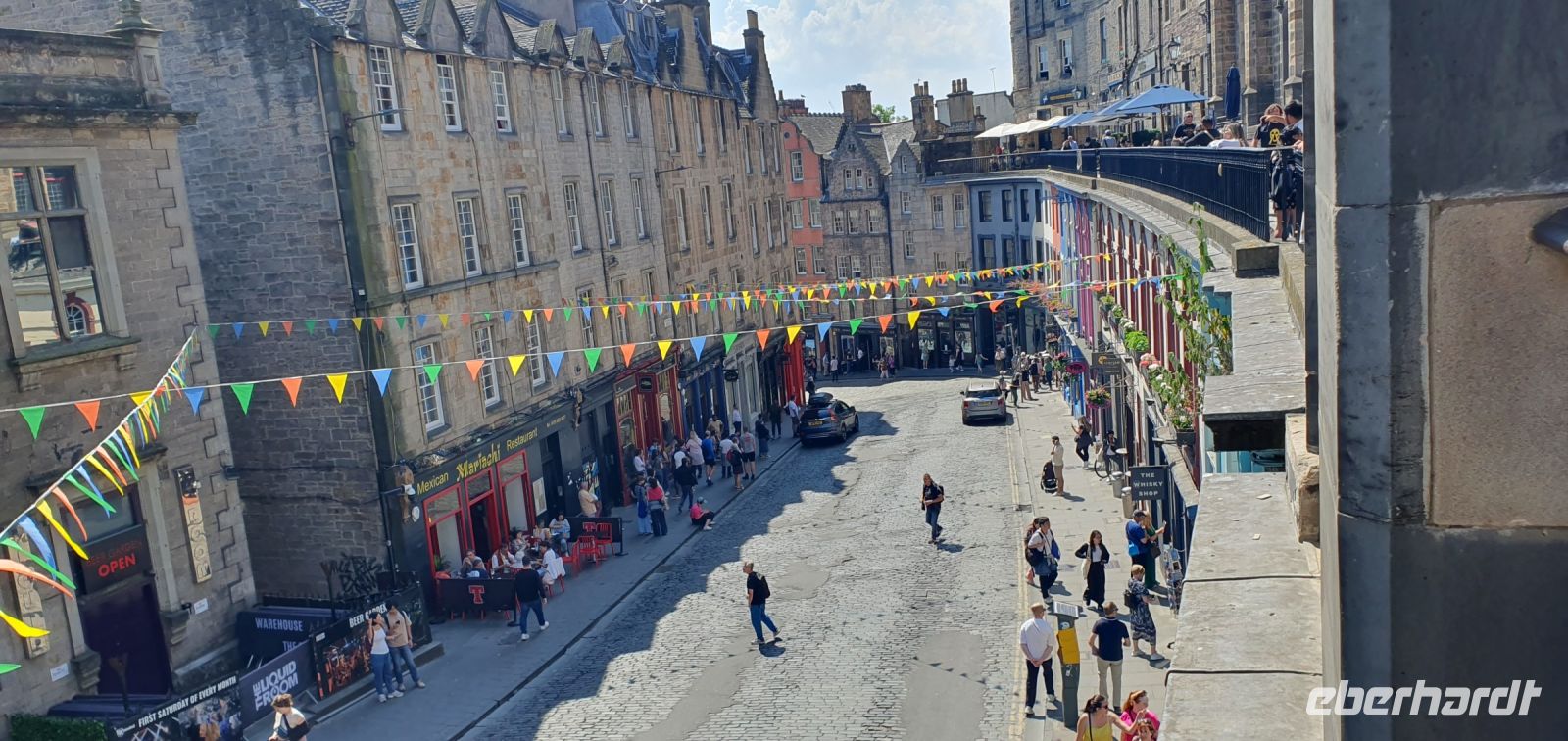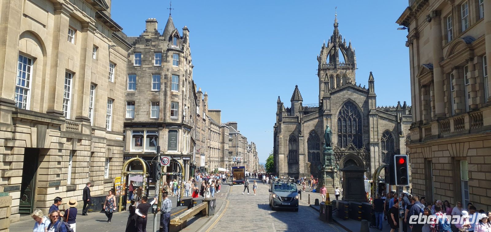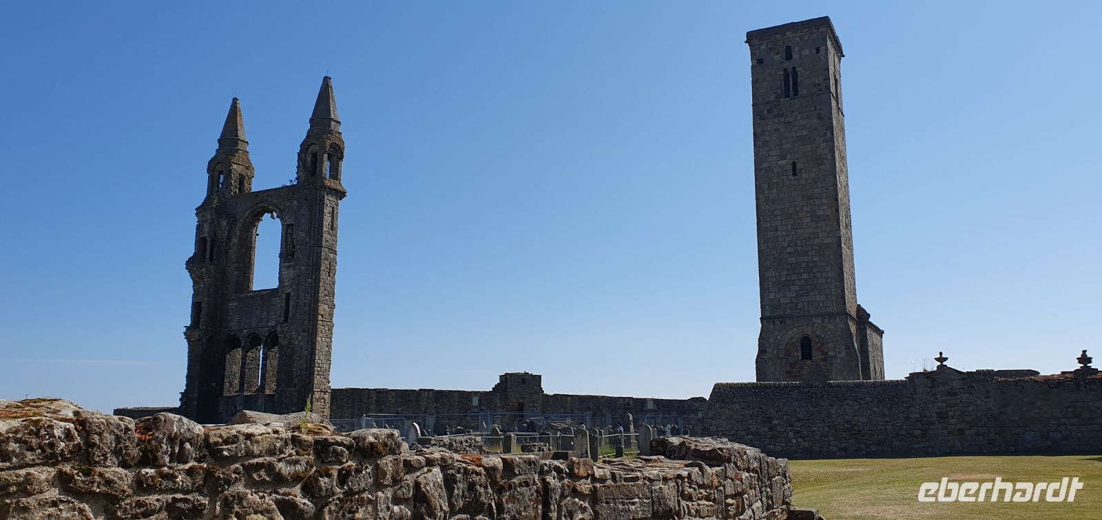 Wir starten mit einem leckeren Frühstück im Hotel, das keine Wünsche offen ließ. Dann heißt es: auf Wiedersehen Dundee. In St. Andrews fährt uns Roy quasi bis zum Meer, direkt am Strand ist der Parkplatz und wir spazieren gemütlich Richtung Kathedrale. Unterwegs passieren wir die Ruinen des Castles, mit seinem Blick aufs Meer und genießen die morgendliche Ruhe. Dann fallen uns immer mehr Studenten in Talar auf- sie feiern heute ihren Abschluß hier. St. Andrews ist die älteste Universität, auch Prinz William und sesine Kate haben sich hier während des Studiums kennengelernt. An der Kathedrale kommen wir gerade rechtzeitig an: das Besucherzentrum öffnet und zu unserer Überraschung ist auch der Rules Tower offen. Also können wir uns in Ruhe umschauen, über den alten Friedhof spazieren oder auf den Turm steigen. Einst war St. Andrews das wichtigste spirituelle Zentrum des Landes. Hier sollen Gebeine des heiligen Andreas angespült worden sein, nachdem das Schiff, das sie hierherbringen sollte untergegangen war. Rasch entstand eine kleine Kirche und viele pilgerten zu den Reliquien, von denen sie sich die Lösung vieler Probleme versprachen. So wuchsen Kirche und Stadt, die Kathedrale entstand und immernoch kommen viele Pilger. Der heilige Andreas ist ja der Schutzheilige Schottlands. Sein Kreuz ziert die Flagge, die Soltaire. Sie ist die älteste Flagge der Welt. Dann geht es weiter. Wir folgen der Küstenstraße und genießen die traumhaften Ausblicke. Den Firth of Forth, den Fjord an der Mündung des Forth, überqueren wir über die Queensferry Crossing. Das ist die neue Straßenbrücke, die neben der alten Forth Road Bridge gebaut wurde. Mit einem einfachen Blick auf die Eisenbahnbrücke, die Forth Bridge, geben wir uns aber nicht zufrieden. Also halten wir am Aussichtspunkt und können so in aller Ruhe alle drei Brücken bewundern. Ingenieurstechnische Meisterleistungen waren und sind sie alle, mehr als 2 Kilometer lang, die rote Eisenbahnbrücke- auch roter Drache genannt- mit ihren Millionen von Nieten, die sie zusammenhalten. Die letzte soll aus Gold sein, aber niemand weiß, wo sie verbaut wurde. Oder die Straßenbrücke, sie war bei ihrer Fertigstellung die längste Hängebrücke der Welt. Nun aber weiter: es geht nach Edinburgh, in die Hauptstadt Schottlands. Hier treffen wir Beryl, unsere Stadtführerin. Am Fettes College ein erster Fotostopp, überaus beeindruckend, diese Gebäude, es ist eines der besten und teuersten privaten Colleges der Stadt. Nach einer Harmonie- Pause am Botanischen Garten geht es weiter durch die Stadt: Holyrood Palace und Palastgärten, das Parlamentsgebäude Schottland gegenüber, die Royal Mile und natürlich die Neustadt dürfen nicht fehlen. Am Edinburgh Castle verabschieden wir uns von Beryl und starten unsere Besichtigung des Castle. Nach einer kurzen Orientierung, was wo auf diesem Burgberg zu finden ist geht jeder individuell zu seinen Lieblingsplätzen, seien es die Kronjuwelen, die Palastgemächer oder die Museen der Regimenter, für jeden ist etwas dabei. Die freie Zeit nutzen viele für einen Bummel über die Royal Mile oder zum Grassmarket. Dann fährt uns Roy zum Hotel und wir checken ein. Ein gemeinsames Abendessen im Hotel beschließt unseren Tag und etliche zieht es noch hinaus ins abendliche Edinburgh.