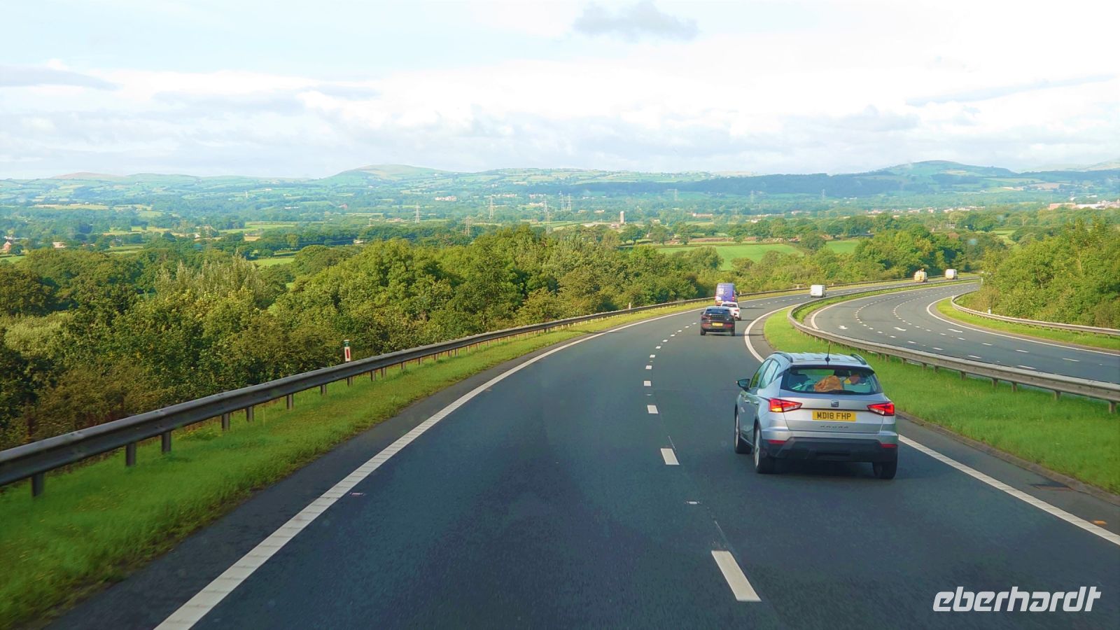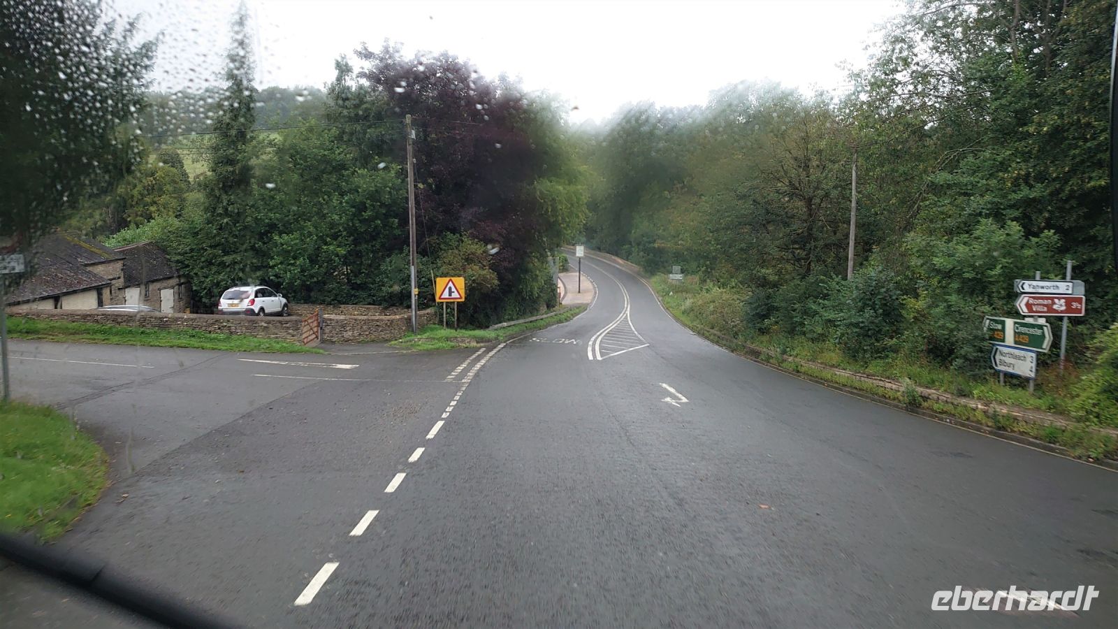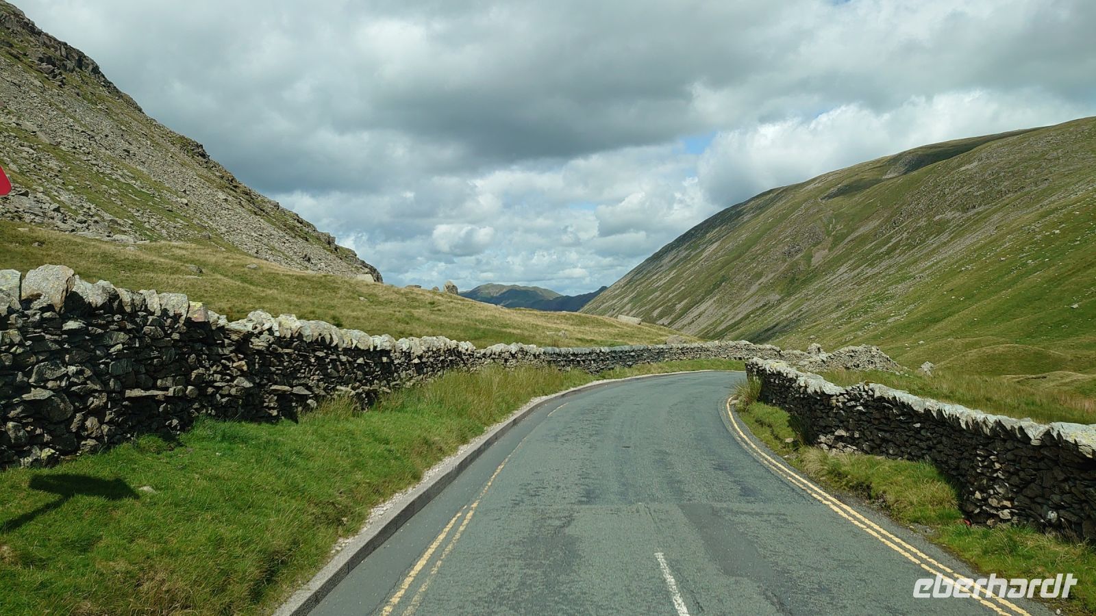Angekommen in Ambleside, nach einer kleinen Pause, wollten wir über den Kirkstone Pass in Richtung Schottland fahren. Der Kirkstone Pass ist mit einer Höhe von 454 m der höchste befahrbare Pass im Lake District. Erst ging es gemächlich los. Aber recht schnell wurden die Straße schmaler. Und es gab kaum Ausweichmöglichkeiten. Doch irgendwie schien es möglich, da uns auch Busse und LKW’s entgegenkamen. Doch an einer besonders engen Stelle mit viel Gegenverkehr kam es zu einem leichten Touchieren mit einem entgegenkommenden SUV. Außer leichten Schleifspuren ist nichts weiter passiert. Die Versicherungsdaten wurden ausgetauscht und es ging weiter. Die Fahrt ging durch wunderschöne Landschaften mit atemberaubenden Aussichten. Unser Fahrer Jörg hatte da weniger seine Freude. Sein ganzes fahrerische Können war gefragt. Jörg hat die Strecke mit Bravour gemeistert. Da eine Passfahrt Zeit kostet, gab’s Würstchen und Kaffee während der Fahrt im Bus.