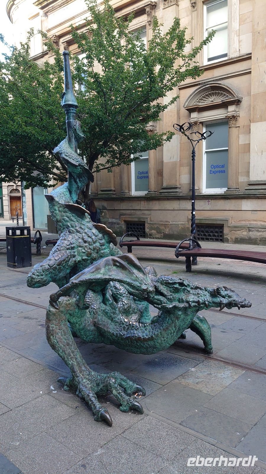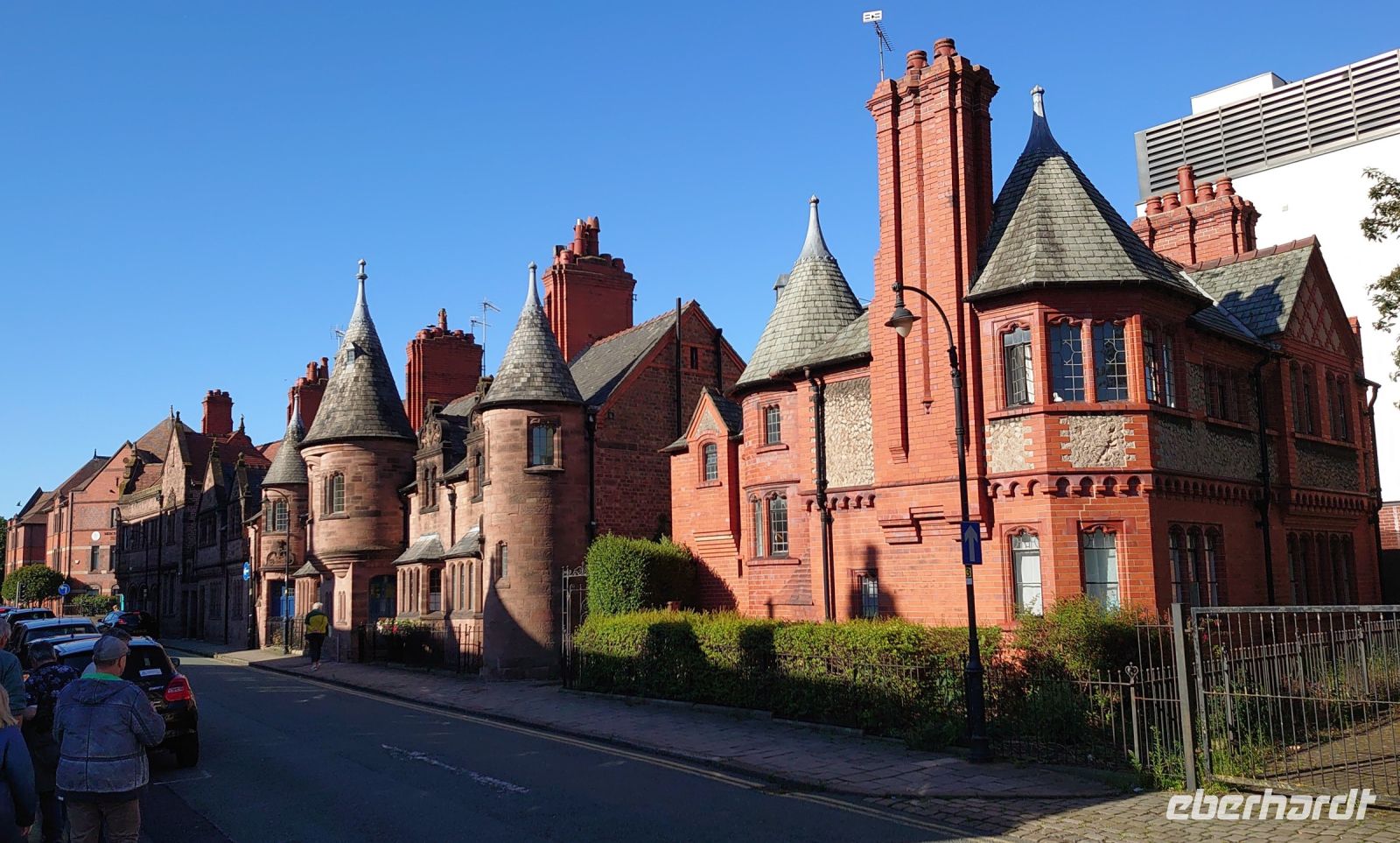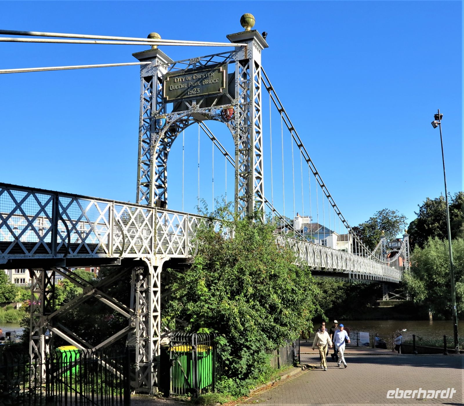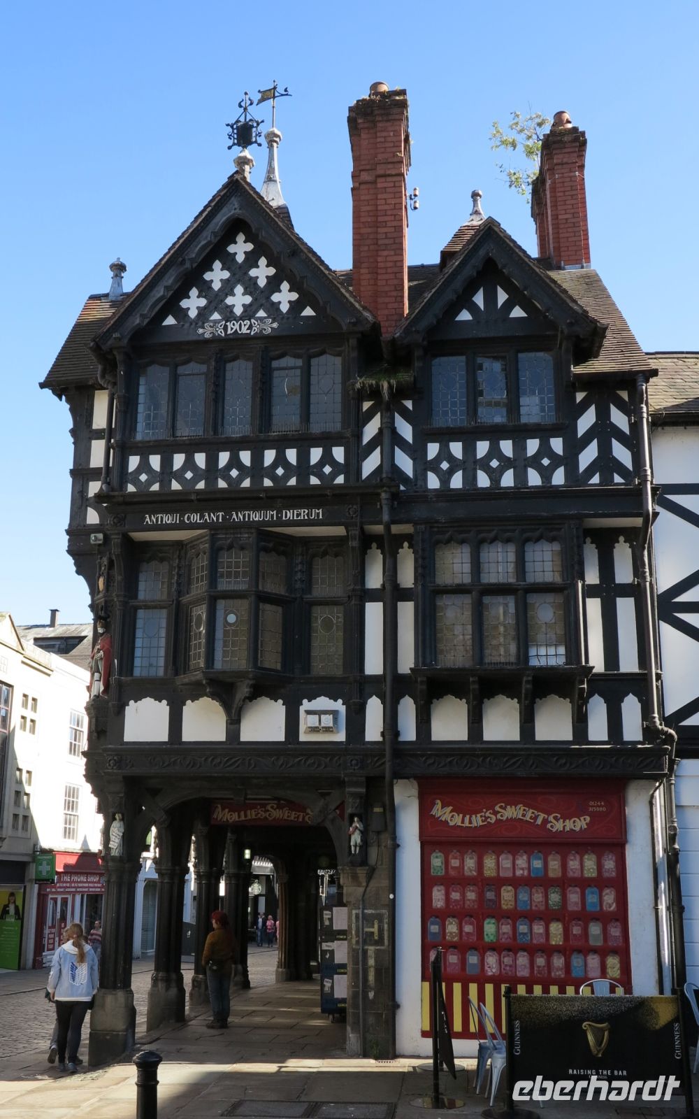 Frisch gestärkt mit Würstchen ging es weiter nach Chester, unserem letzten Ziel für den heutigen Tag. Chester ist eine Stadt am Fluss Dee an der Grenze zu Wales. In Chester hat uns unsere Stadtführerin Jan an unserem Hotel bereits erwartet. Zu Fuß ging es in Richtung Kanal weiter zum historischen Stadtkern. Highlights unserer Tour waren u.a. Durchgang durch die Stadtmauer zur Chester Cathedral, Chester Cross, die Rows (aus dem Mittelalter stammende, in Stockwerkshöhe gelegene Fachwerkkolonnaden), Eastgate Clock, die Reste des römischen Amphitheaters (wie so viele Städte in England geht auch Chester auf die Römer zurück), Parish Church of St. John the Baptist mit den Ruinen des South Eastern Chapel, Queens Park Hängebrücke, Grosvenor Park mit Open Air Theater, … Zu den architektonischen Besonderheiten der Ruinen des South Eastern Chapel gehört ein einzigartiges Objekt, ein mittelalterlicher Sarg. Dieser ist aus einem einzigen Stück Eiche gehauen worden und in der Ostwand des heute zerstörten Westturms der Kirche angebracht. In dieser seltsam anmutenden Dekoration ist ein Epitaph mit der Aufschrift „DUST TO DUST“ (Staub zu Staub) eingraviert – höchstwahrscheinlich aus der viktorianischen Zeit. Der Ursprung der Dekoration wird dem Rektor der Kirche im 19. Jahrhundert zugeschrieben, der sie hoch oben an der Wand anbringen ließ.