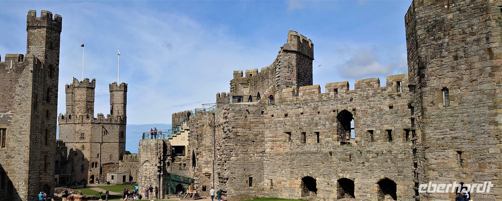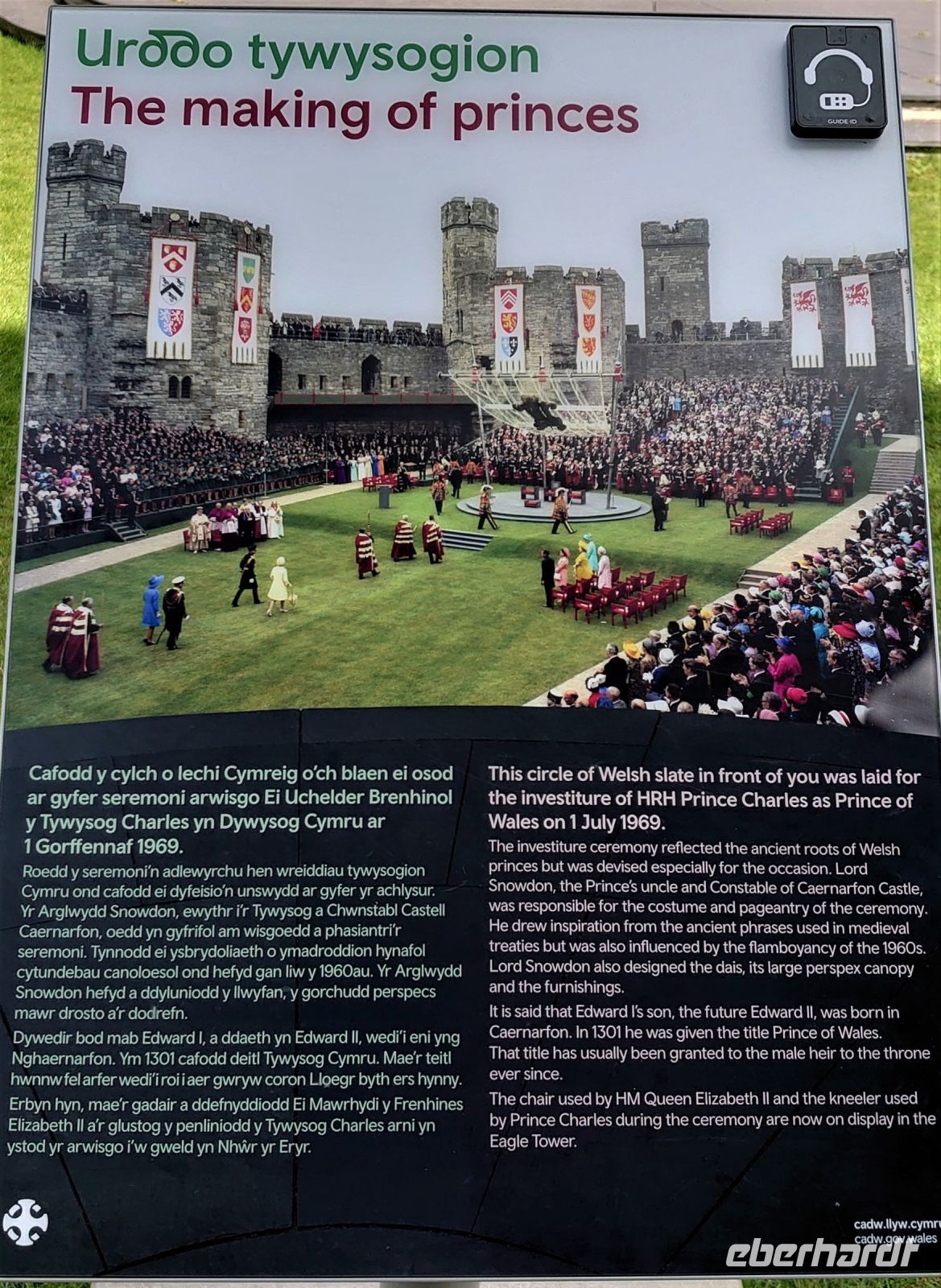 Nach unserem Stopp an der Bahnstation von Llanfair PG fuhren wir wieder auf das walisische Festland. Unser Ziel war das Caernarfon Castle. Als Militärbastion gegründet, wurde hier im Caernarfon Castle erstmals 1301 der Titel Prince of Wales verliehen. Seit dieser Zeit ist der Titel Prince of Wales der traditionelle Titel des Thronfolgers, in der Regel des ältesten lebenden Sohnes des jeweiligen britischen Monarchen. Der heutige König Charles III. wurde zum Prince of Wales am 26. Juli 1958 als Neunjähriger ernannt, eingesetzt am 1. Juli 1969 in Caernarfon Castle. Davon zeugt eine Übersichtstafel. Prince William, ältester Sohn von König Charles III. wurde am 08.09.2022 zum Prince of Wales ernannt.