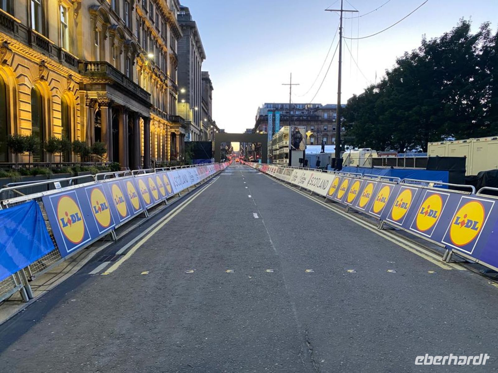 Weiter ging es nach Glasgow zu unserem heutigen Hotel. Wir wußten alle noch nicht, dass uns noch ein kleines Abenteuer bevorstand. Bis Glasgow verlief die Fahrt völlig normal. Gefühlte 400 m Luftlinie vor dem Hotel war die Straße zur Weiterfahrt gesperrt. Unsere Navis zeigten die Straßensperrung nicht an. Aber eine Umleitung war aus-geschildert. Okay. Die Umleitung hatte es aber kilometermäßig und zeitlich ganz schön in sich. Fast eine dreiviertel Stunde hat uns dieser Umweg gekostet. Und einen Zeitpuffer hatten wir heute Abend leider nicht, da ein typisches schottisches Menü in einem Pub noch auf der Tagesordnung stand. Irgendwie sind wir dann mit dem Bus zu Hotel gekommen. Dort haben wir den Grund für die Straßensperrungen erfahren. In Glasgow fand vom 03. – 13.08.2023 die Rad-Weltmeisterschaft statt. Klasse! Und wir mit dem Bus mit zentrumsnahem Hotel mittendrin. Das Gepäckausladen ging, allerdings durfte unser Bus nicht am Hotel stehenbleiben. Jörg und ich haben glücklicherweise ein paar Straßen weiter einen geeigneten, abschließbaren Parkplatz gefunden. Glück gehört halt einfach dazu. Aber es war am Abend schon klar, dass am anderen Morgen der Bus nicht bis direkt vor unser Hotel fahren konnte. Da hieß für unsere Gäste vor dem Gepäckladen „I’m Walking“ (so ca. 100 m). Da schätzt man doch die Erfindung der Rollkoffer, oder?