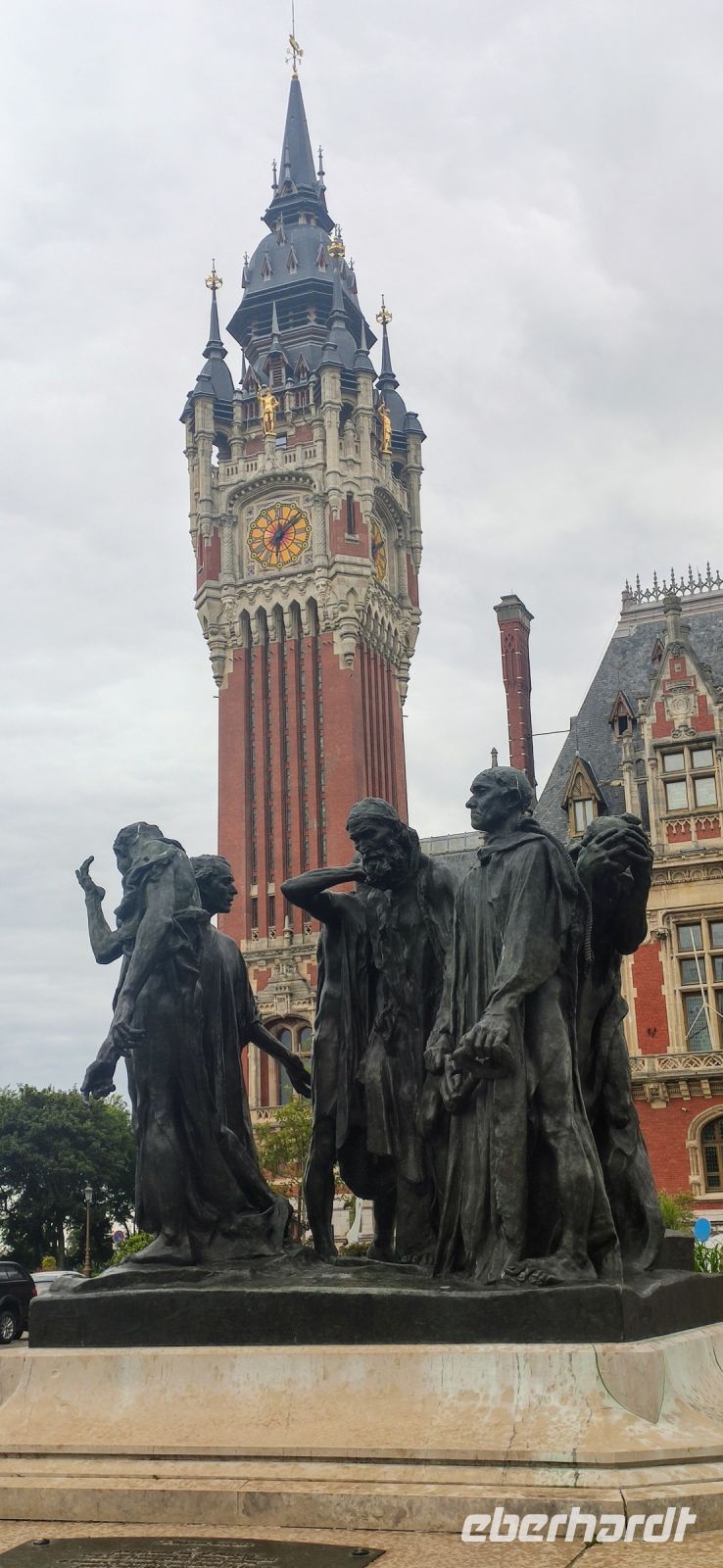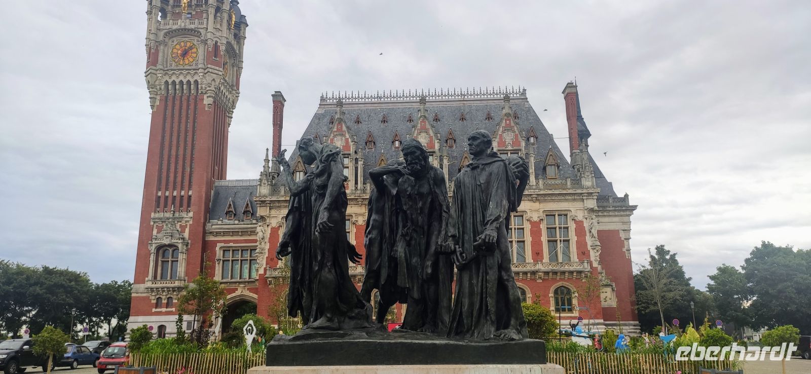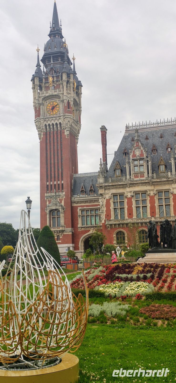 Bei der Ankunft in Calais nutzten wir die herausgefahrene Zeit für einen Kurzbesuch des Zentrums von Calais. Vorbei am Theater ging es durch die Haupteinkaufsstraße zum Rathaus – hier unternahmen wir einen Fotostopp und bewunderten die wunderschön gestalteten Blumenrabatten und das berühmte Denkmal der Sechs Bürger des Widerstands von Calais, geschaffen von Rudin.