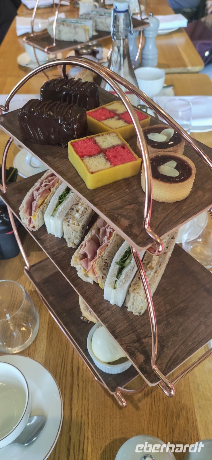Das Gasthaus The Bear of Rodborough war unser Ziel. Aussichtsreich gelegen auf einem der Hügel der Cotswolds konnten wir hier nicht nur den schönen Rundblick genießen, sondern auch einen Afternoon Tea mit verschiedenen Leckereien. Dabei durften natürlich Scones mit Clotted Cream und Erdbeerkonfitüre nicht fehlen.