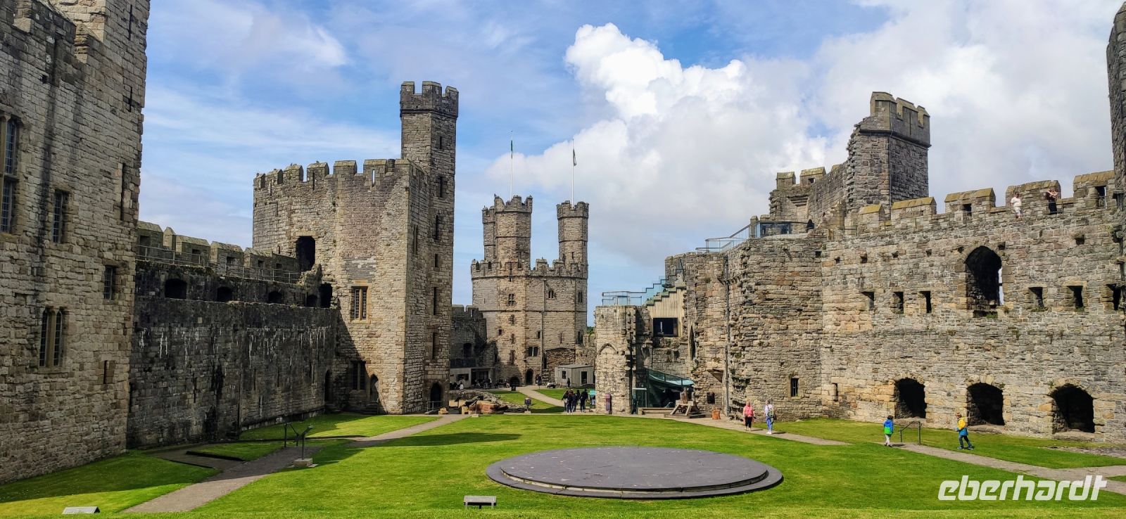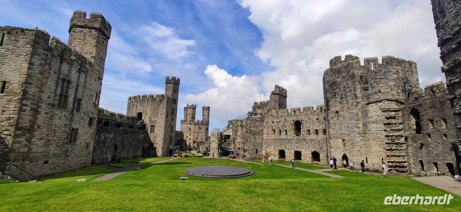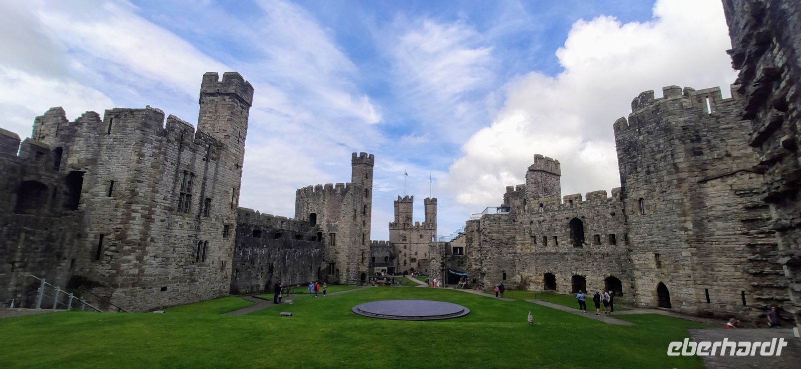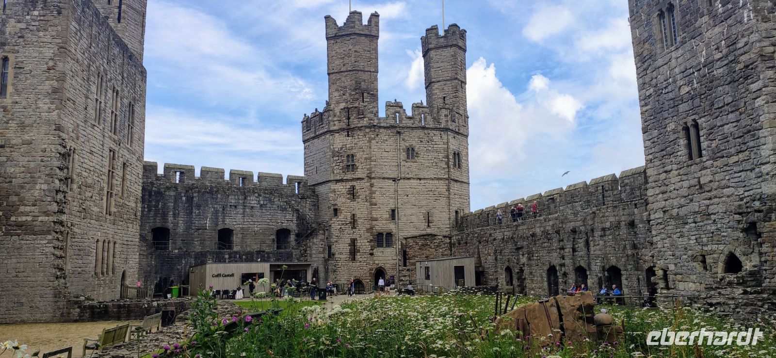Über die Britannia Bridge fahren wir anschließend wieder zurück aufs Festland und nach Caernarfon. Gemeinsam gehen wir durch das Stadttor hinein in die Stadt und hinüber zu den hohen Mauern der mächtigen Burg. Wir besichtigen diese gewaltige Anlage, mit ihren Ausstellungen in den verschiedenen Türmen und Gebäuden. Die schwarzen, rund angeordnete Steinplatten in der Mitte des Rasens im Schlosshof war die Bühne für die Krönung von Charles zum Prince of Wales im Jahre 1969. Er ist jetzt König und sein Sohn William Prince of Wales, muss aber auch noch hier gekrönt werden.